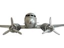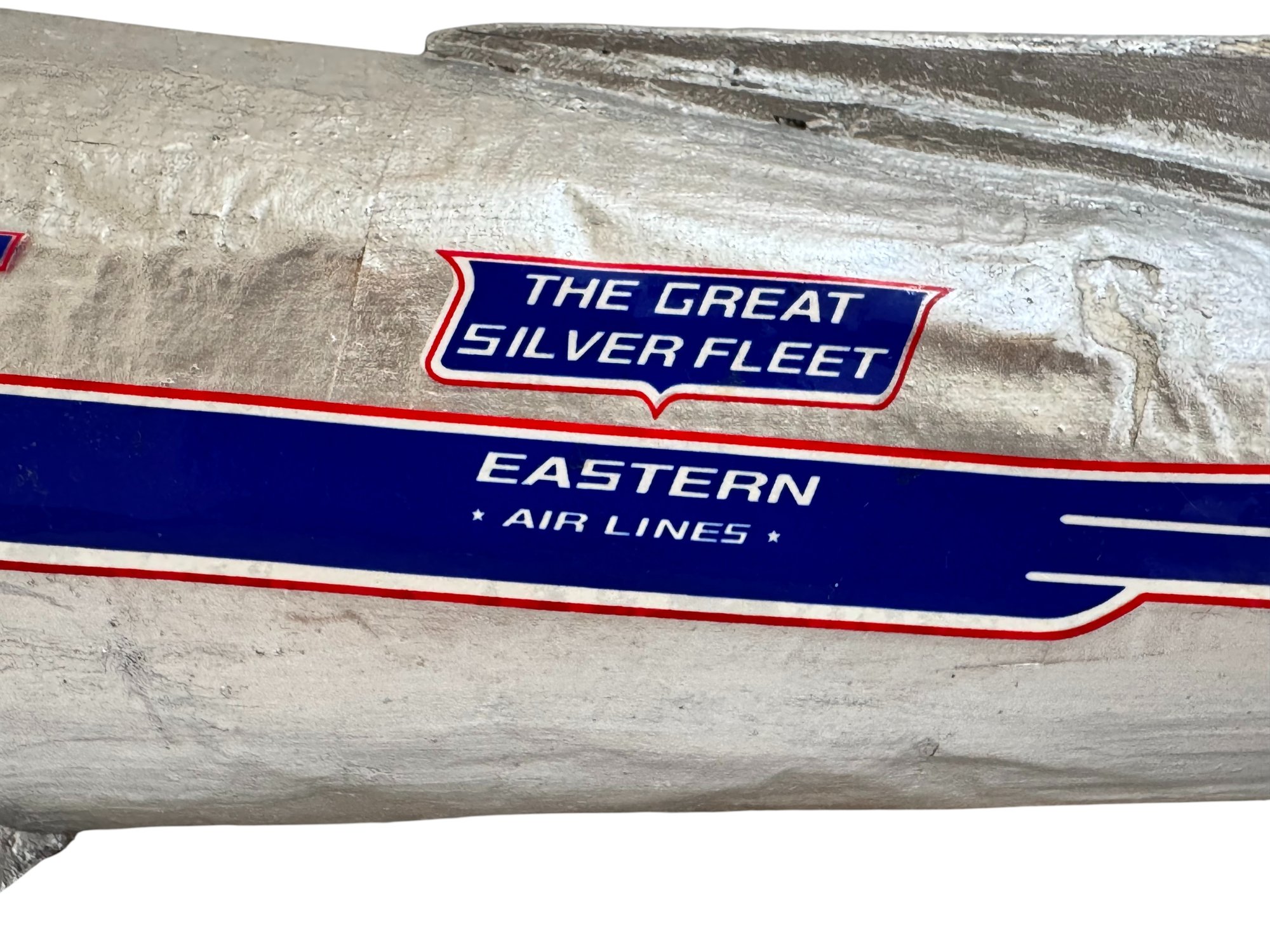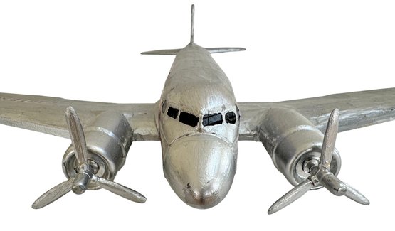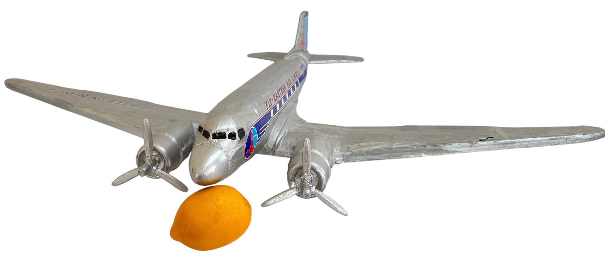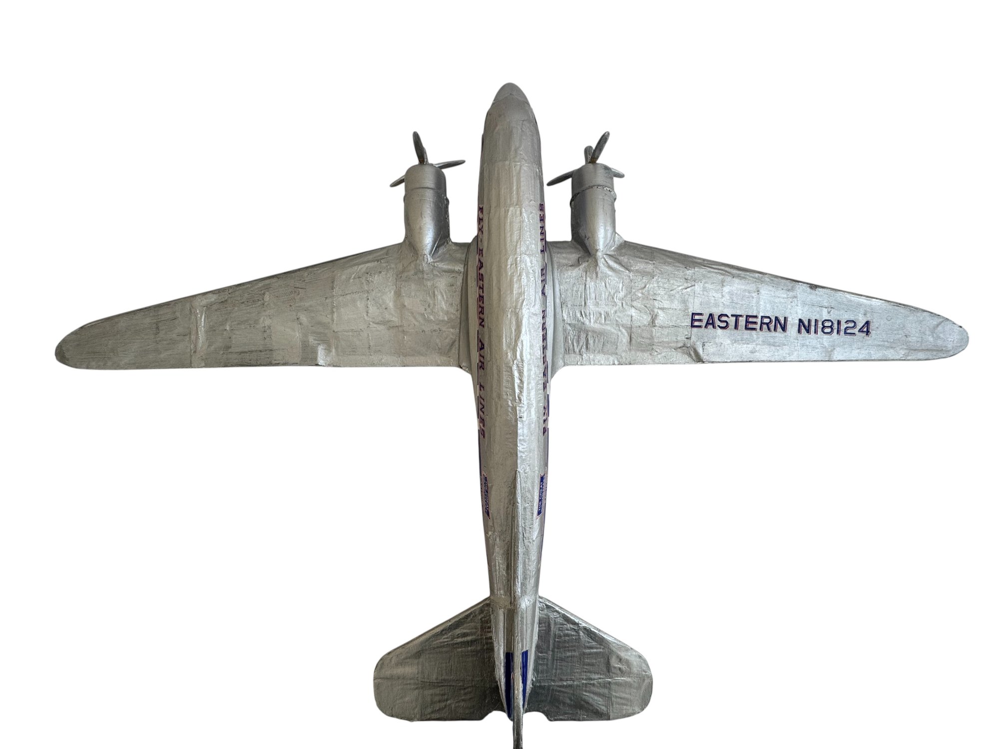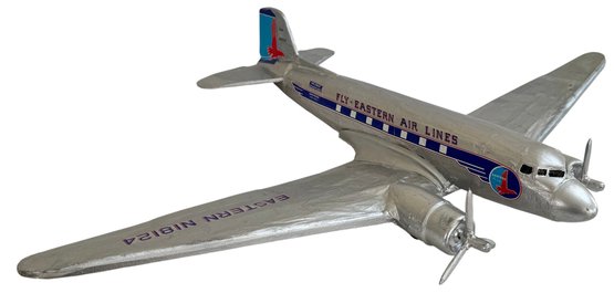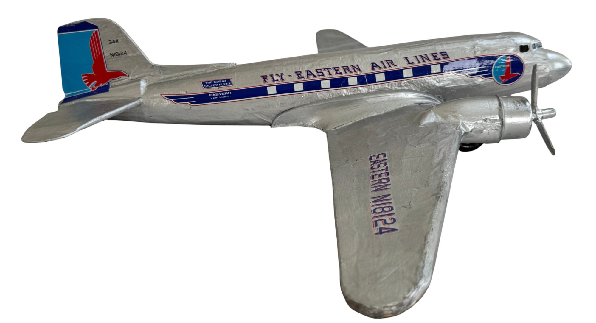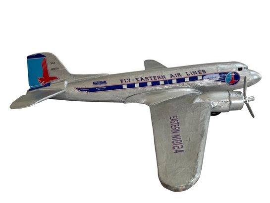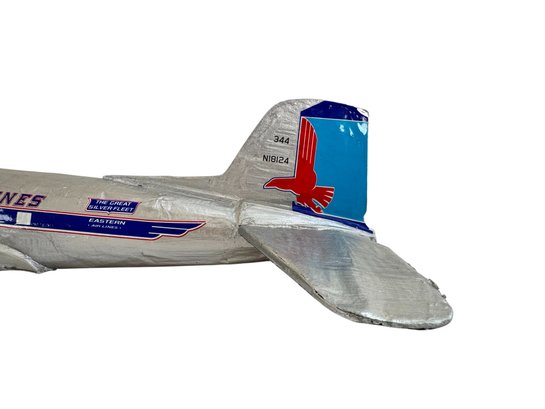 A striking and nostalgic handcrafted model airplane, beautifully styled in the classic Eastern Air Lines “Fly Eastern Air Lines” silver livery, complete with twin propellers and detailed fuselage markings including N18124. This substantial decorative model captures the romance of mid-century commercial aviation, finished in hand-applied silver paint with blue and red graphics, Eastern’s iconic falcon logo, and period-style striping along the fuselage.
