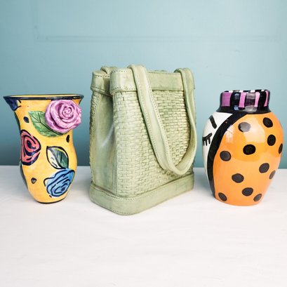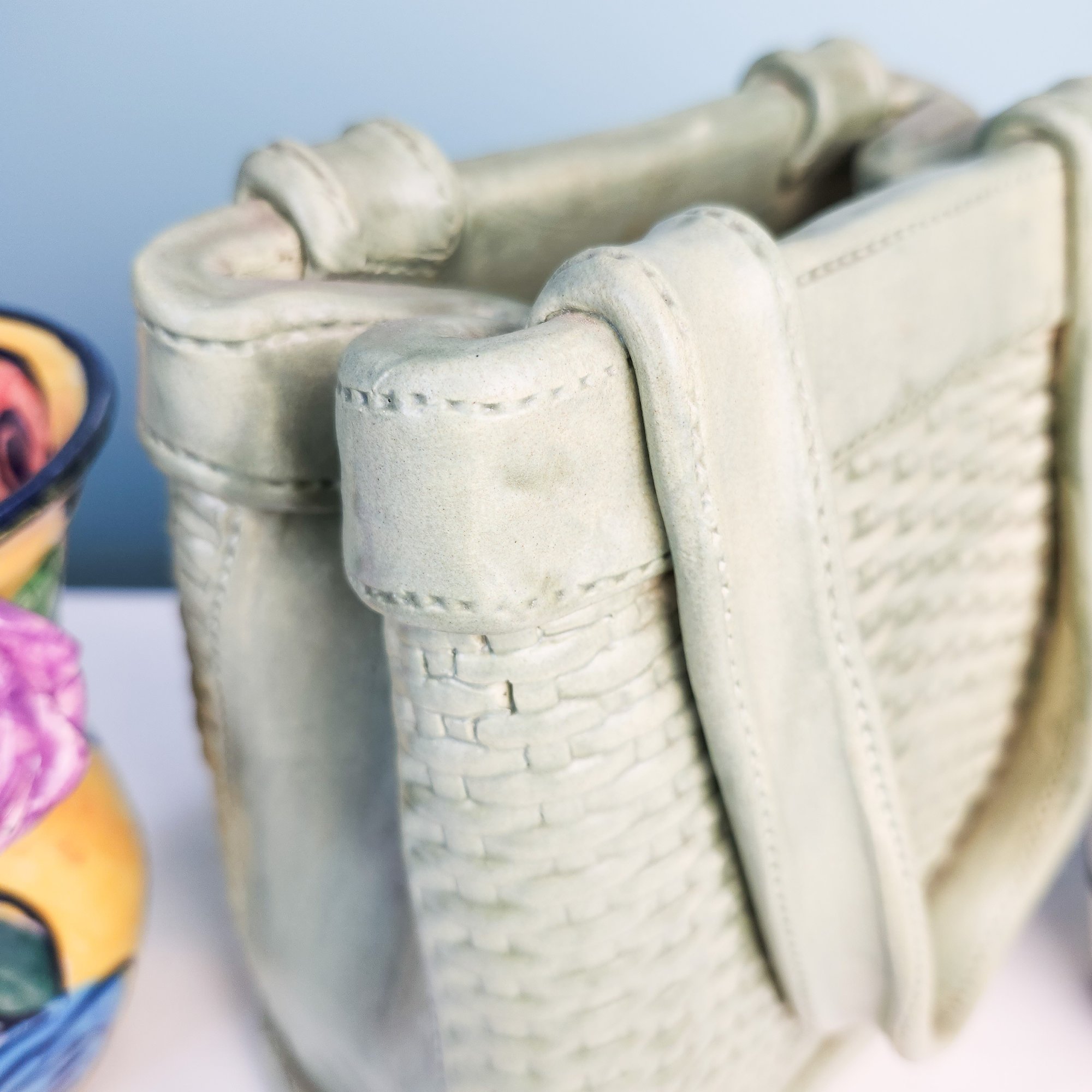 Measurements are of green woven pottery handbag.