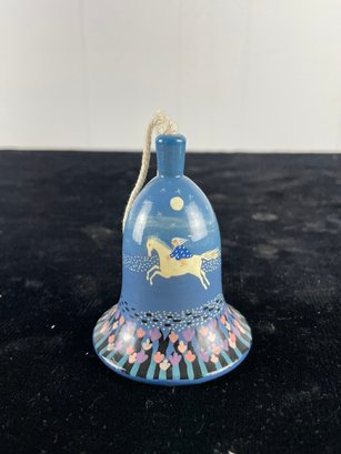 Gold painted interior. White string attached. Blue exterior, horse design painted. No damages seen in images. See photos for more conditions and sizing.