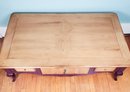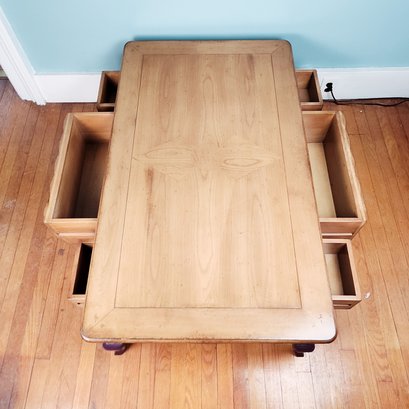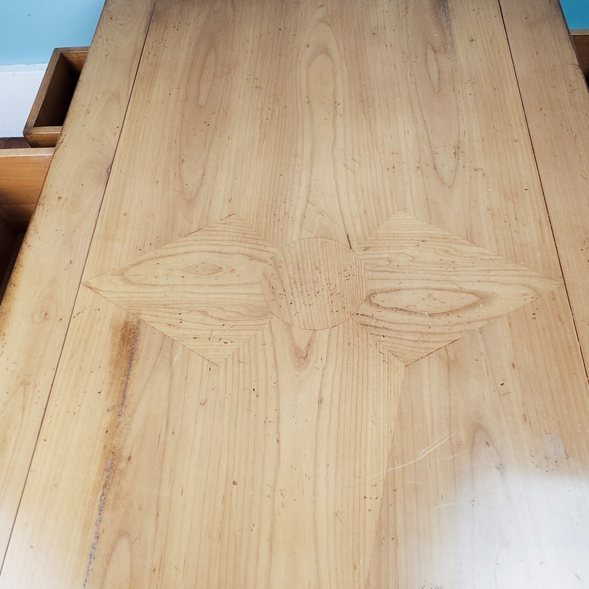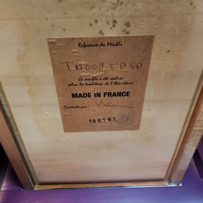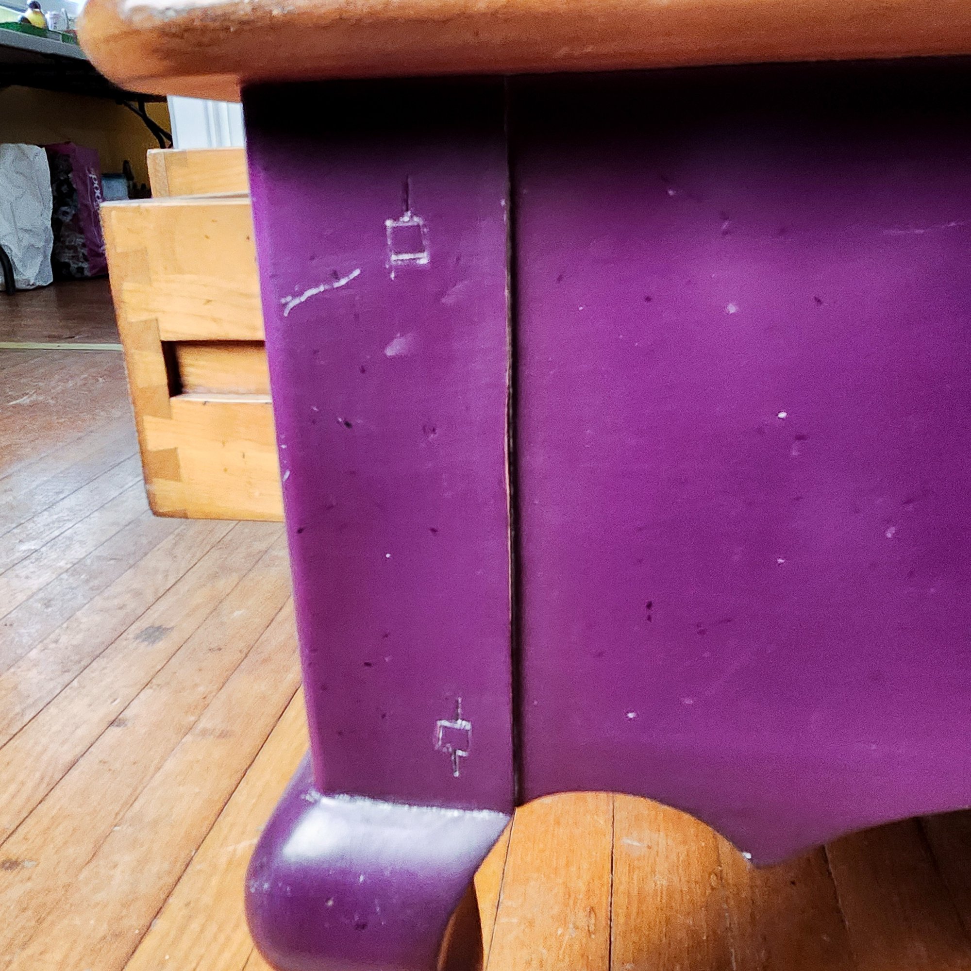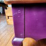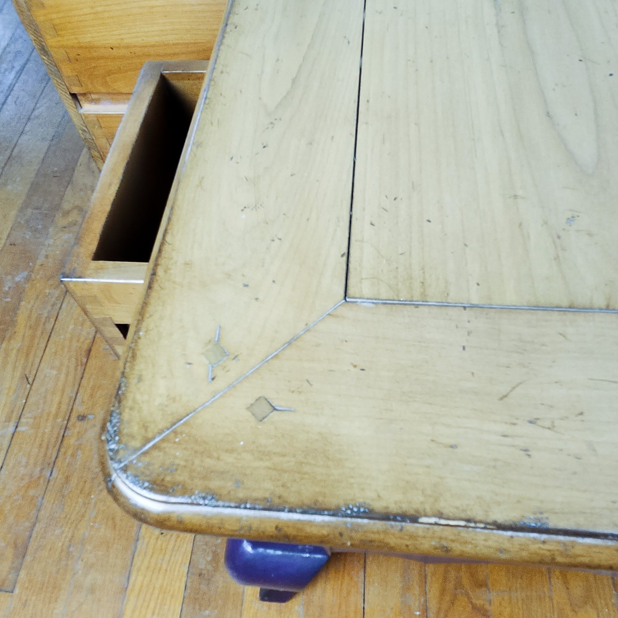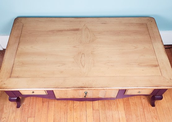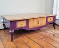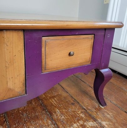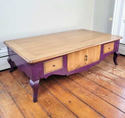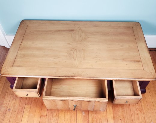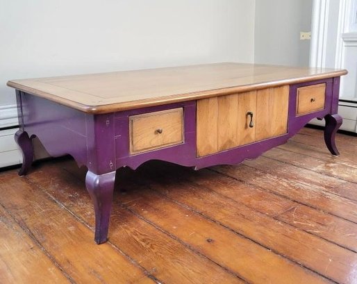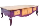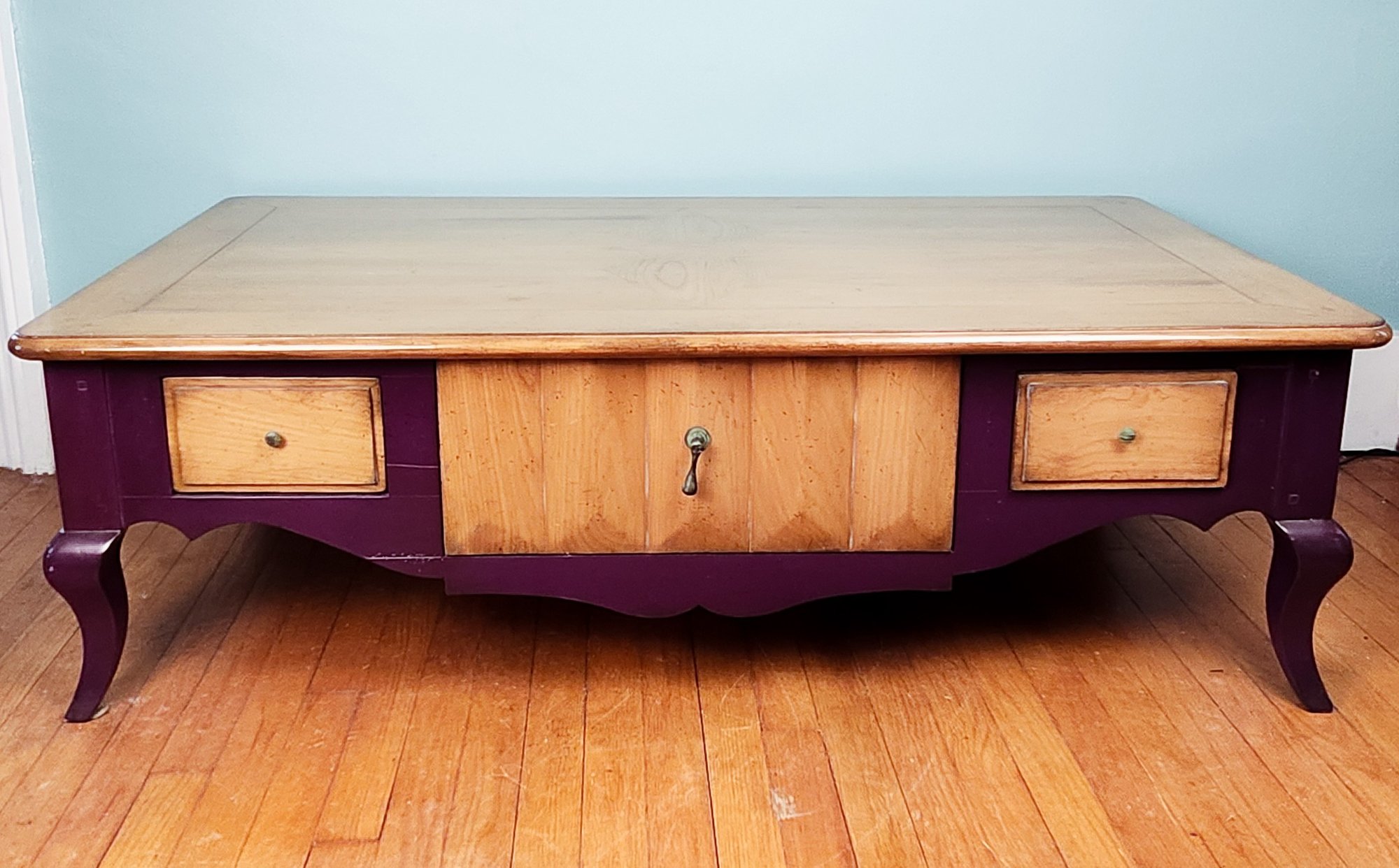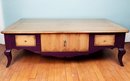 Great French coffee table with six drawers (three on each side), plum purple base, and inlaid wood top.