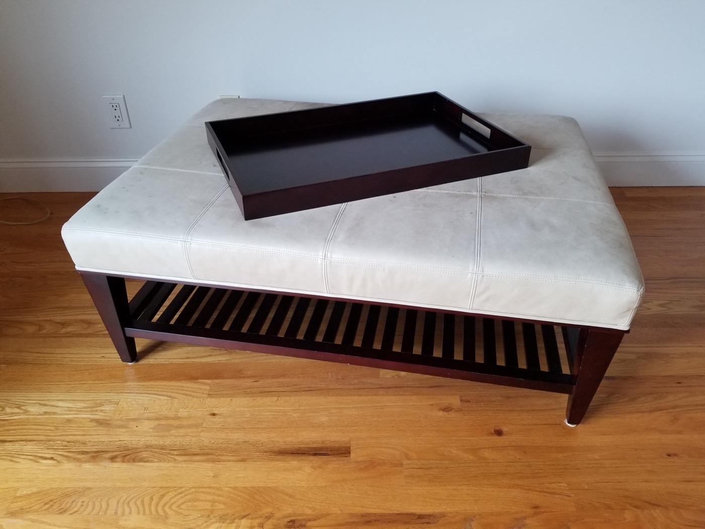 Handsome dark wood upholstered cushioned bench with slatted shelf and accompanying hardwood tray. Some fading to leather.