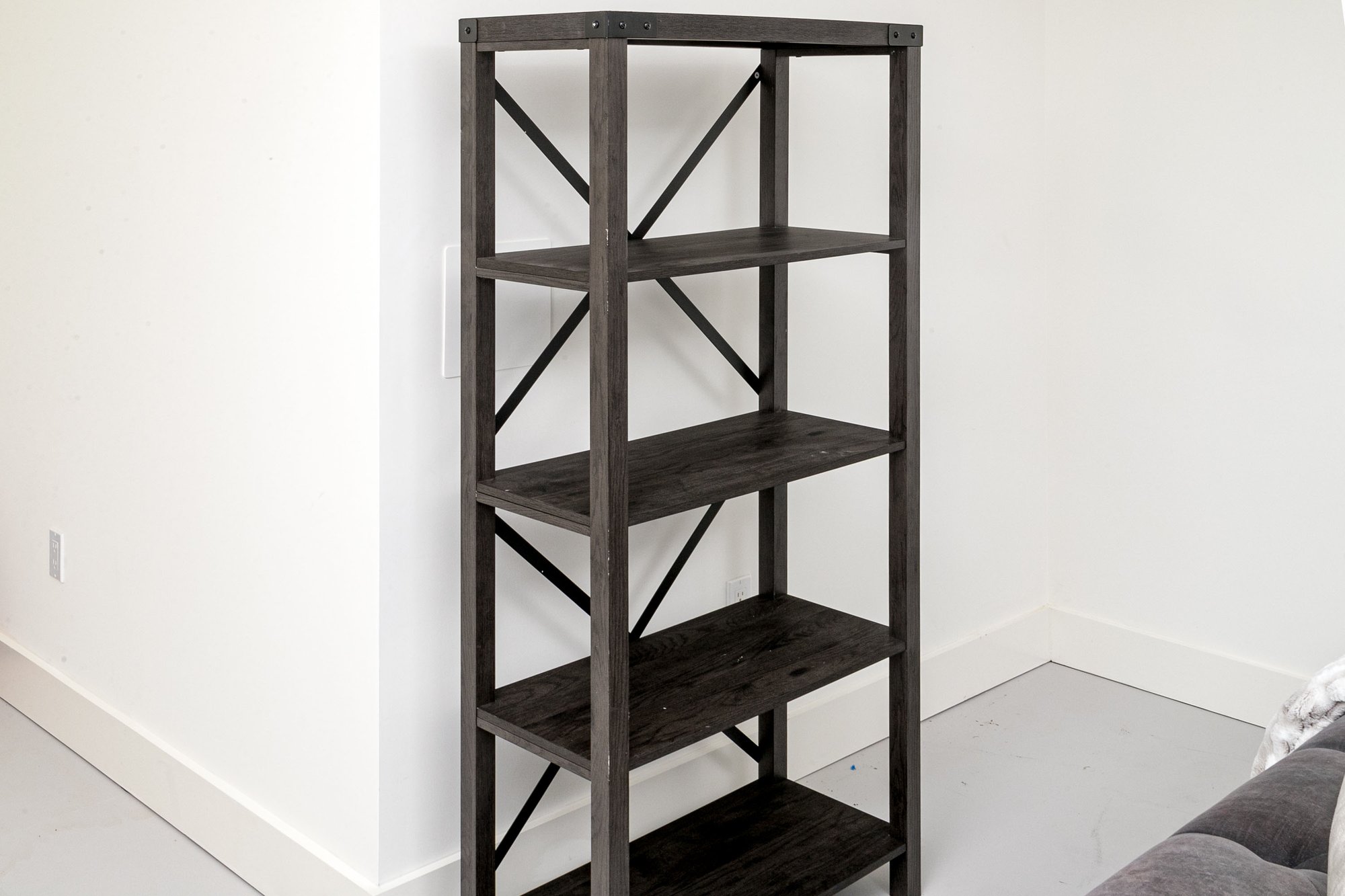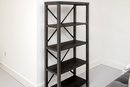 On four squared legs with four shelves and top. With black metal mounts including X form stretcher supports between shelves.