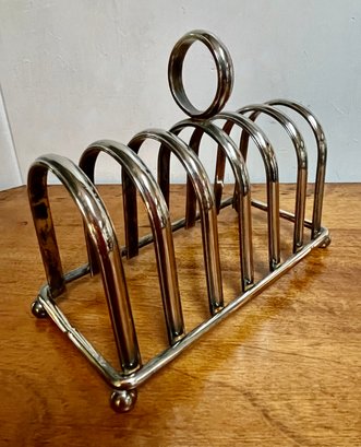 A good looking sturdy silver plate toast rack. It can up to 6 slices of toast. A very good simple design. It's in very good condition and measures 6" long by 3" wide by 4 3/4" high.
