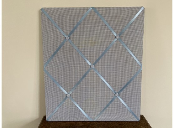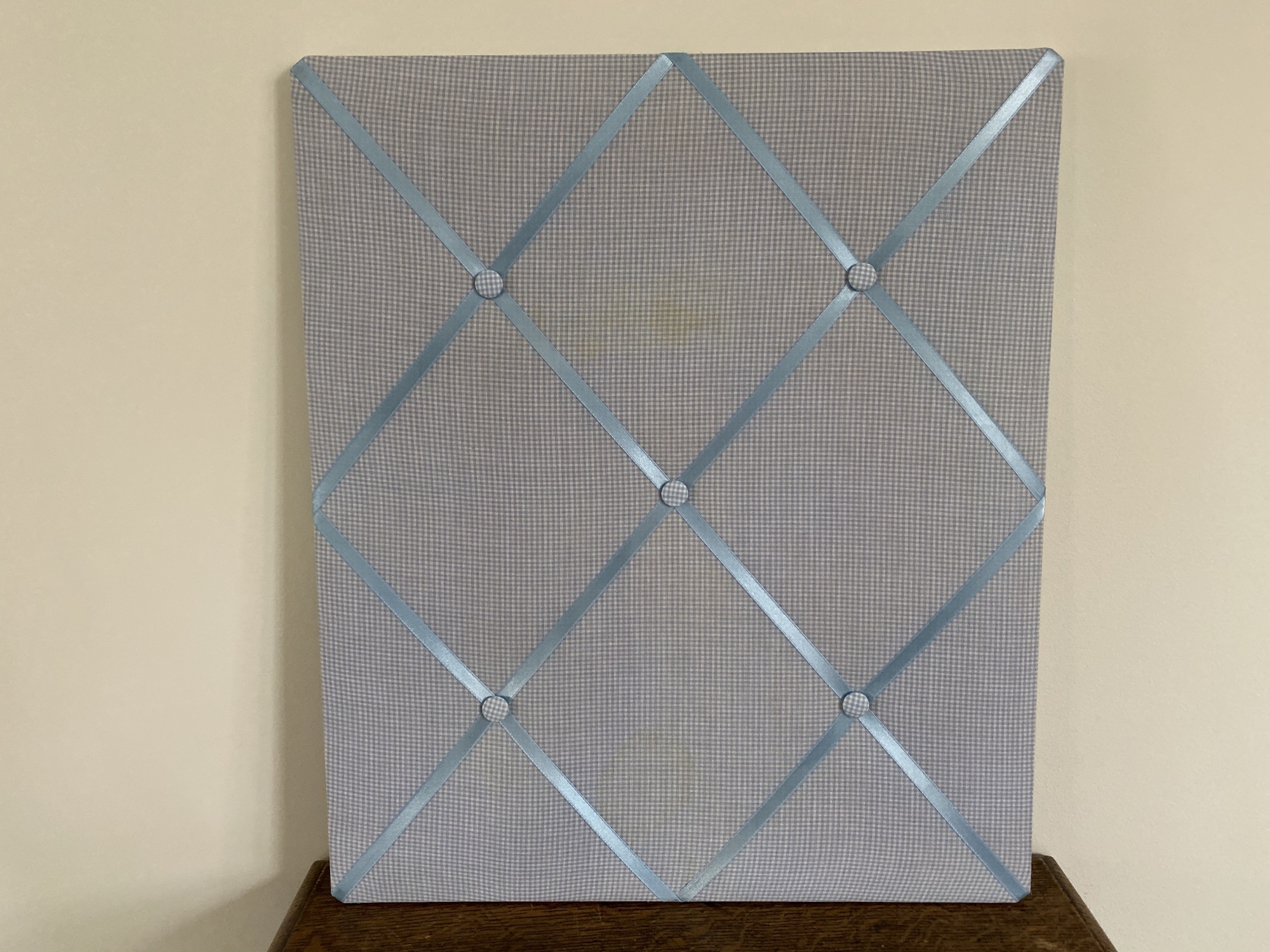 Place photos and other memorabilia under the fabric to create a collage of memories. Light blue gingham. Some stains, as shown.