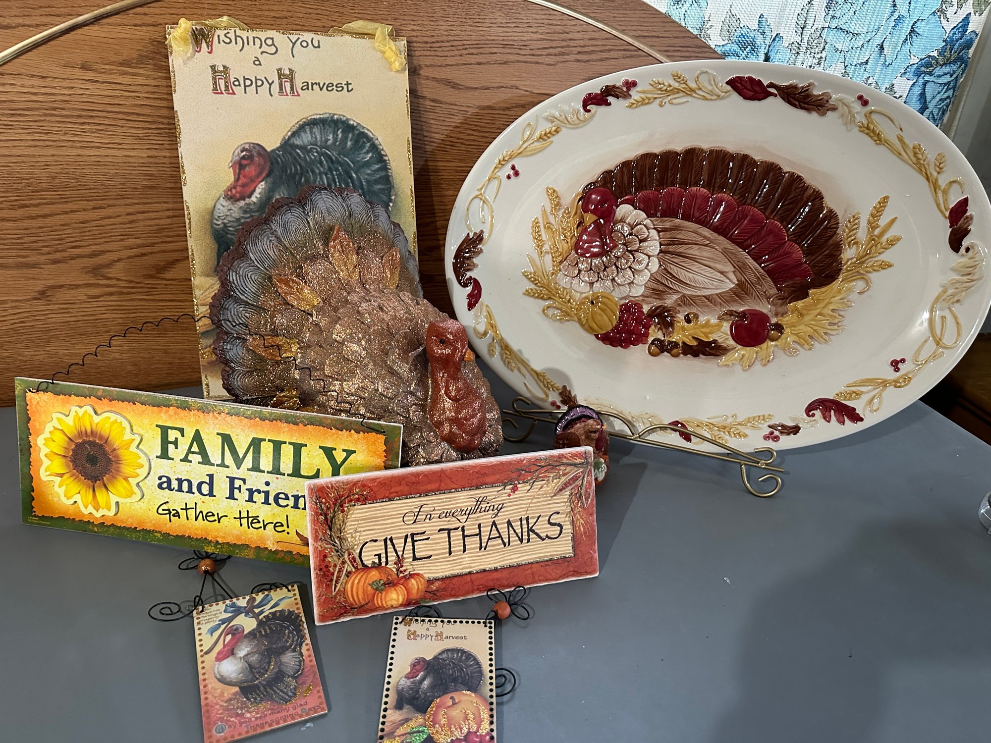 This lot is great for eating and decorating: First we have a large 20" Grasslands road, then a great turkey centerpiece and 5 Thanksgiving signs.