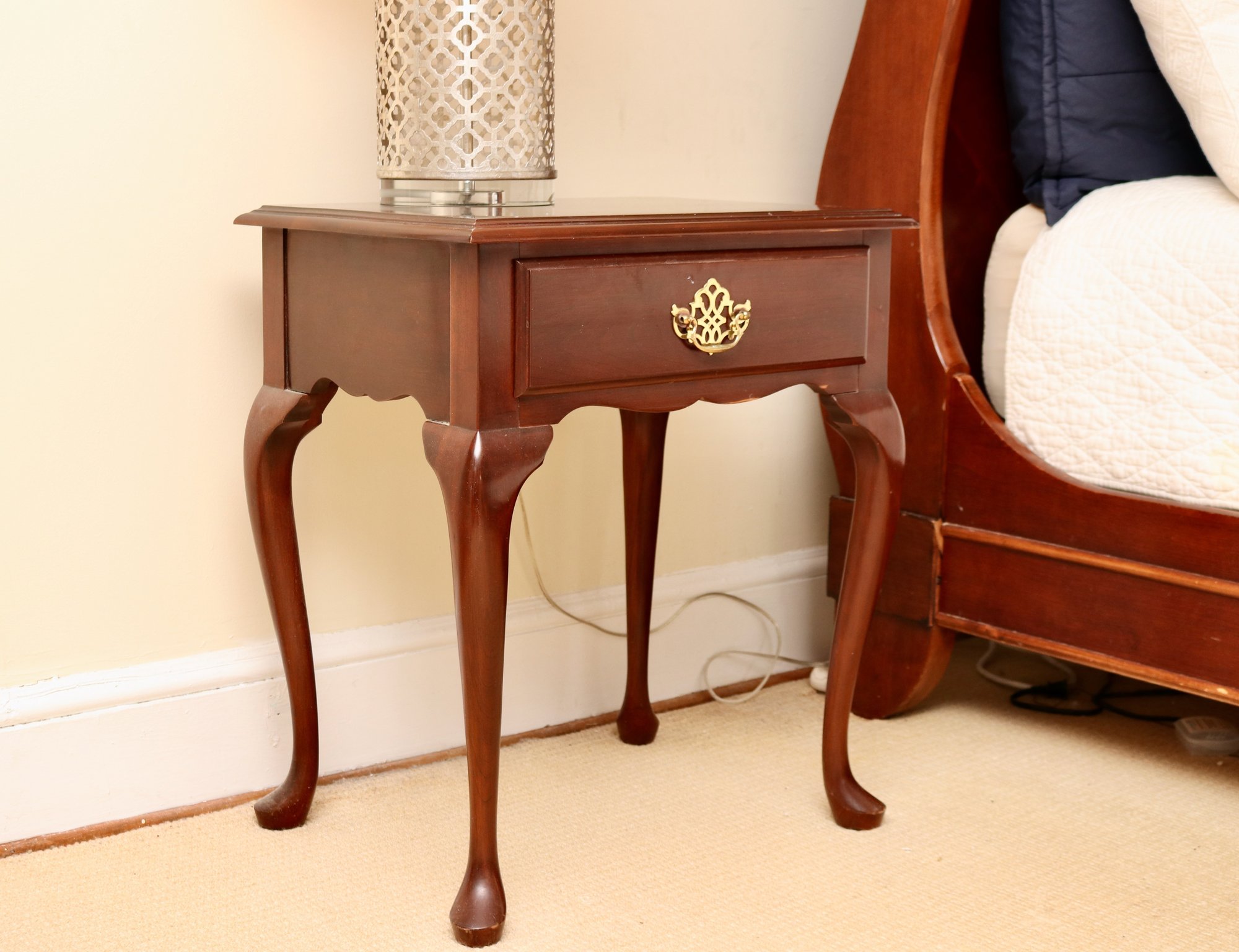 Elegant traditional mahogany bedside table featuring refined Queen Anne styling. The case is fitted with a single drawer adorned with a classic brass bail pull and shaped apron below. Gracefully cabriole legs terminate in pad feet, lending the piece a light, sophisticated profile well suited to traditional or Federal-inspired interiors.