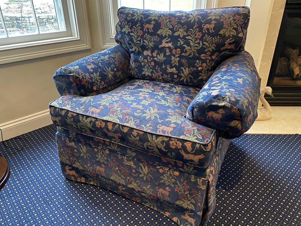 Upholstered in beautiful navy tapestry style fabric depicting dog and floral scene. Fabric shows heavy sun fading in some areas but structurally in good condition.
