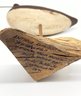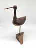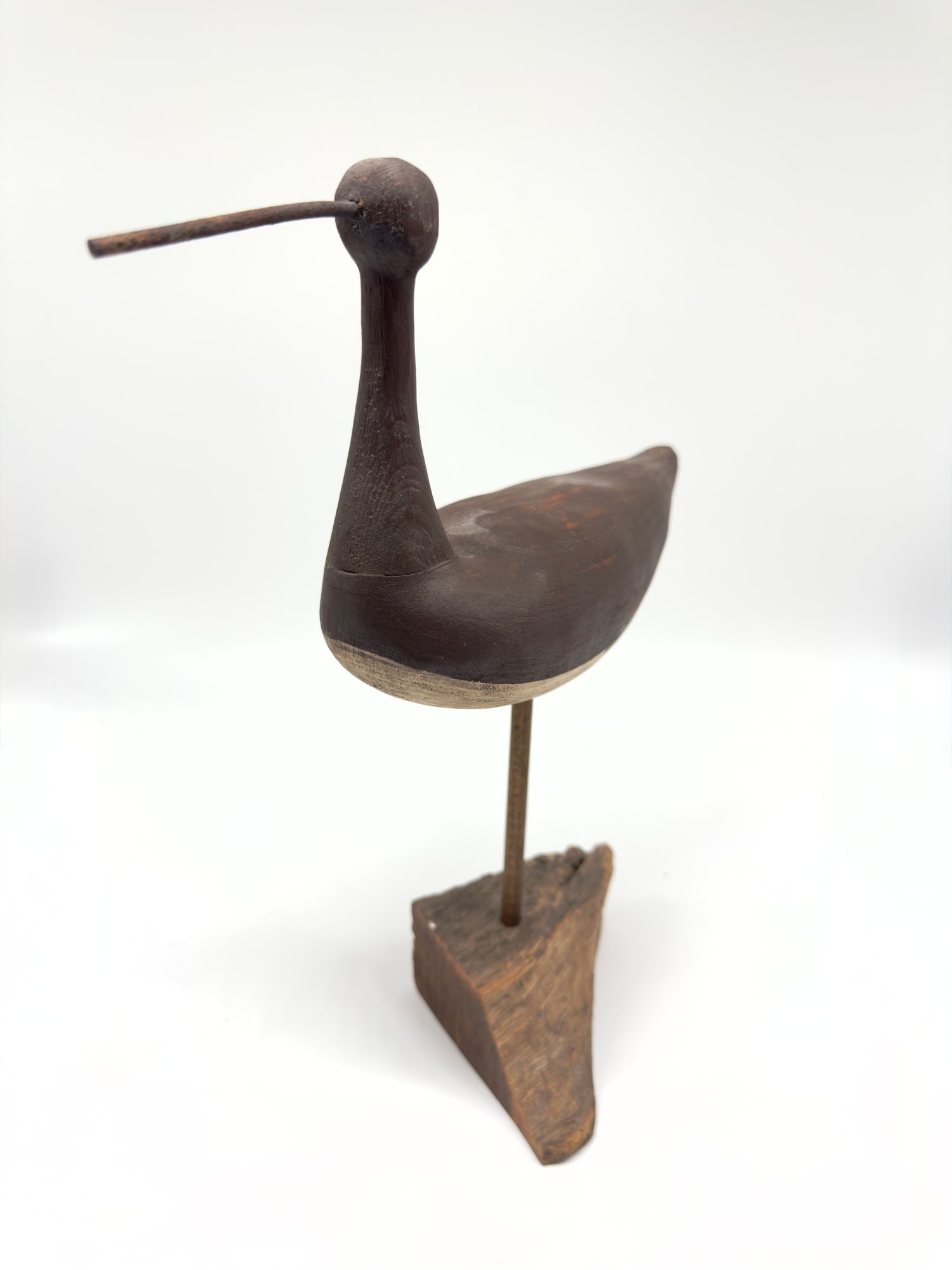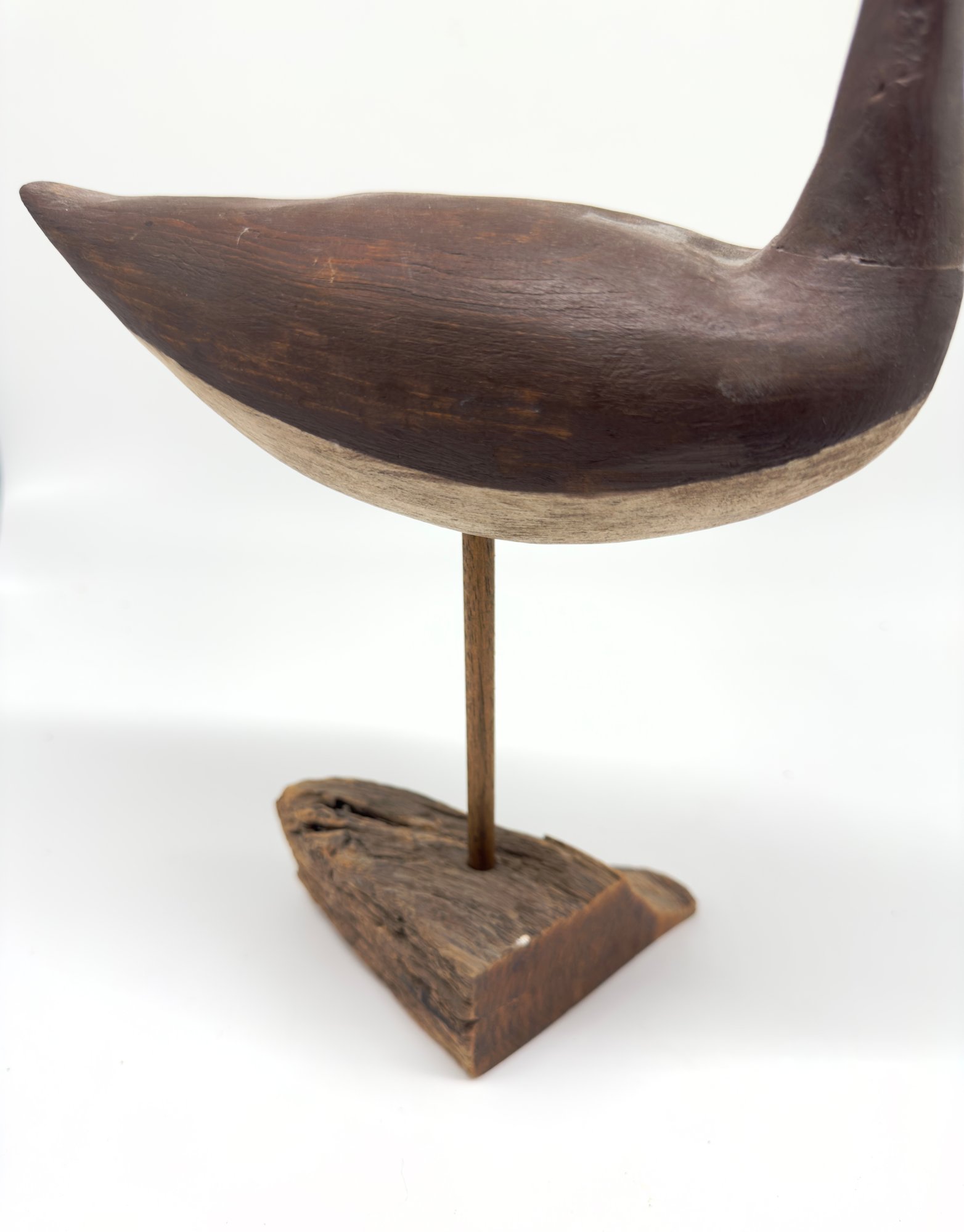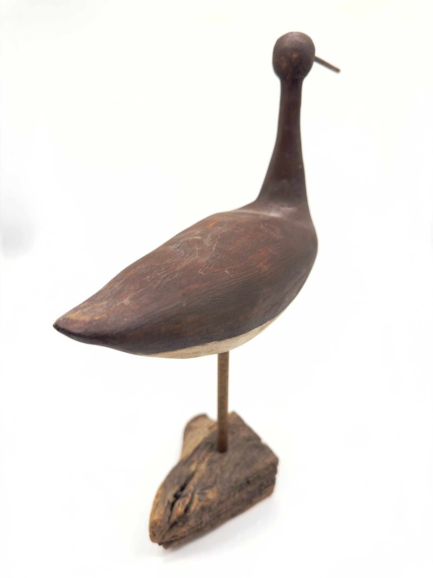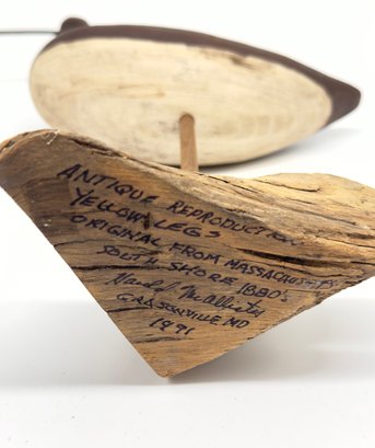 This is a hand-carved wooden sculpture of a yellowlegs shorebird. The text on the base indicates it is an "antique reproduction" of an original from the South Shore of Massachusetts from the 1880s, and was carved by Hardy McAllister in Grasonville, MD in 1991.