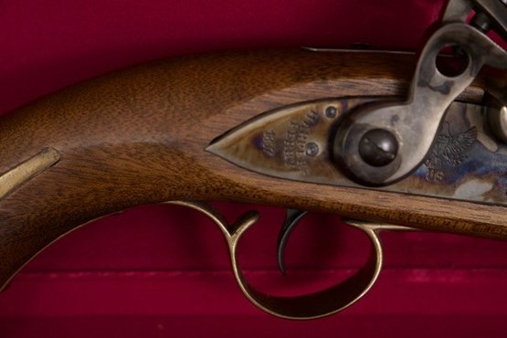Harpers Ferry Model 1807 flintlock pistol, which was notably the first pistol that the United States national armory manufactured. The vintage reproduction features notable walnut, half-stock design with brass barrel and trigger guard. Marked Harpers Ferry with model 1807 to plate. The pistol is presented in a red velvet lined wooden presentation and storage case.