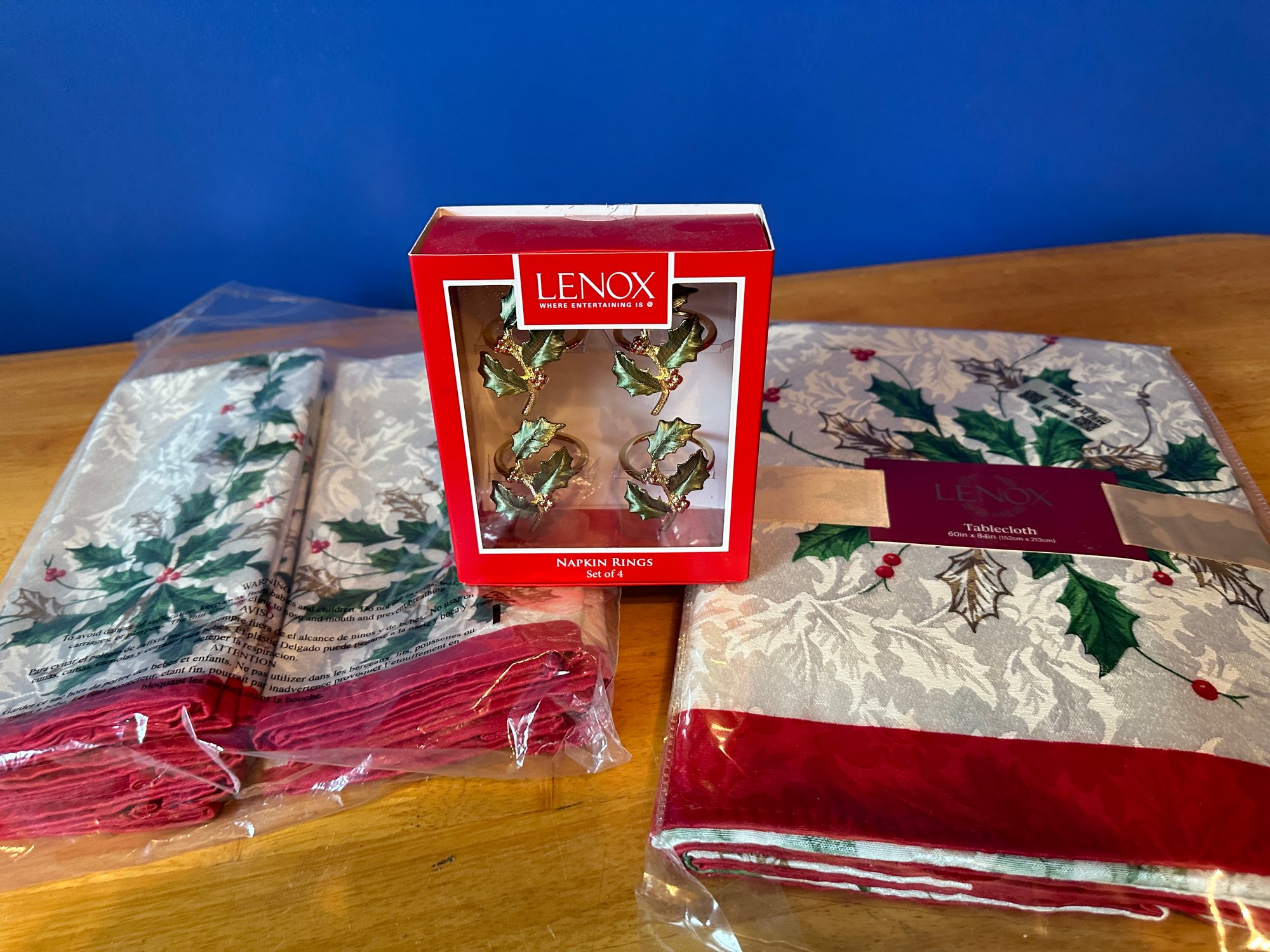 Dress your lenox china with these beautiful new Lenox tablecloth 60x 84 and 8 Lenox napkins both in packages. with 4 new lenox napkin rings.