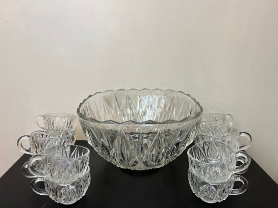Beautiful vintage midcentury modern clear glass punchbowl by Hazel Atlas with twelve matching punch cups in the classic Williamsport pattern.