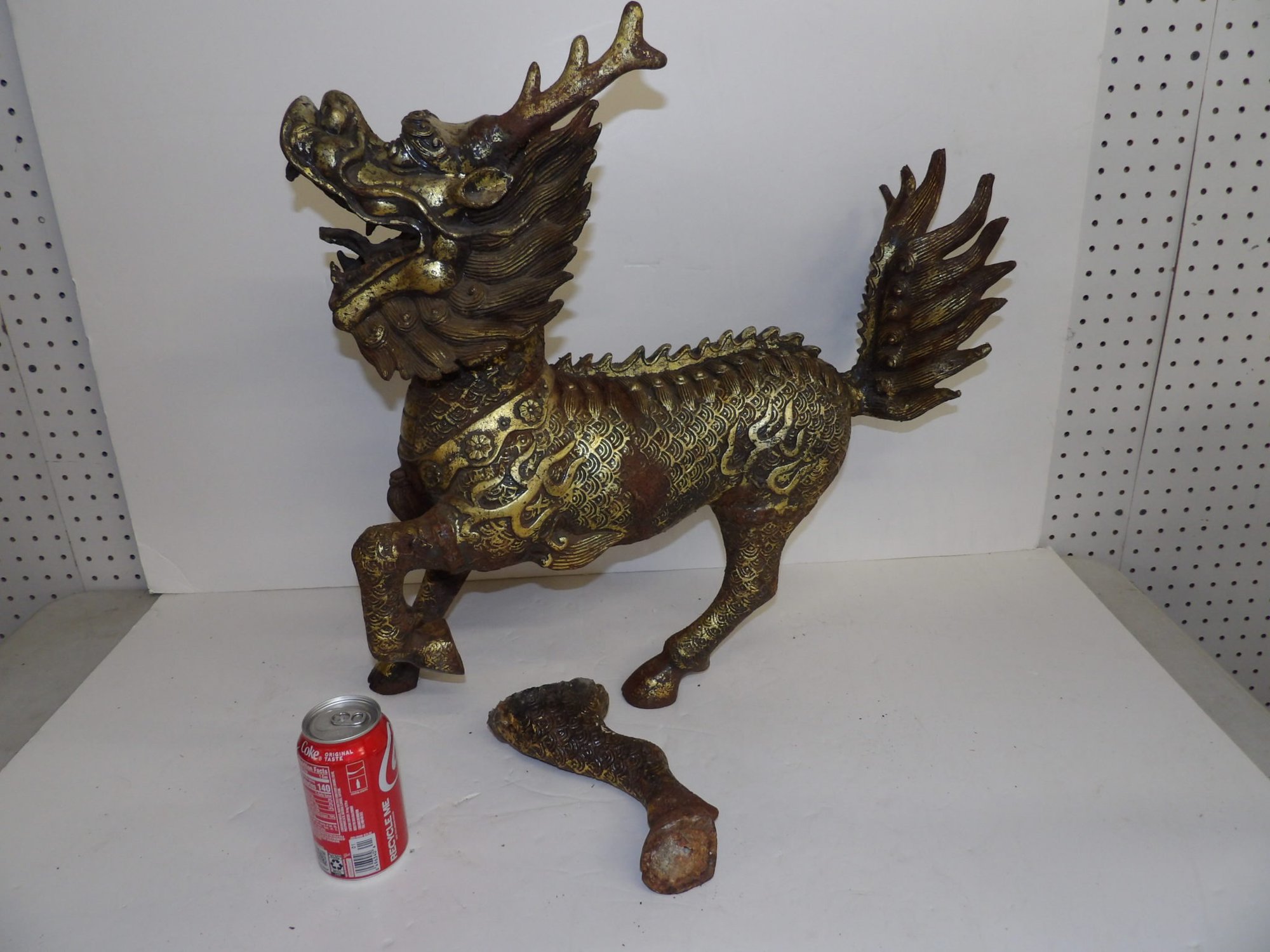 Heavy Cast Iron Dragon With Gilt Decoration, Needs Leg Reattached Chinese 1980's