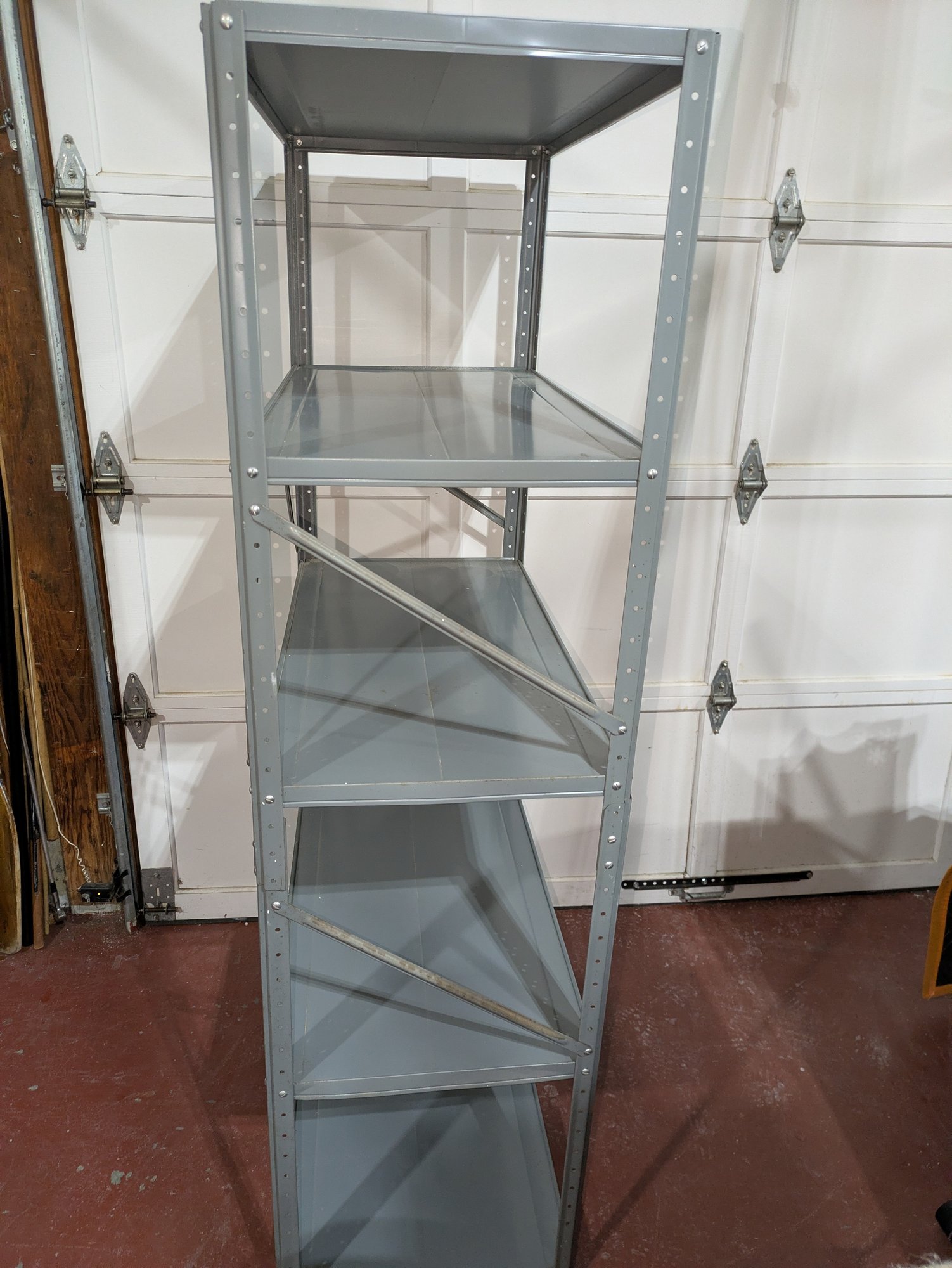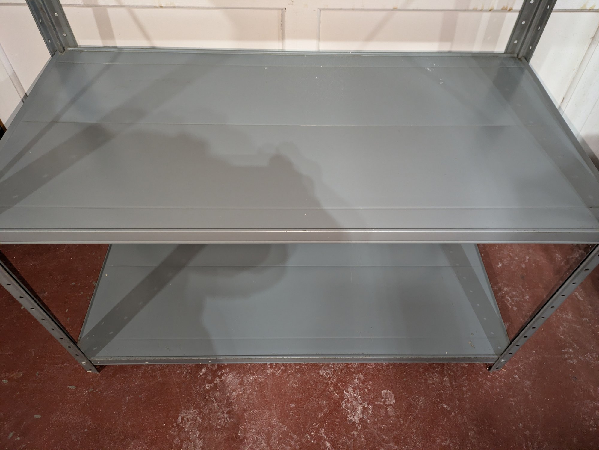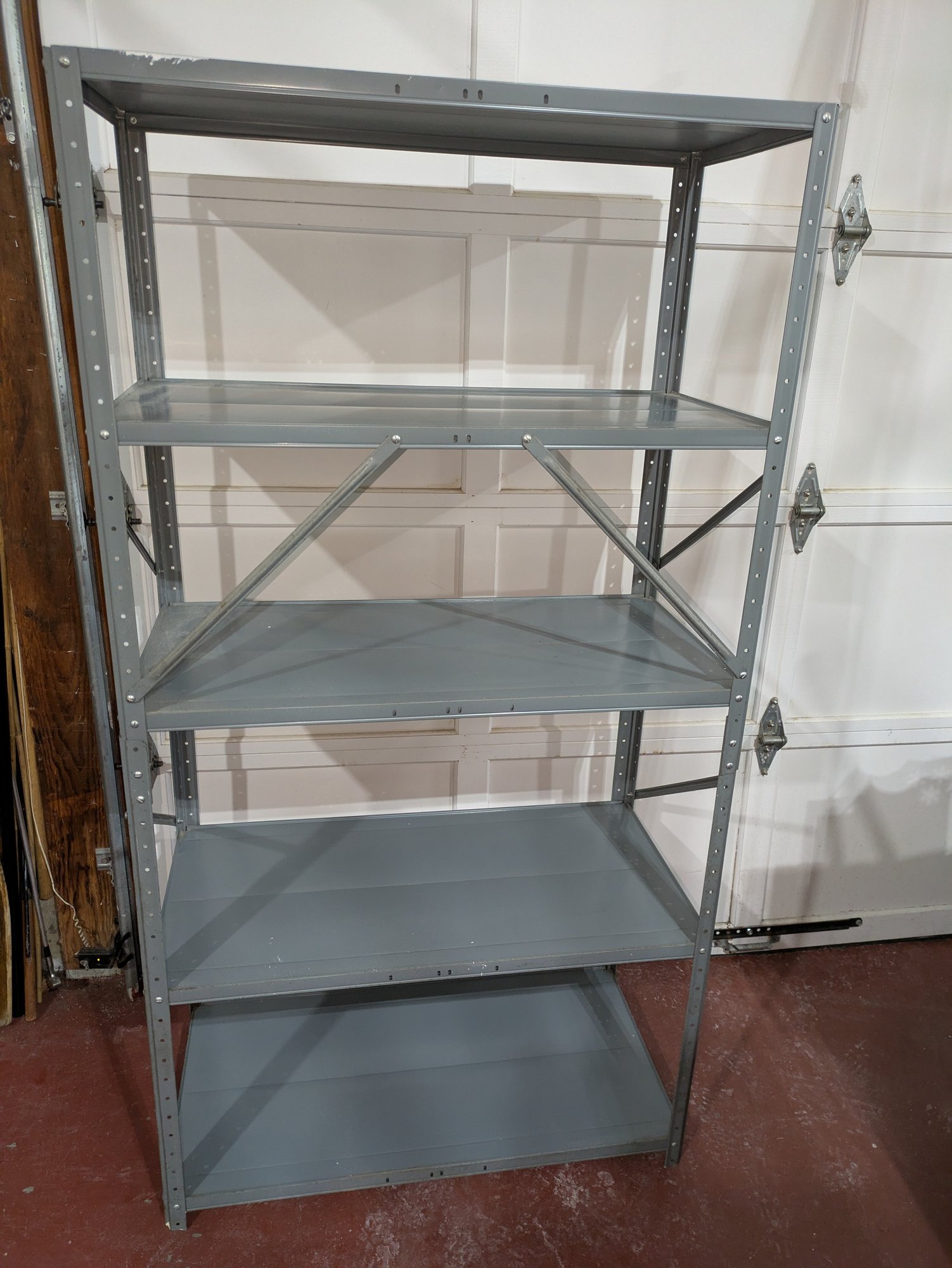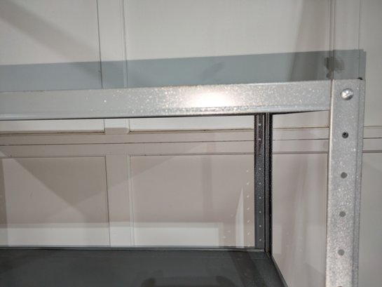 Heavy Duty Adjustable Powder Coated Steel Shelving Unit. Frame and Shelves show some paint overspray (see photos). Overall, Very Good Condition. Please see all photos as part of the description and condition. 36"W x 67"H x 18"D
