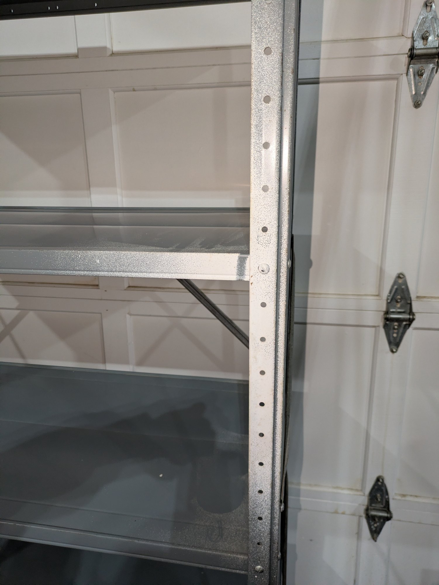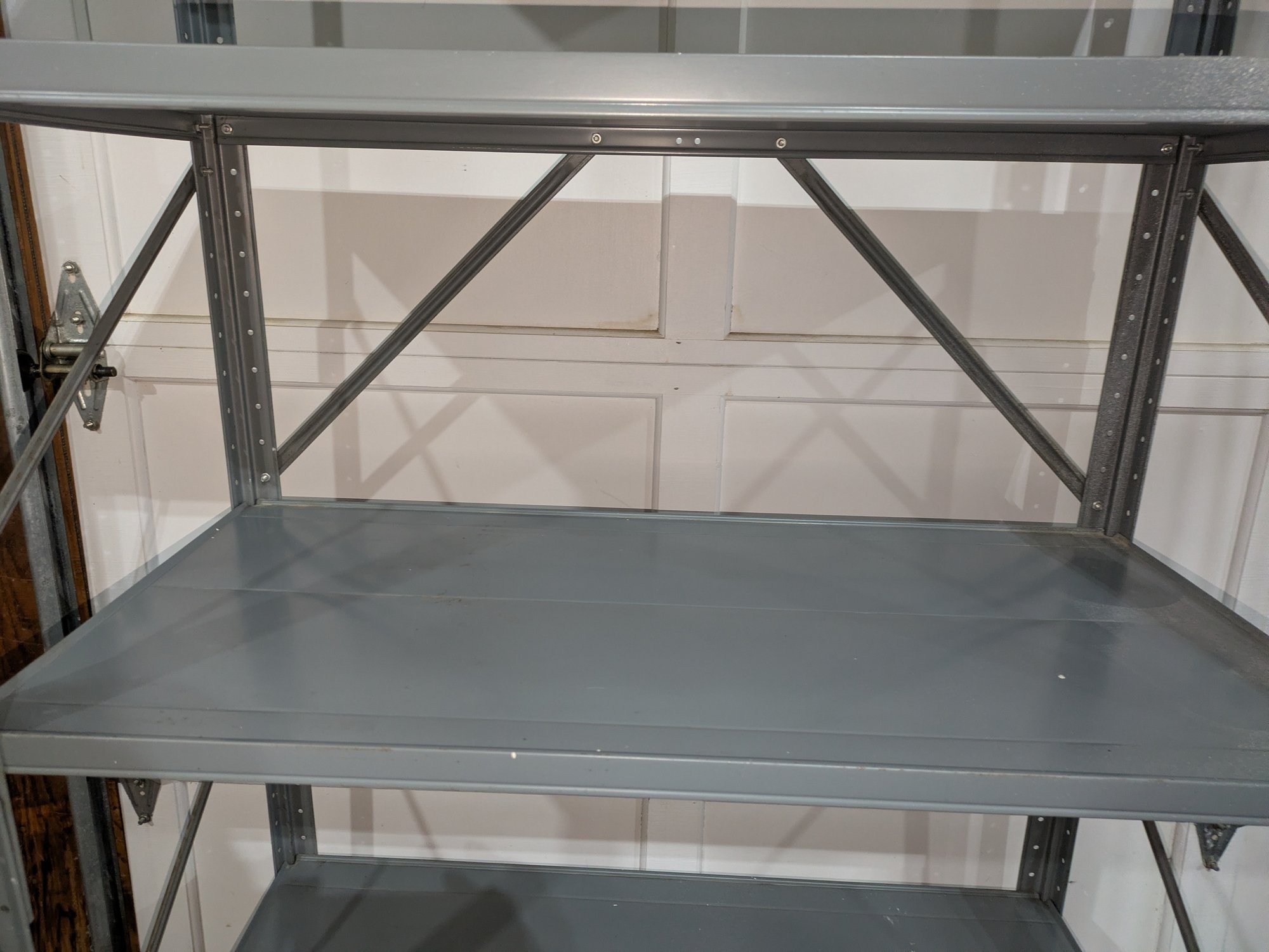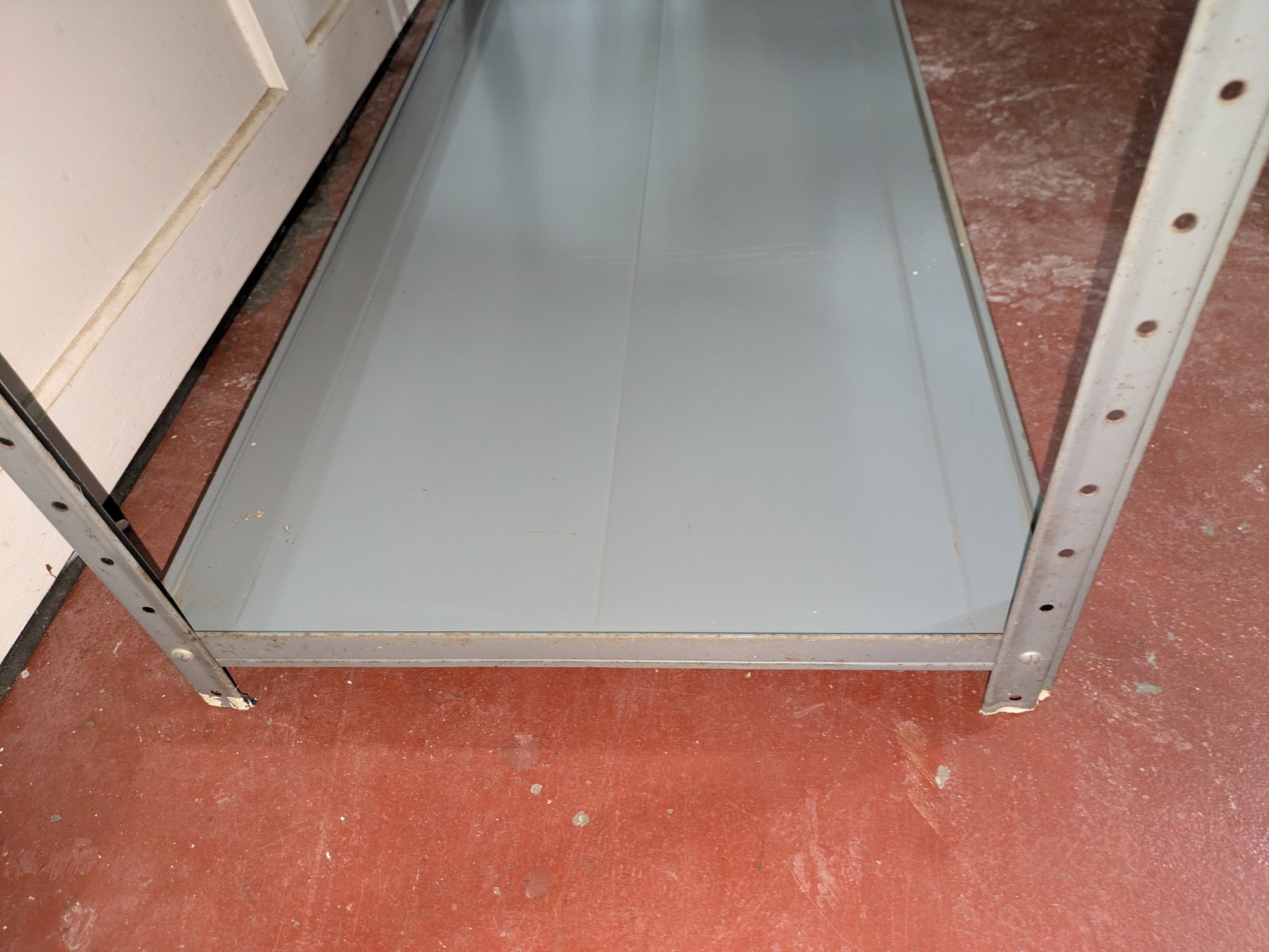 Heavy Duty Adjustable Powder Coated Steel Shelving Unit. Frame and Shelves show some paint overspray (see photos). Overall, Very Good Condition. Please see all photos as part of the description and condition. 36"W x 67"H x 18"D