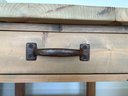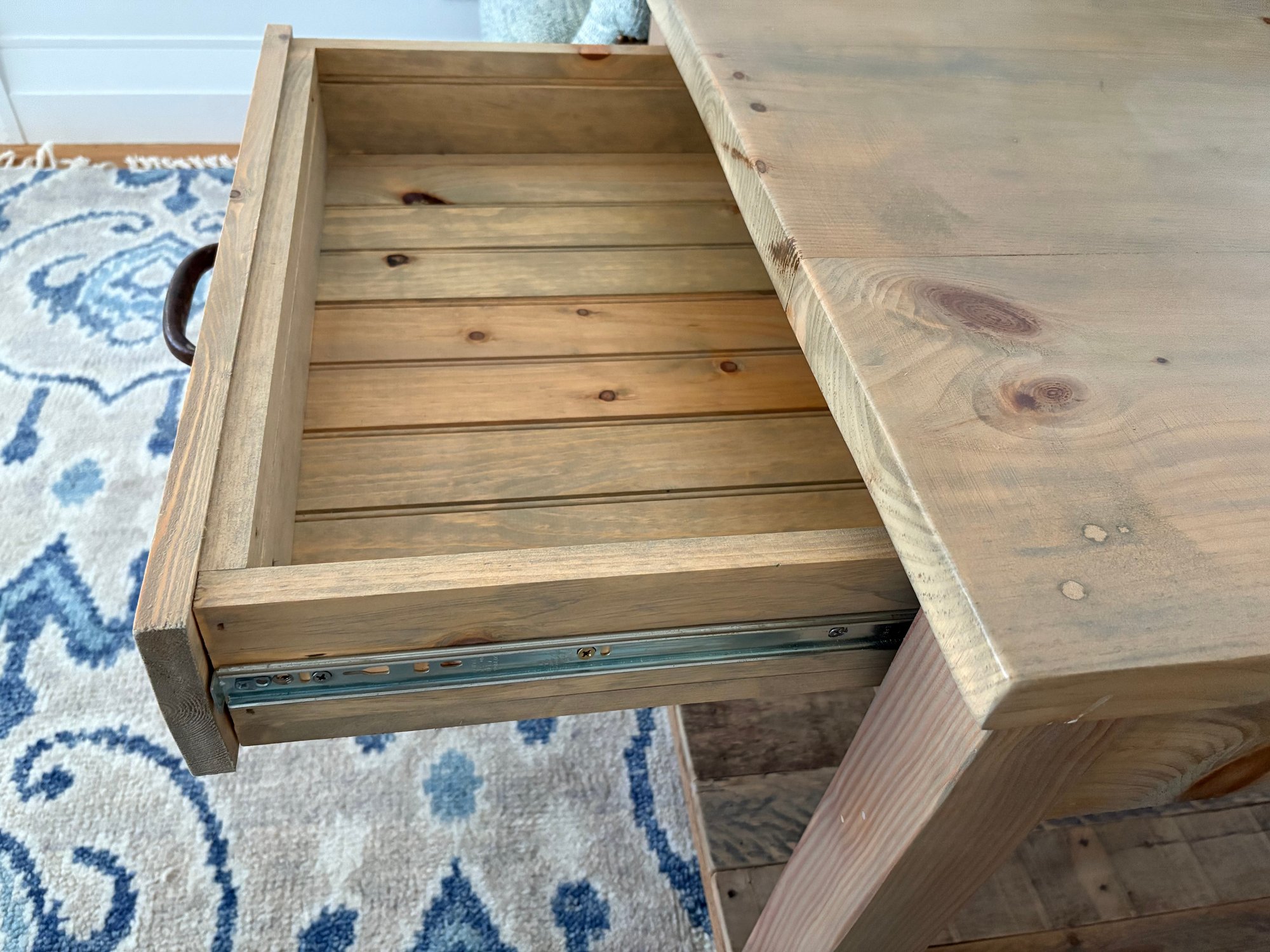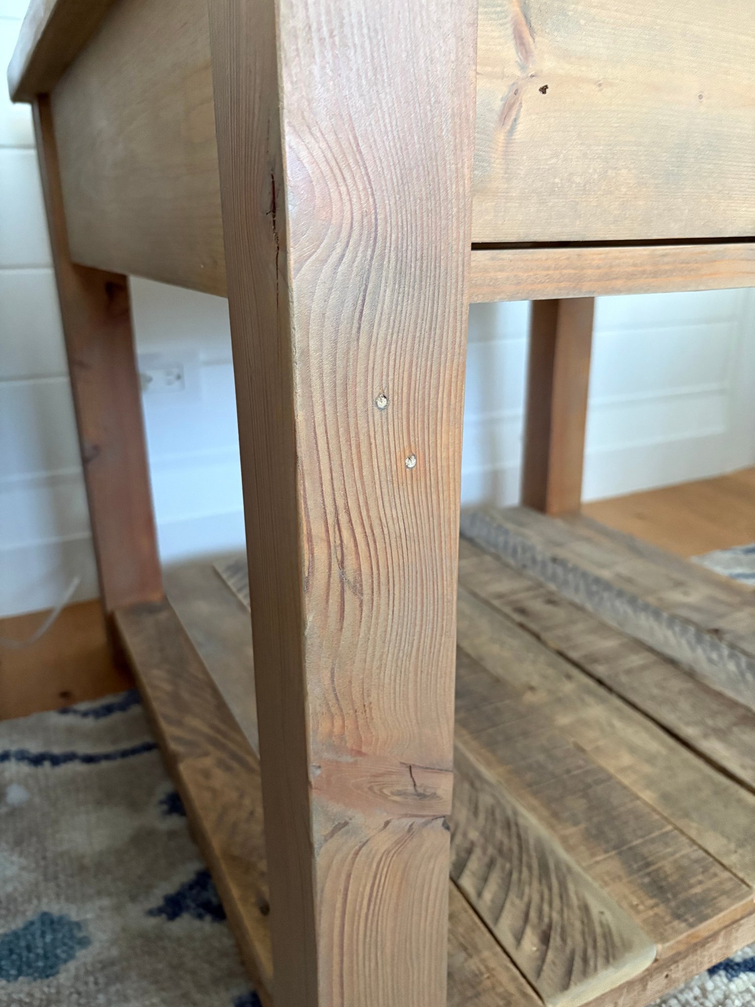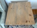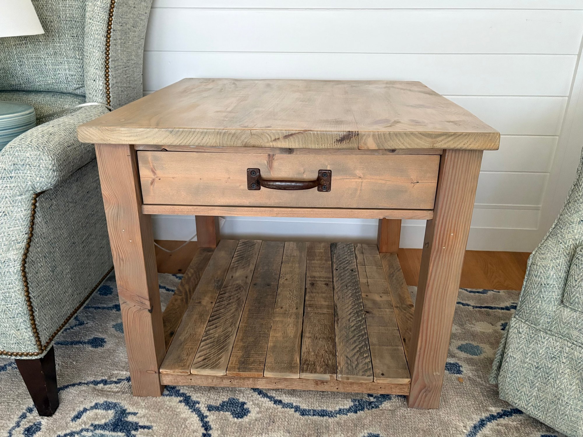 Square side table crafted from light-colored wood. This side table features a flat top surface, single drawer and lower shelf, made from horizontally laid wooden planks, supported by four sturdy, square legs at each corner.