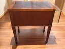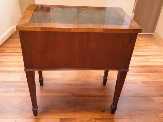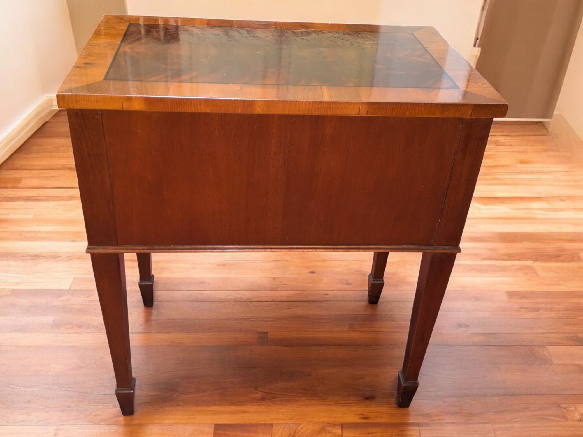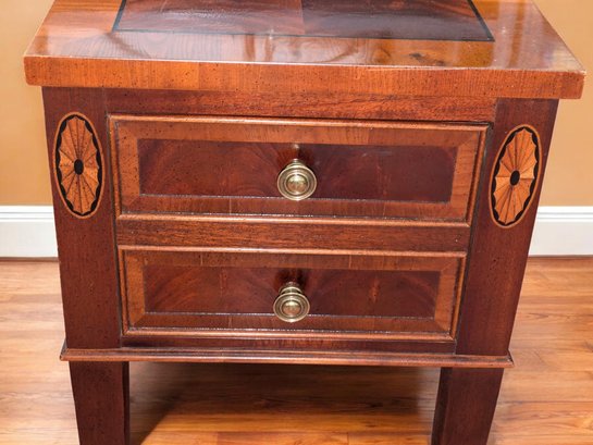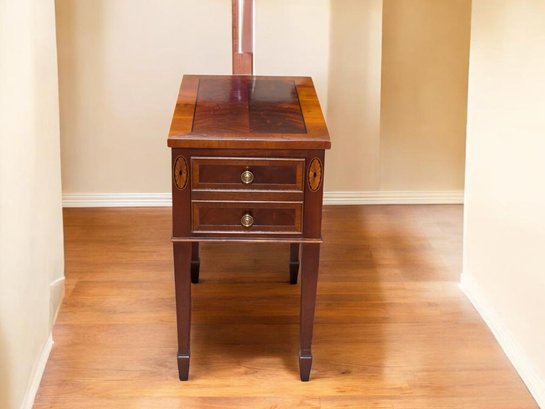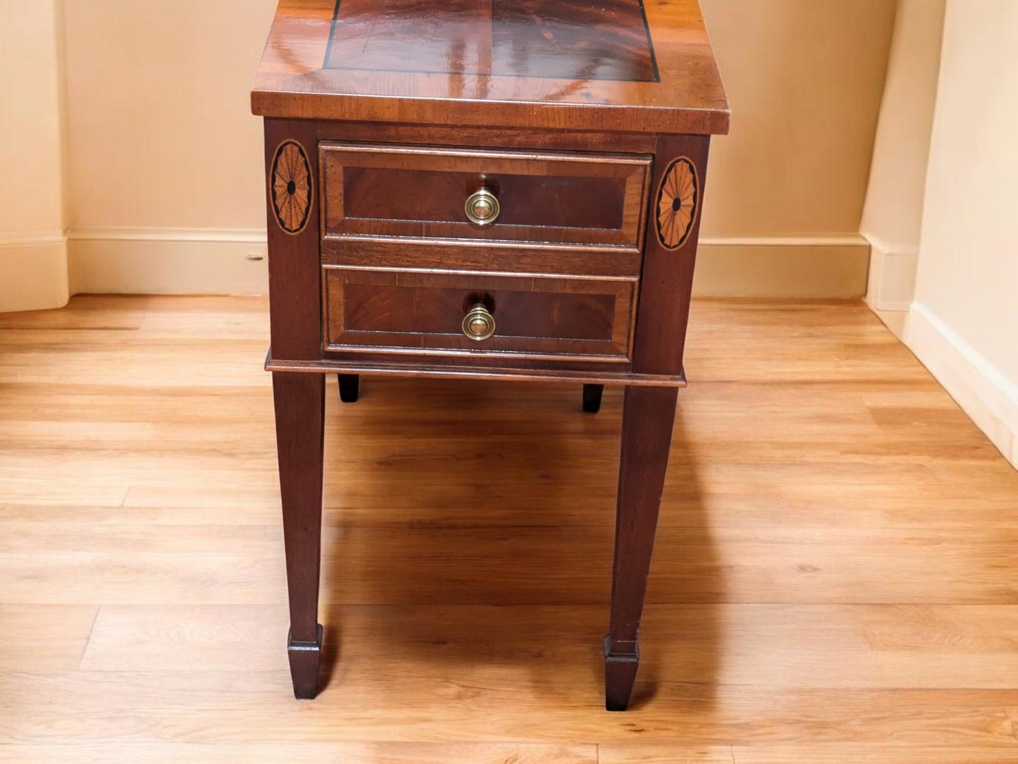 Hekman Copley Place Chairside End Table. Stunning detailing and design, made of mahogany solids with yewood, crotch mahogany veneers, and ebony inlay with one large drawer, brass drawer pulls, and tapered legs. Very little, minor wear, consistent with age and use. Overall, Very Good Condition. Please see all photos as part of the description and condition. 13"W x 23"H x 21"D
