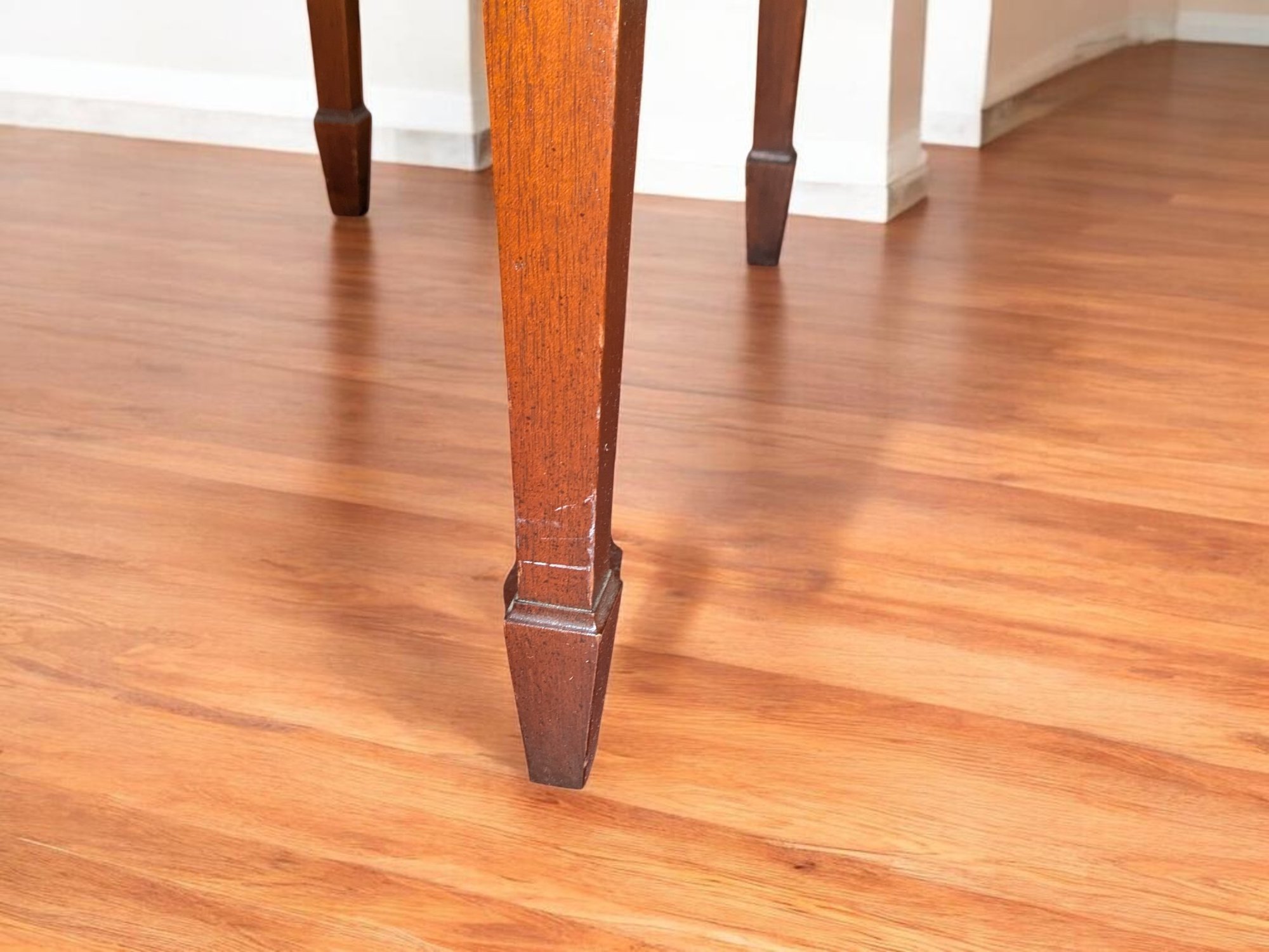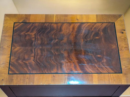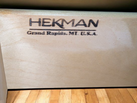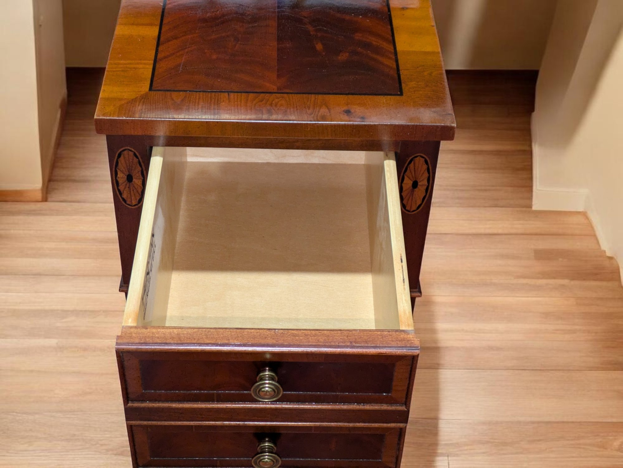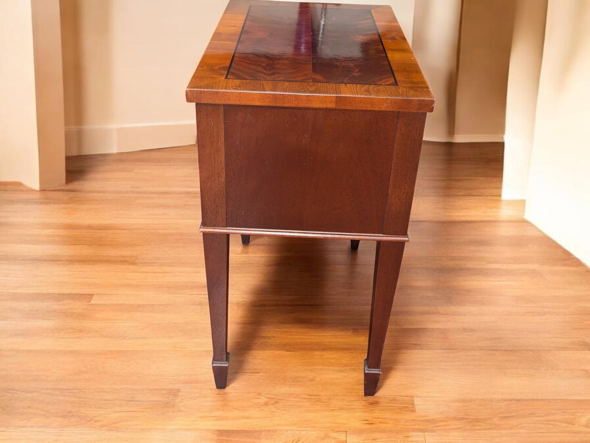 Hekman Copley Place Chairside End Table. Stunning detailing and design, made of mahogany solids with yewood, crotch mahogany veneers, and ebony inlay with one large drawer, brass drawer pulls, and tapered legs. Very little, minor wear, consistent with age and use. Overall, Very Good Condition. Please see all photos as part of the description and condition. 13"W x 23"H x 21"D