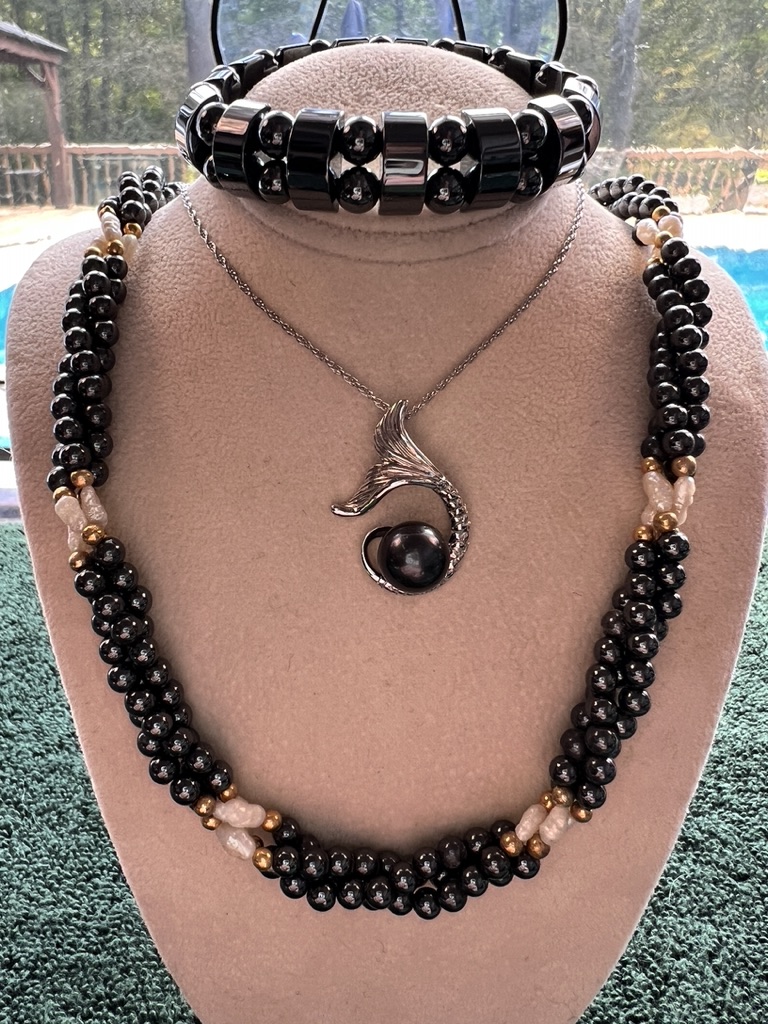 Hematite- Braided Beads With Biwa Pearls, Sterling Rope Chain 18", Beaded Bracelet