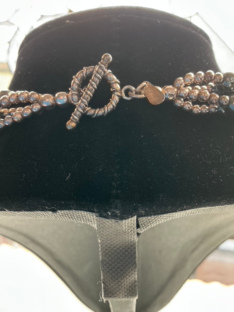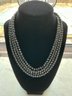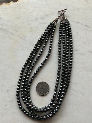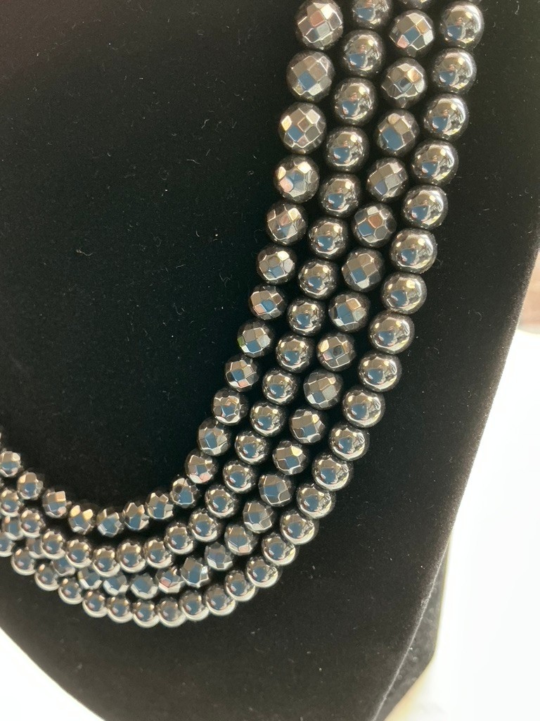 Four strand 18" Hematite, faceted beads, in layered form, hangs beautifully, with a Sterling Silver toggle clasp, for easy closure, and comfortable wearing, and easy off. With black they are bold, with white they are striking, with colors, they reflect the colors you wear, and they are a healing stone, just lovely,