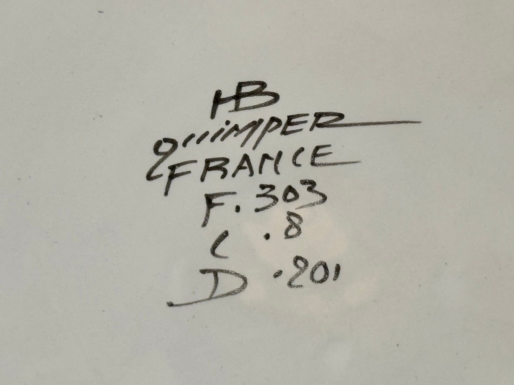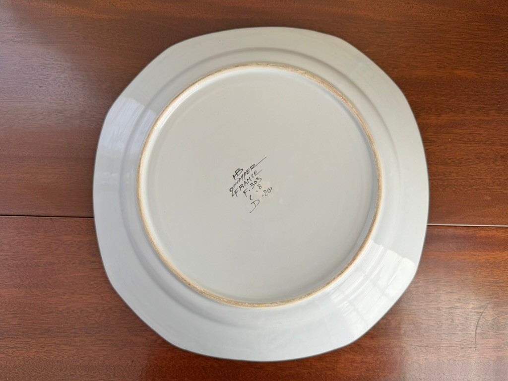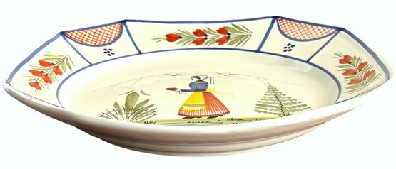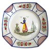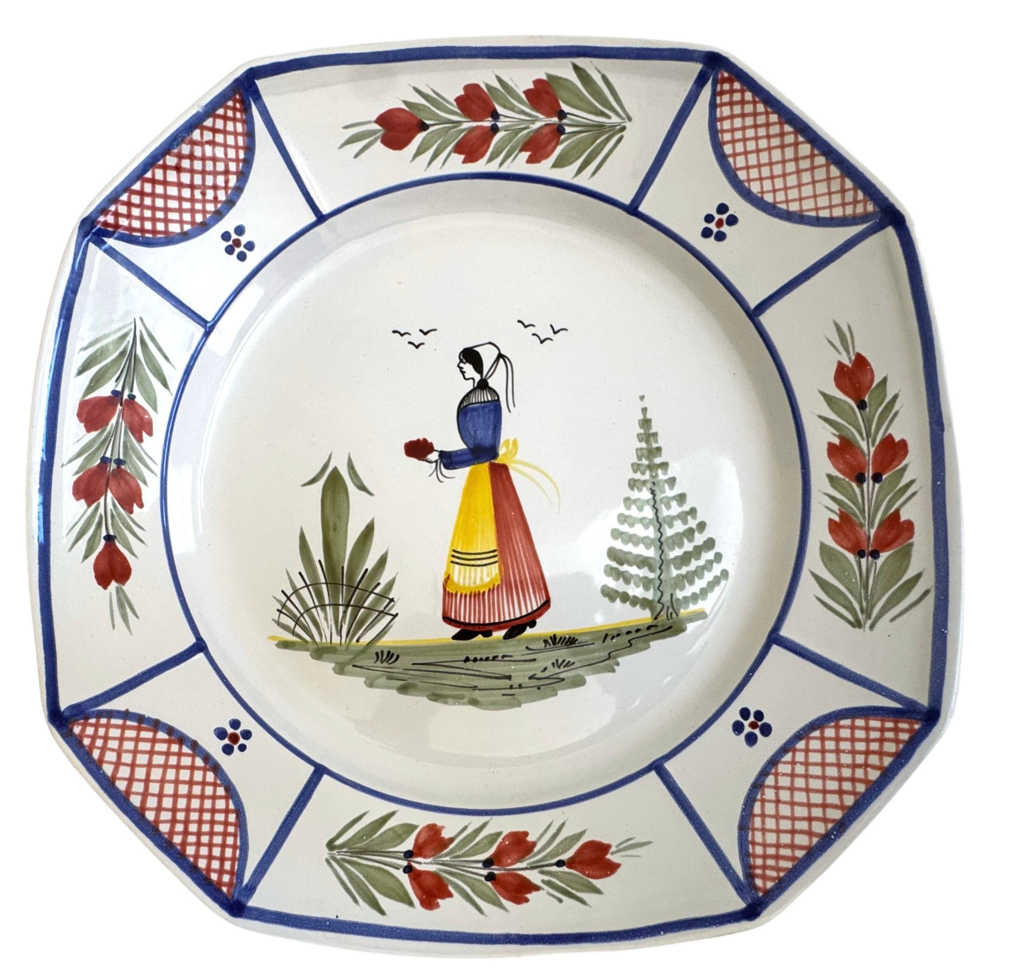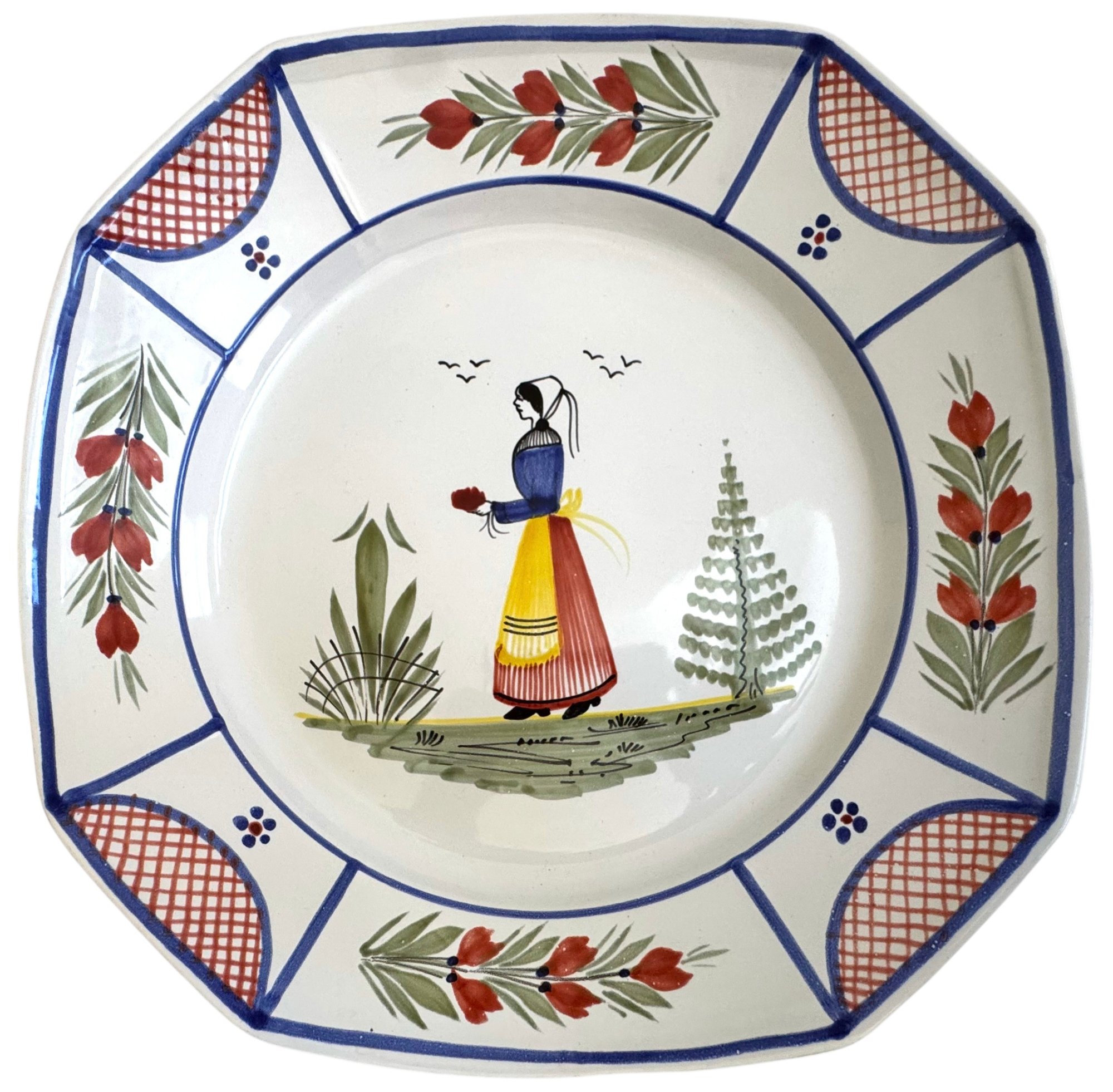 Authentic hand-painted faience plate from Henriot Quimper, France, featuring a traditional Breton woman in regional dress surrounded by floral tulip motifs and cobalt blue geometric borders. Octagonal form.