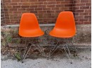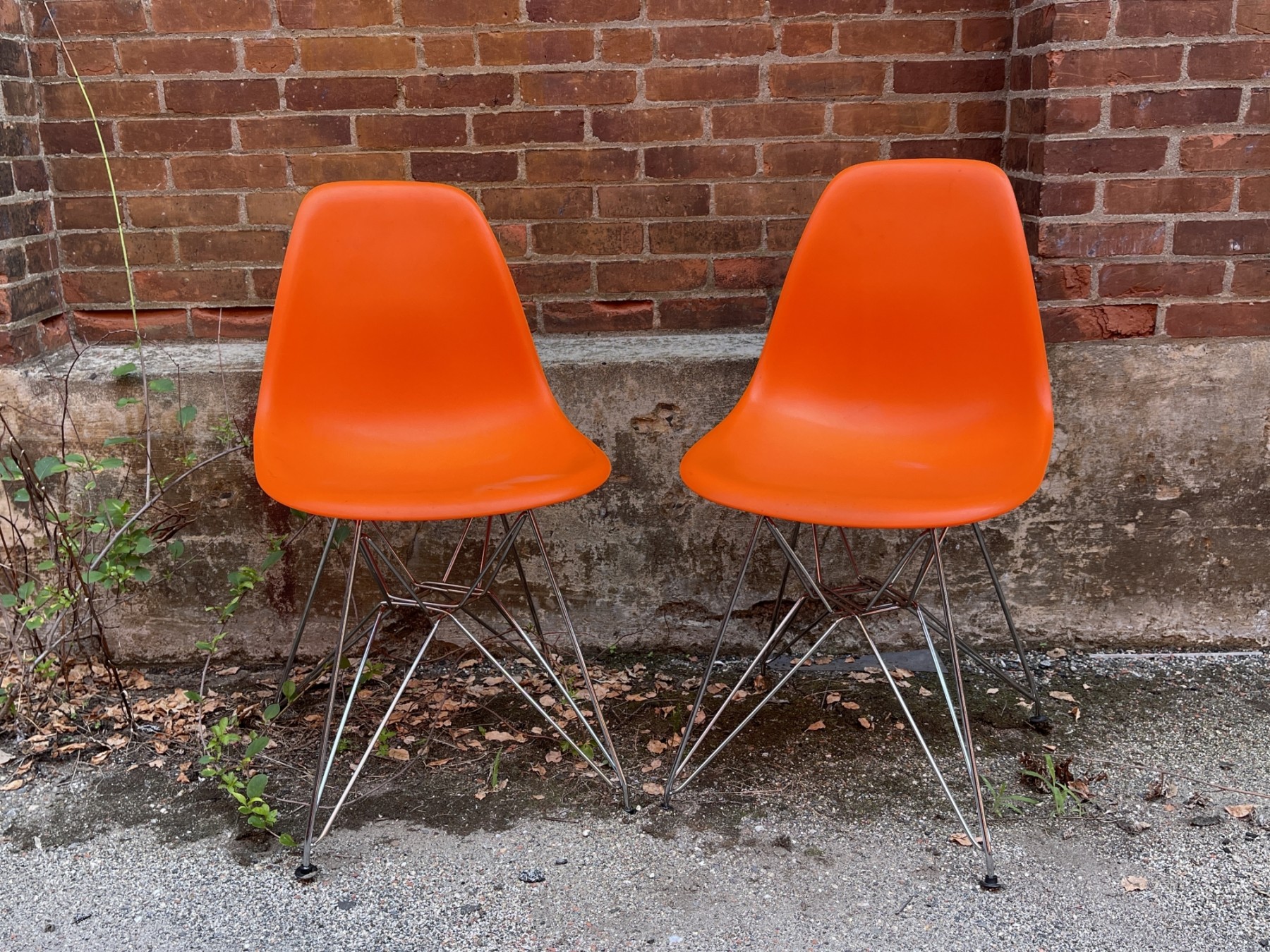 A great pair of contemporary mid century modern style Eiffel Tower chairs in a vibrant orange. Fantastic! They measure 33.5 inches tall and the seat is a width of 18 inches. Depth on the seat is 15 inches. Just a few scuffs on seat as seen in photos.