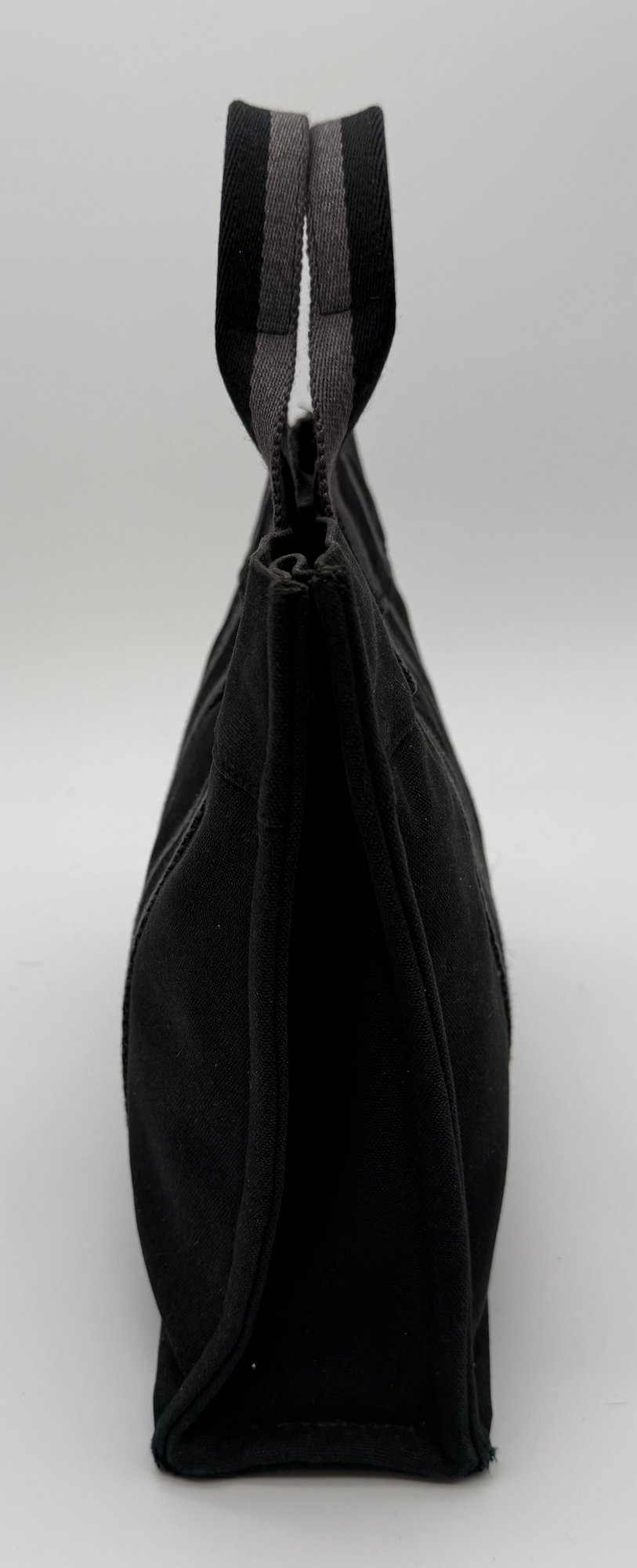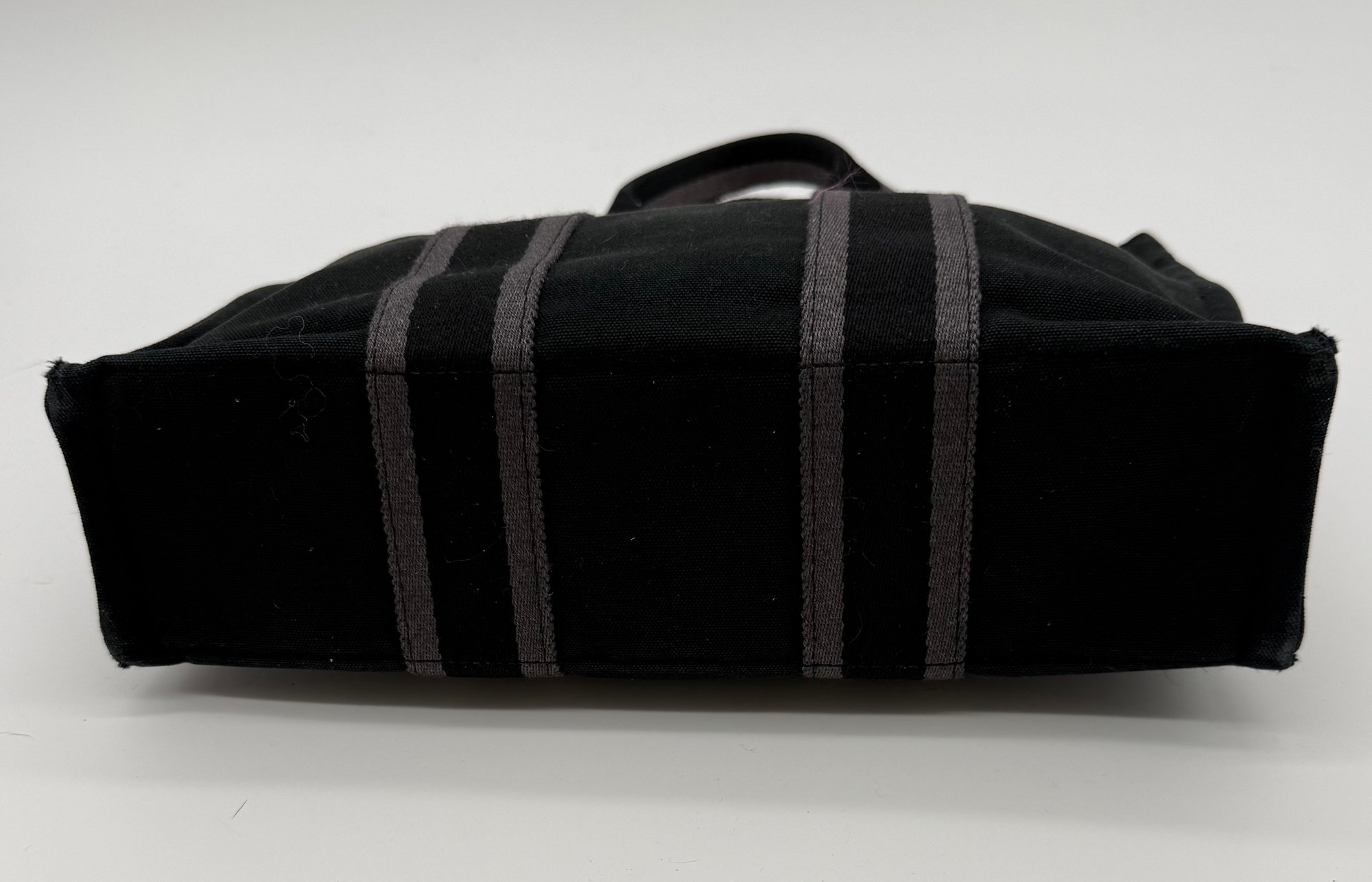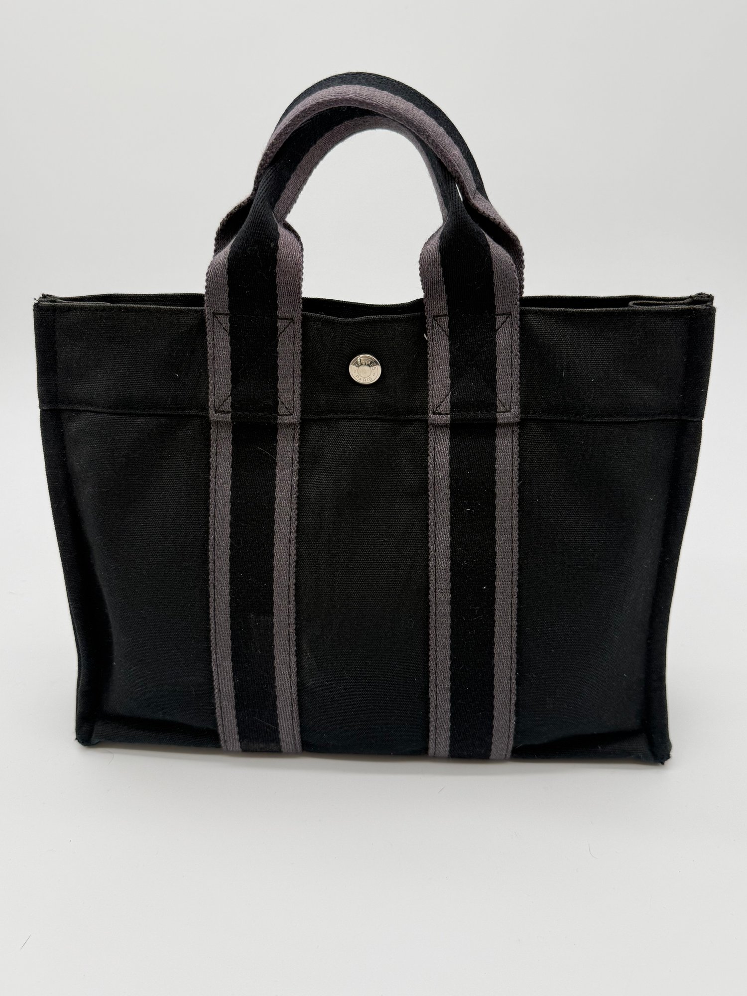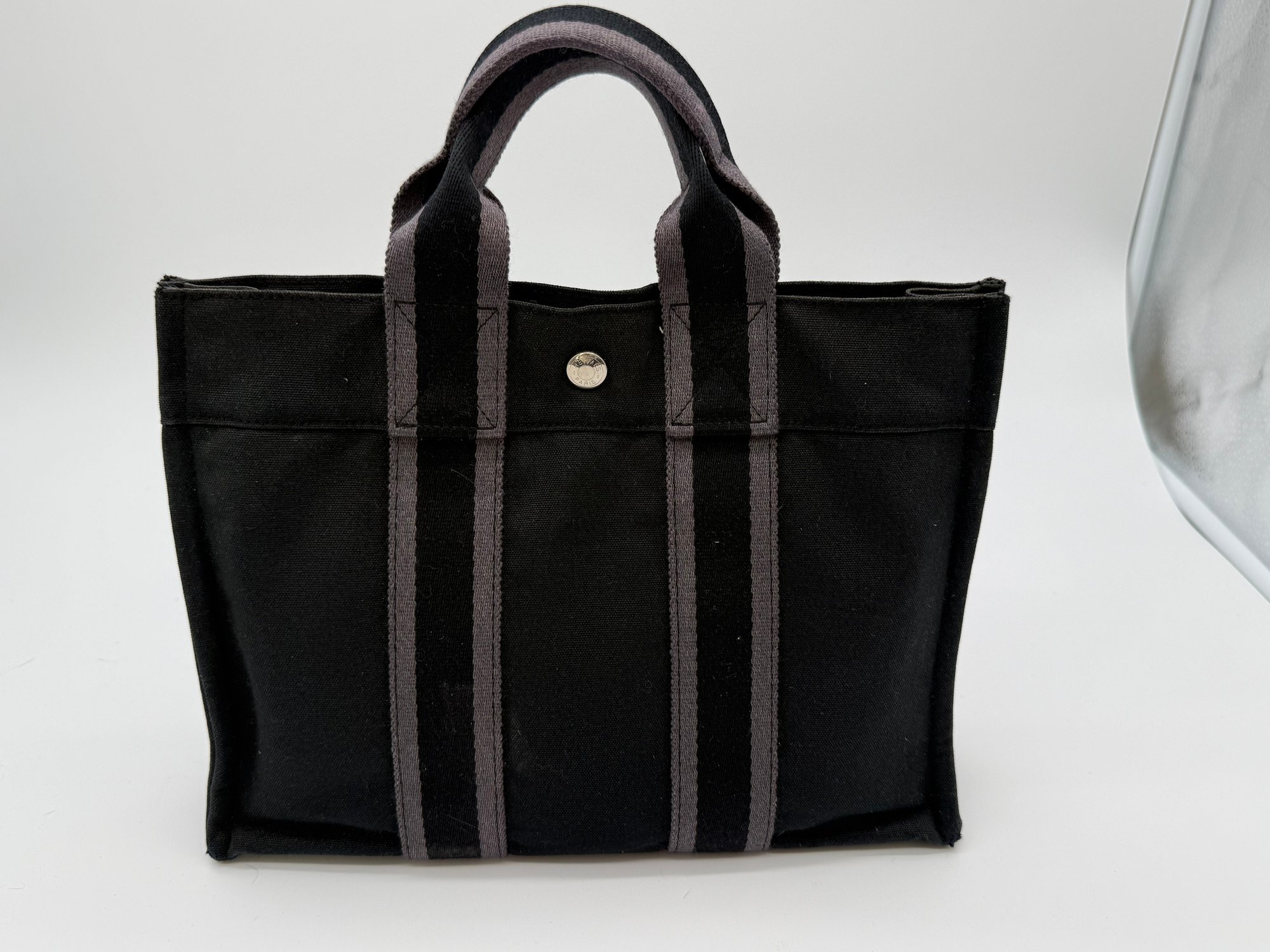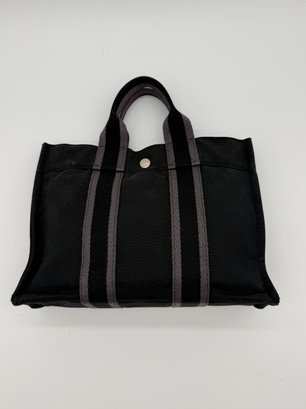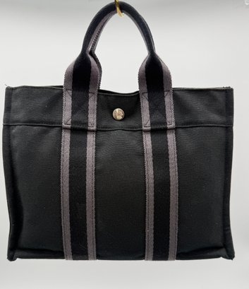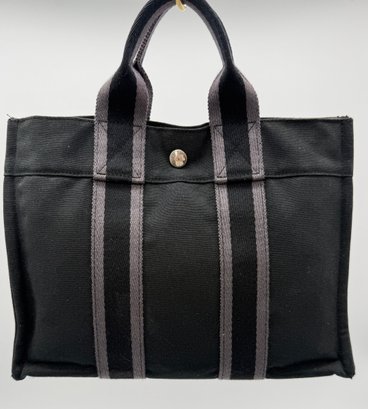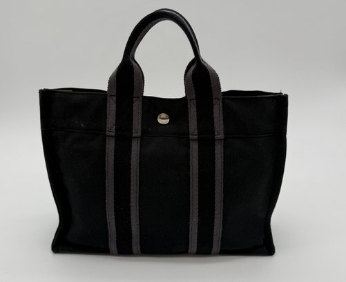 This lot features an authentic Hermes tote in canvas cotton with silvertone hardware.