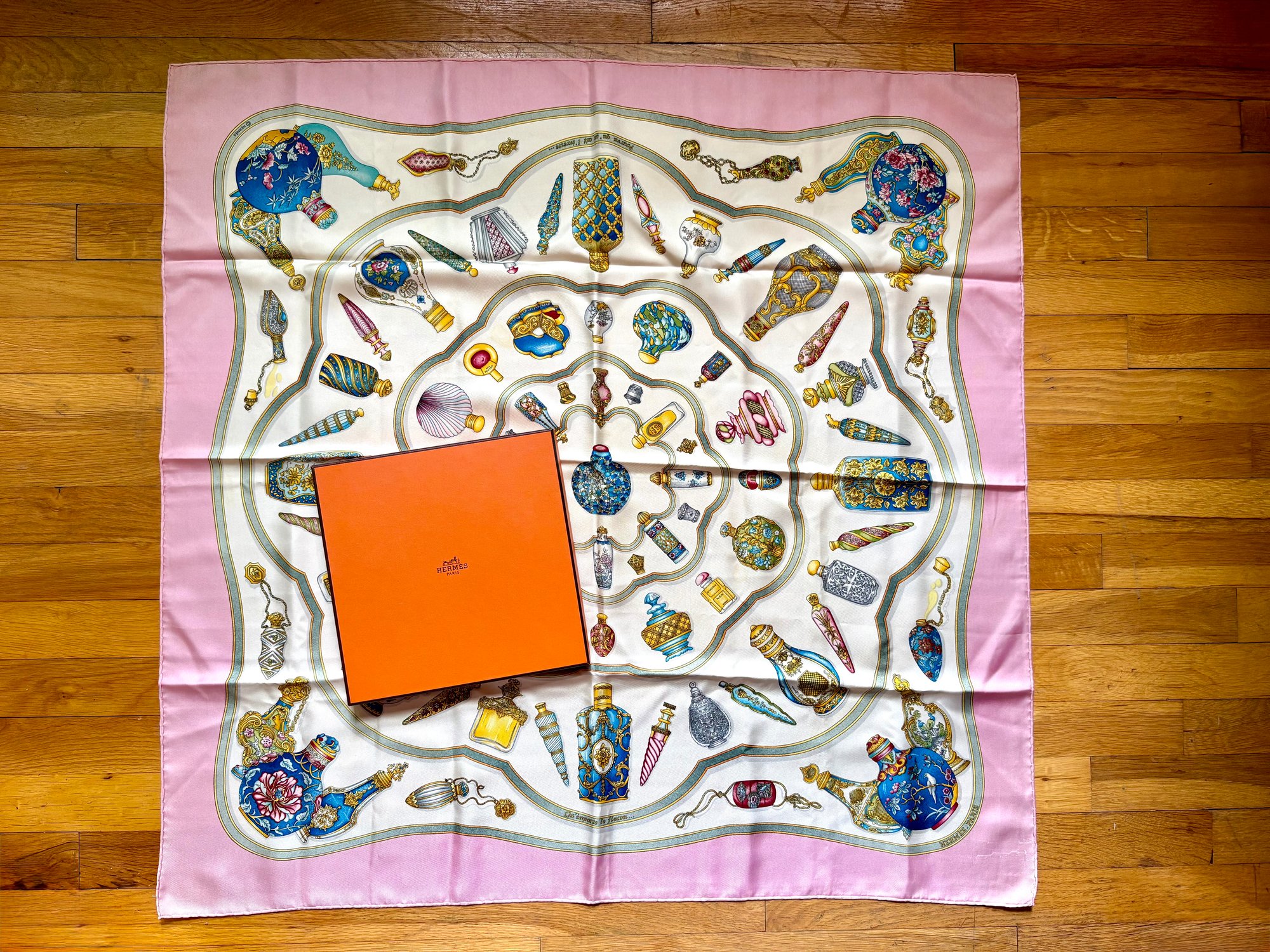 Hermès Qu' Importe Le Flaçon 35" silk scarf in pink.