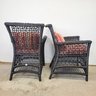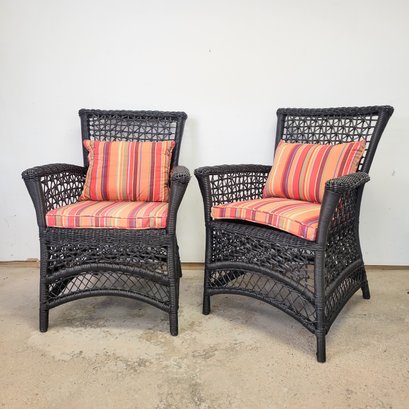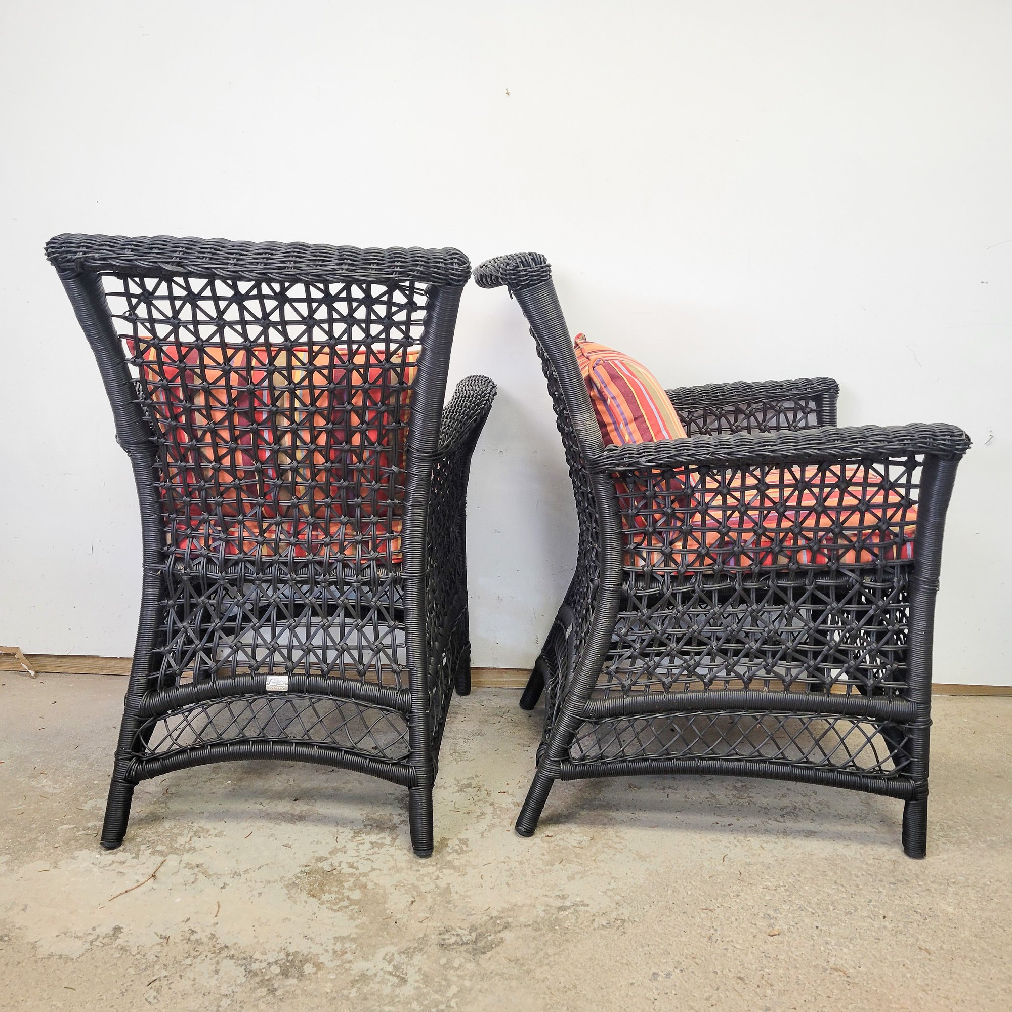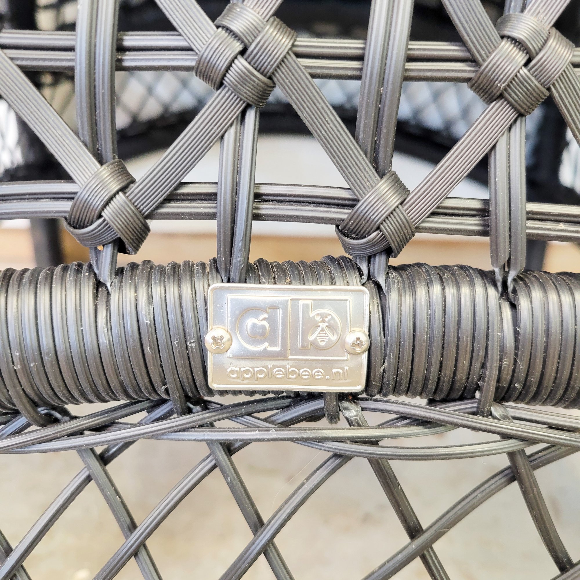 Applebee.nl woven black vinyl wicker patio chairs with bright, striped cushions.