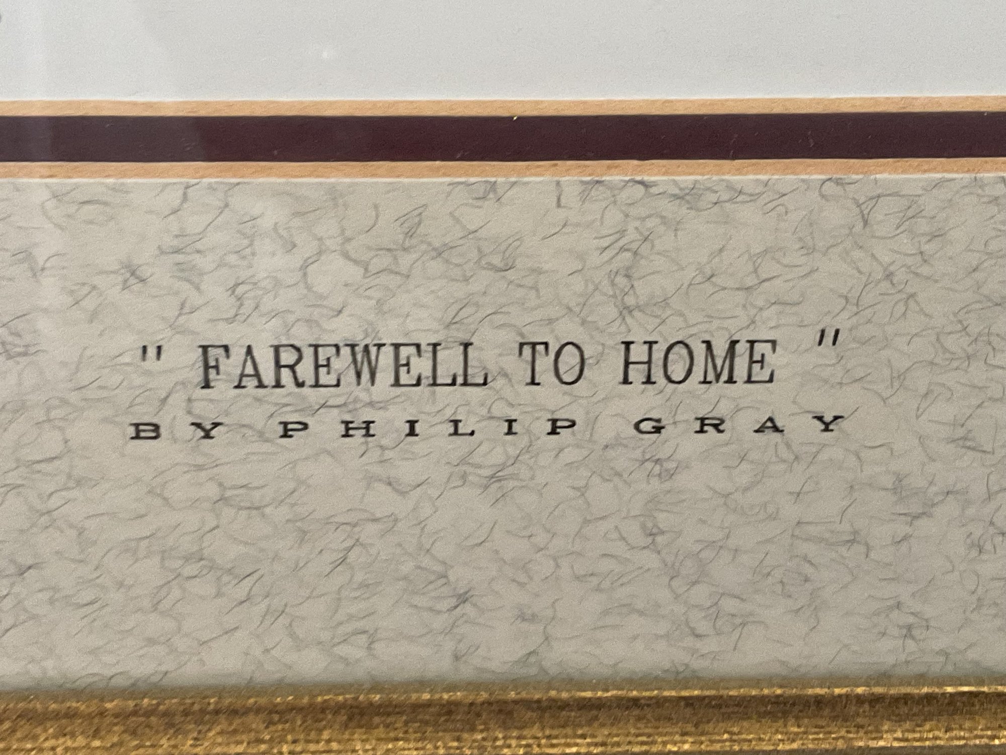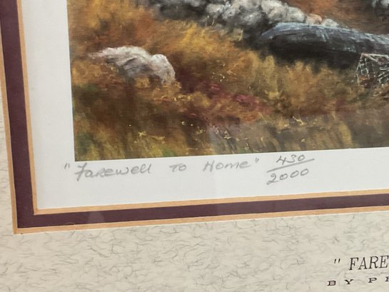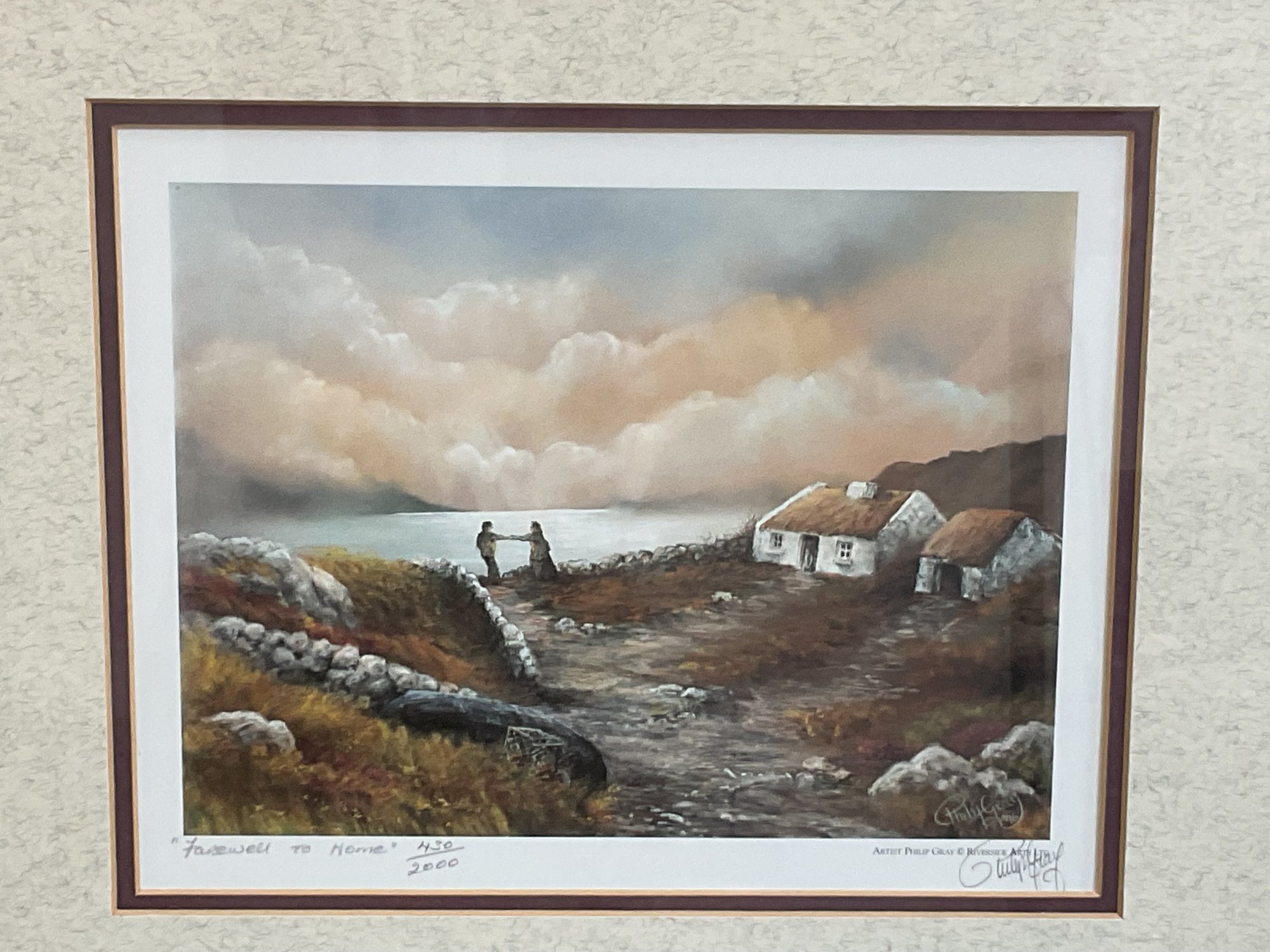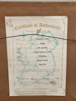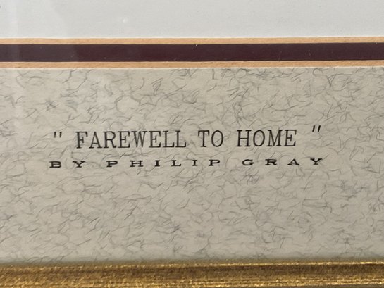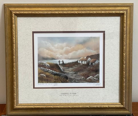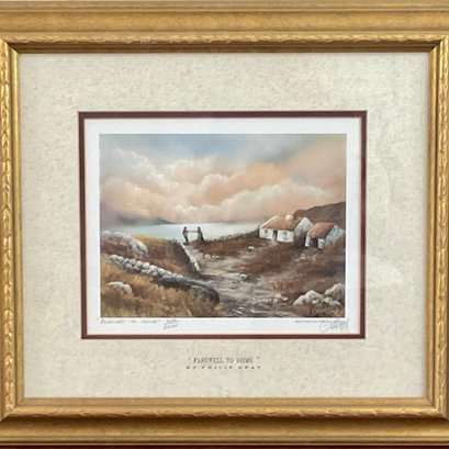 This is a beautiful limited edition print titled "Farewell to Home" by renowned Irish artist Philip Gray. The piece depicts a poignant coastal scene in Ireland, featuring traditional white-washed cottages and a figures overlooking the sea under a soft, atmospheric sky.
