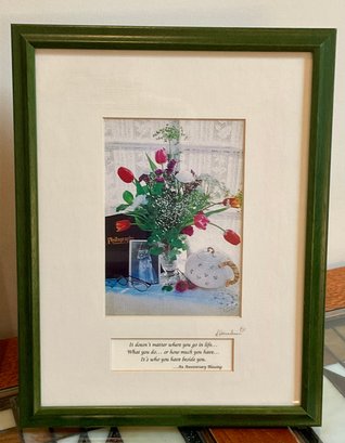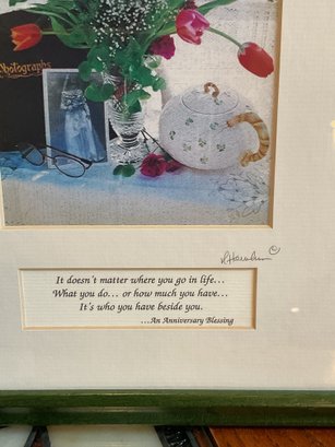 Subject: A still life composition featuring a bouquet of tulips, a traditional Irish teapot, and a sentimental "Anniversary Blessing" poem.