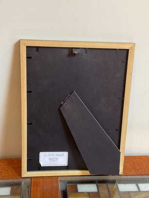 Frame Details: Housed in a dark forest green wooden frame with a kickstand for tabletop display.