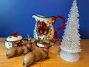 battery operated lighted tree; 2 sitting reindeer, Cosmos Red Bird Pitcher beautiful; Cosmos Red Bird Lidded bowl