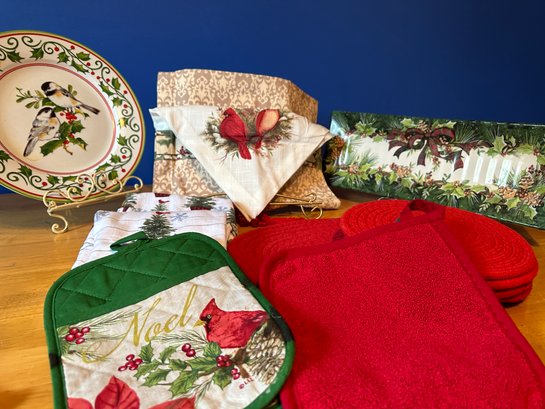 2 dish towels; 4 pot holders;6 red cloth trivets; Red bird table runner; Bird plate; appetizer serving plate