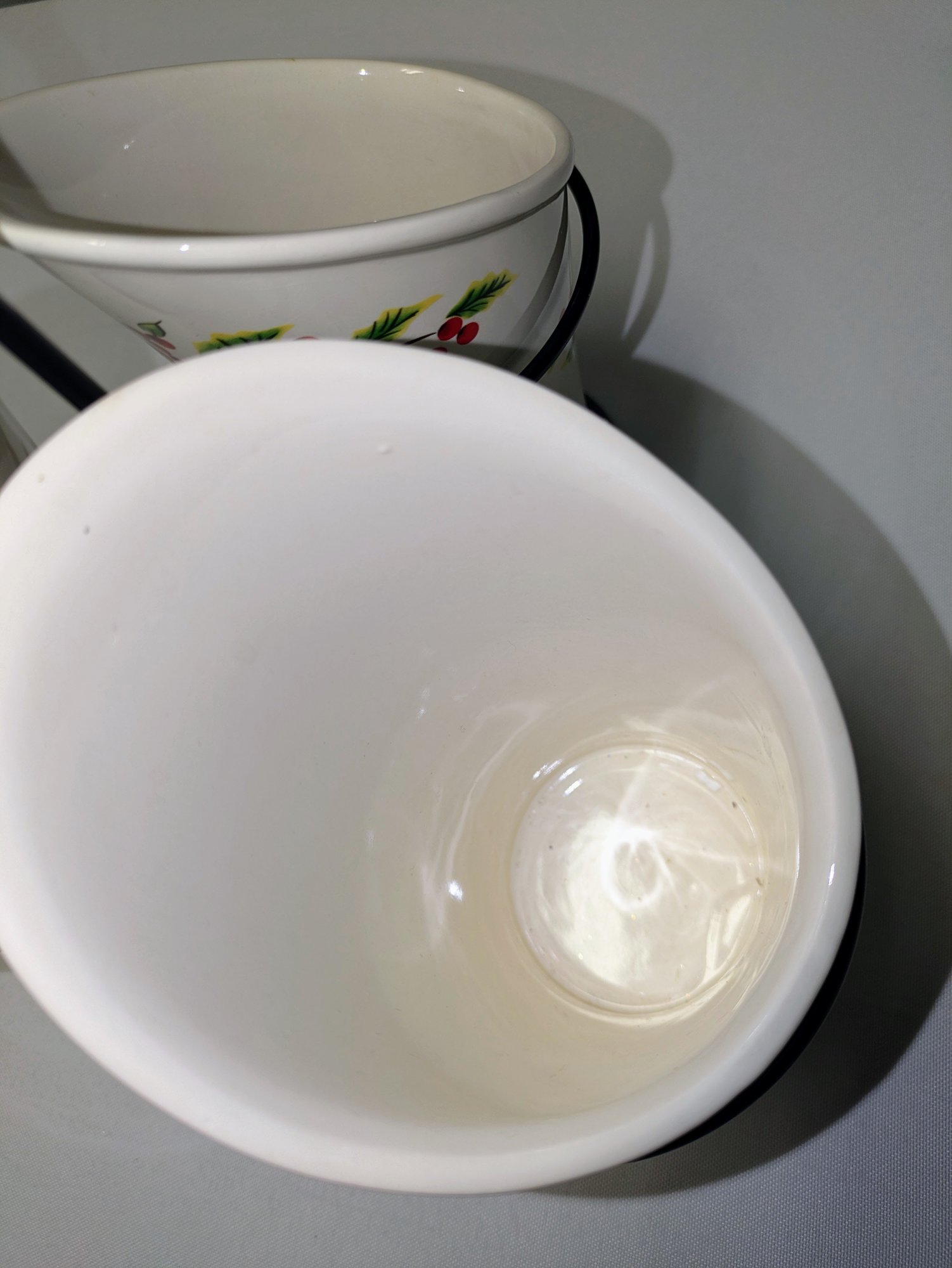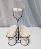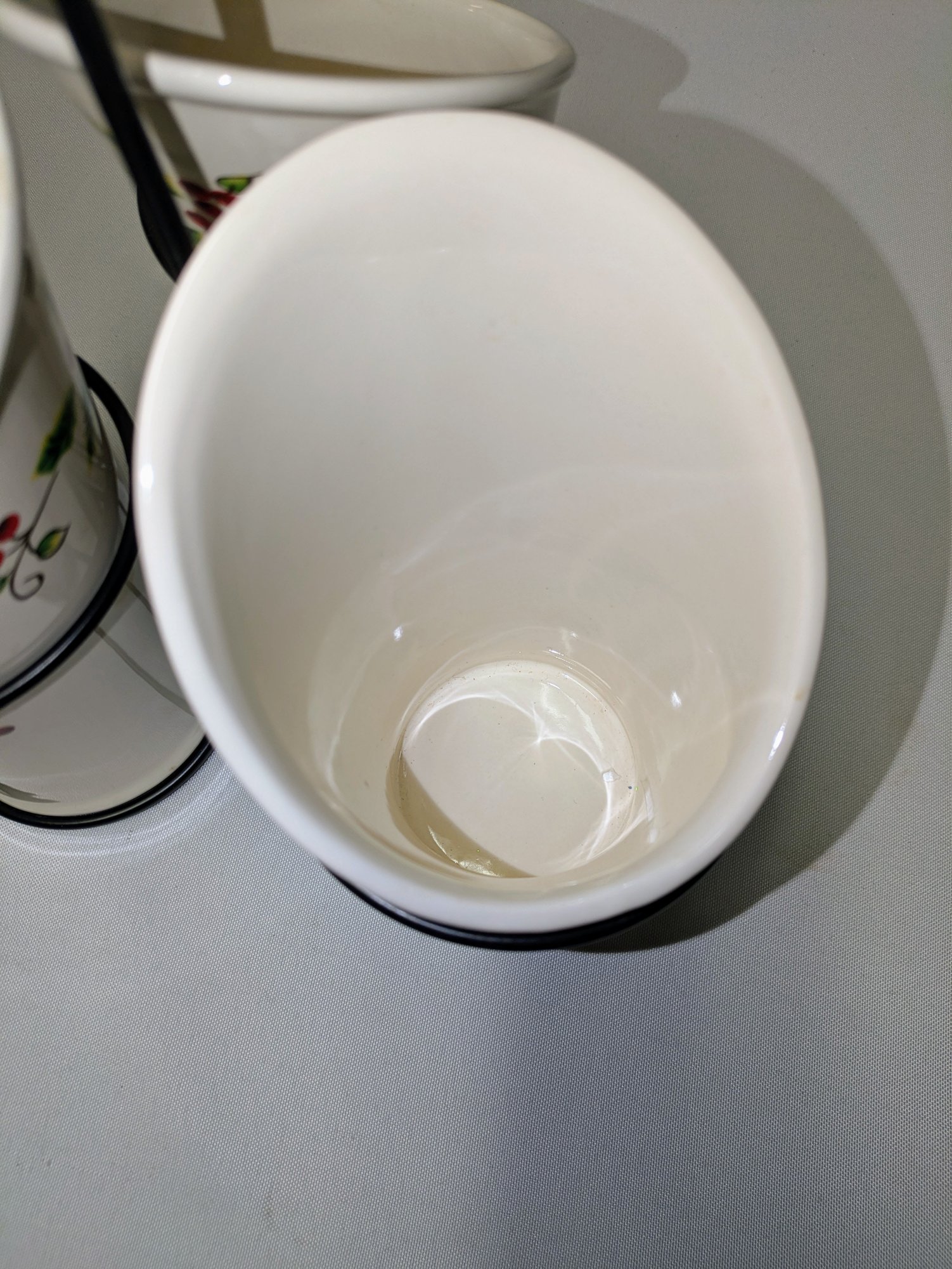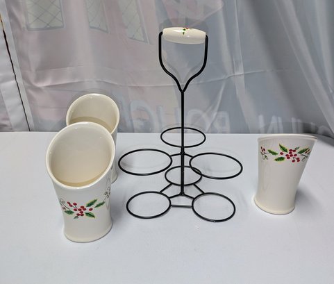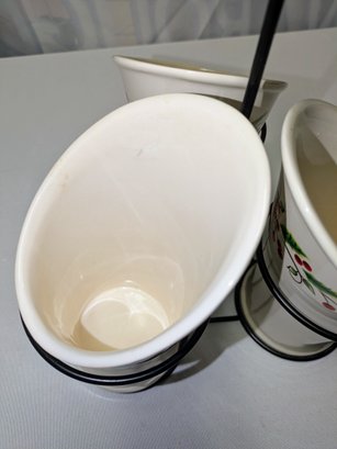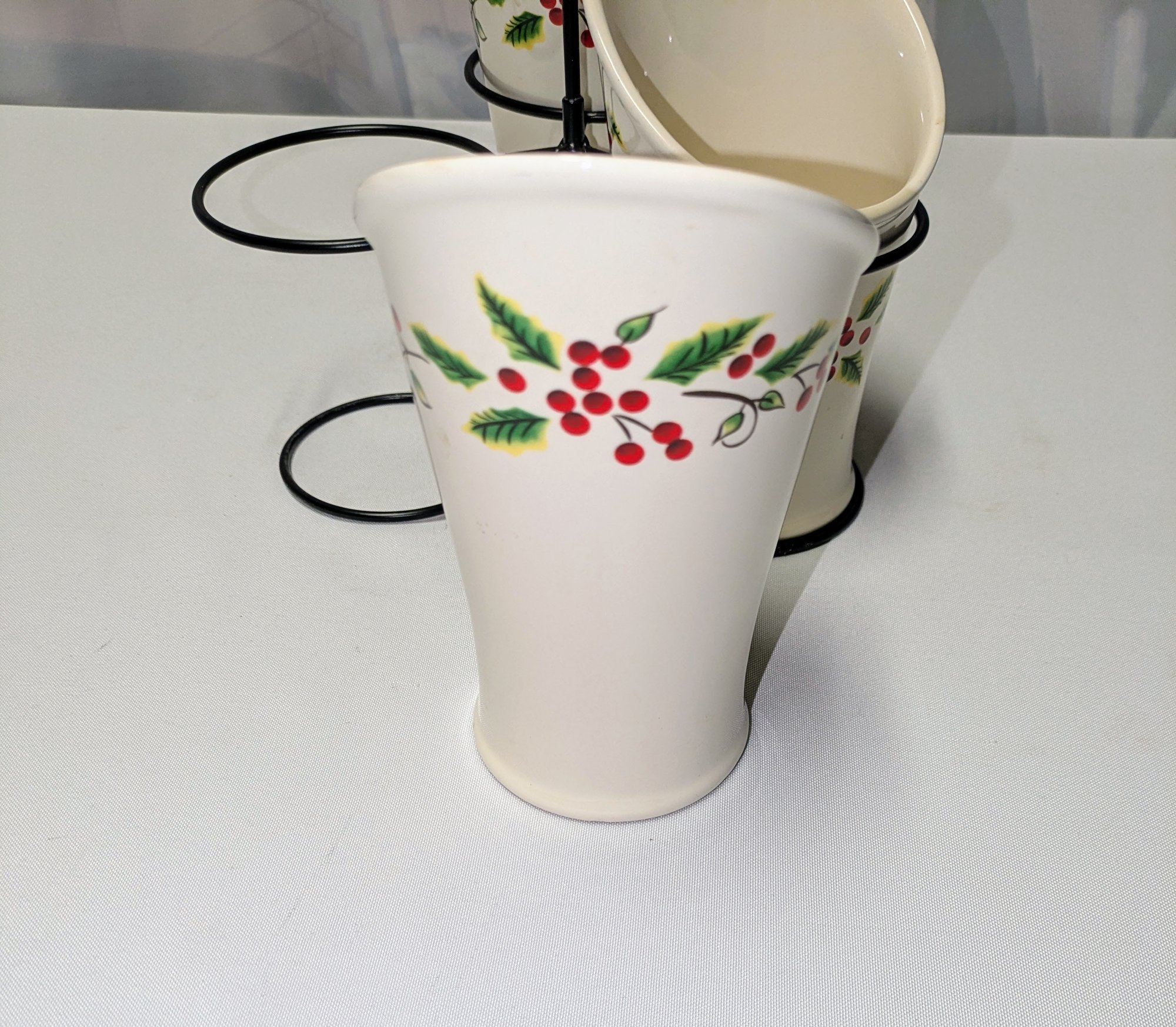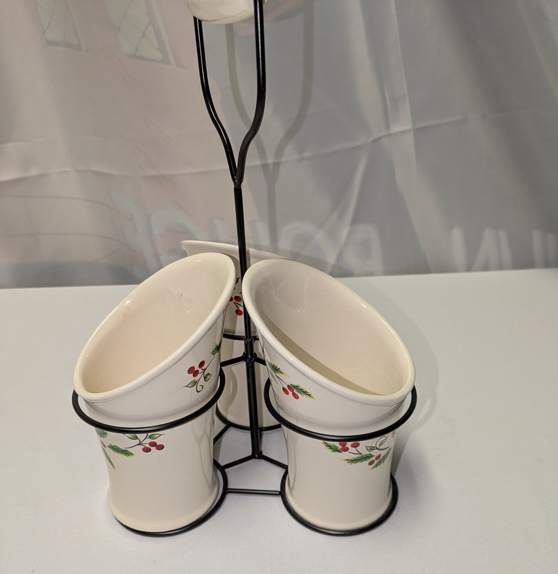 Holly & Berry Porcelain 3-Cup & Stand Utensil Holder Caddie. Excellent Condition. Great for holding your forks, spoons & knives for easy access. Holder/Stand 13"H / Porcelain Utensil Cups 7" H (back) & 4.5" (front)
