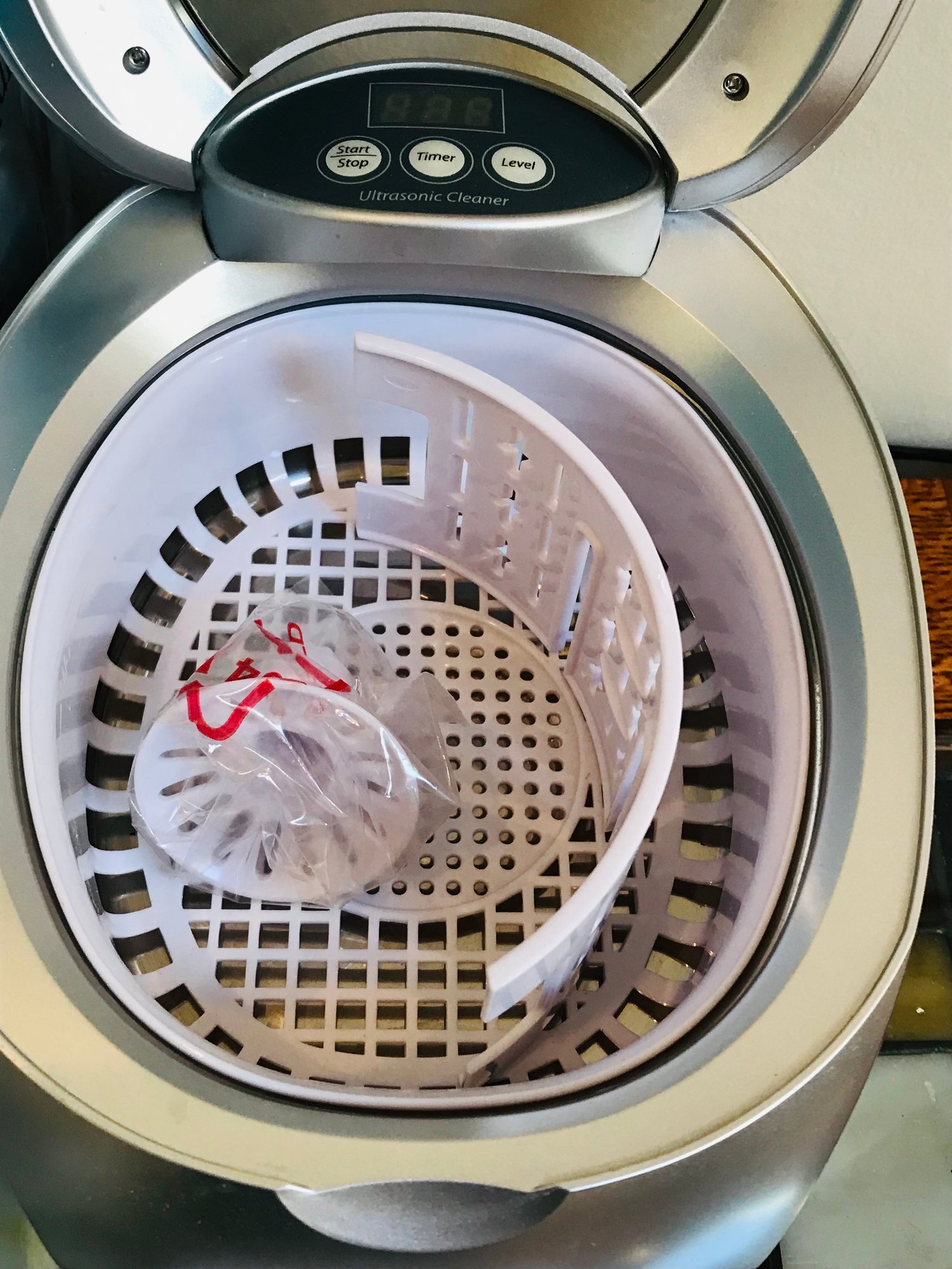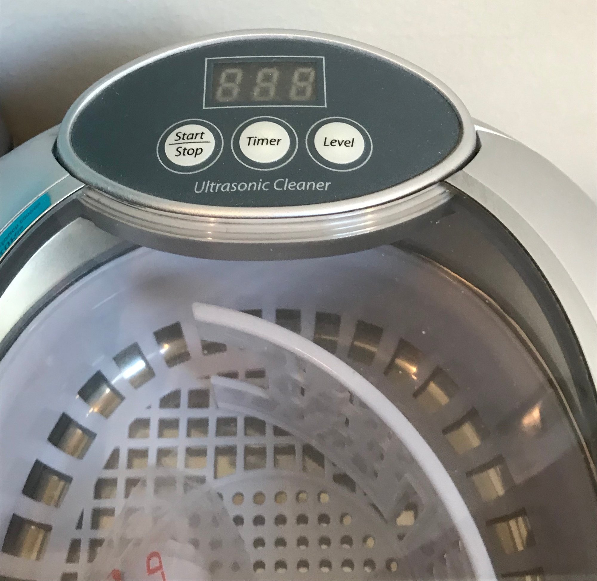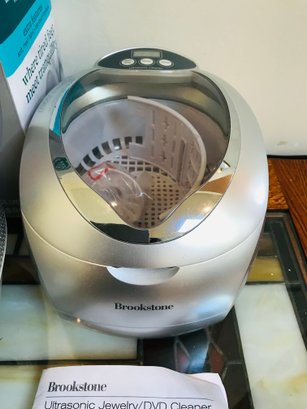Brookstone Ultrasonic Jewelry/DVD Cleaner: Compact silver-tone cleaner designed to restore sparkle to jewelry, watches, and discs. Includes manual.