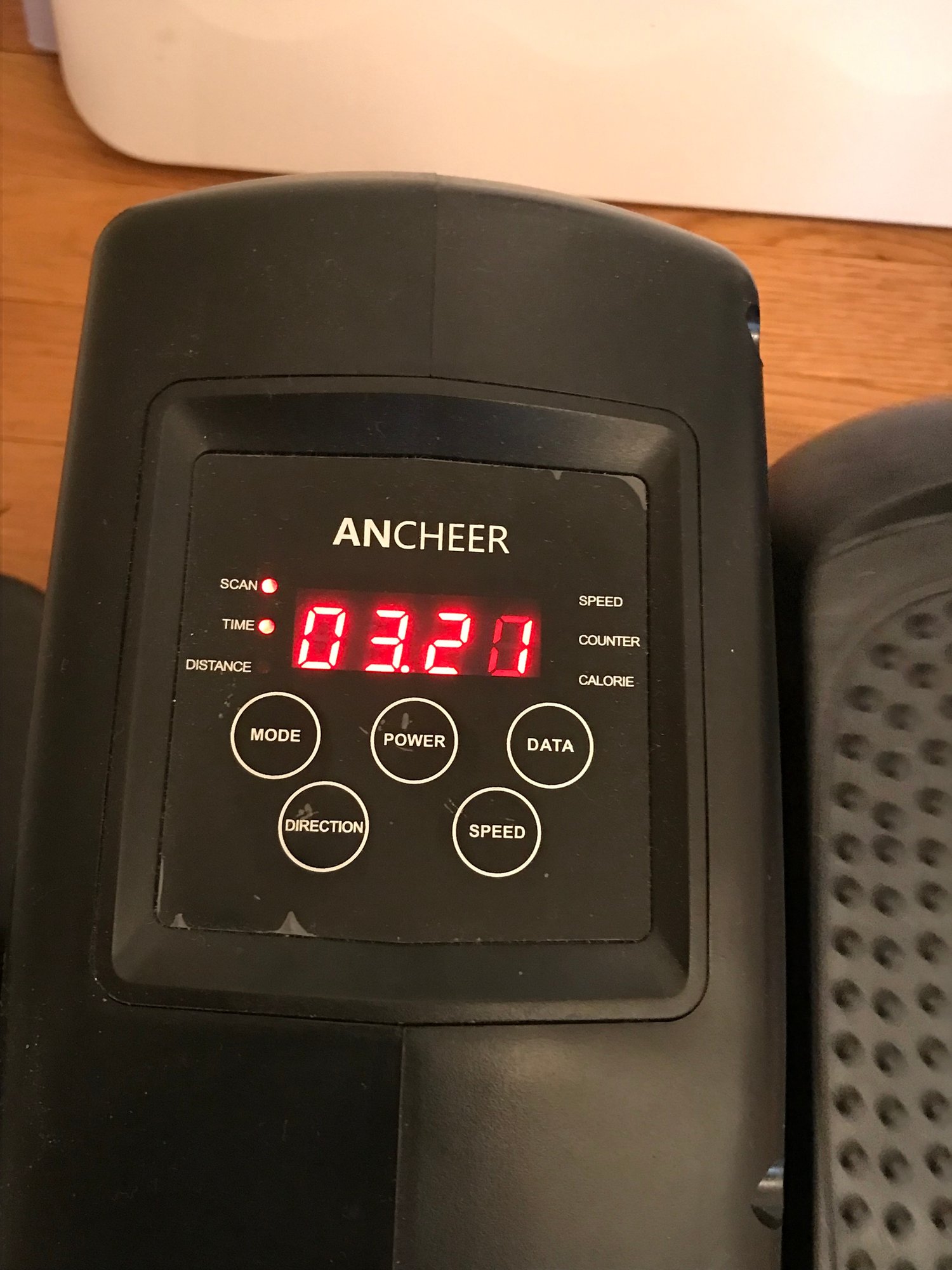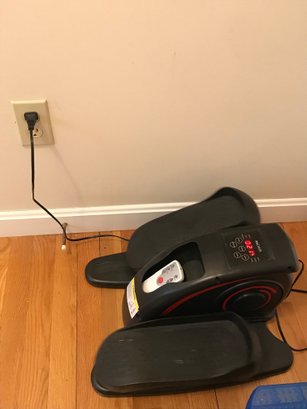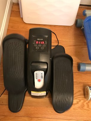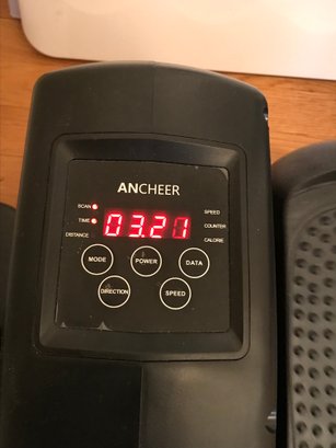 ANCHEER Under-Desk Elliptical: A compact, motorized leg exerciser featuring an integrated LCD monitor and remote control. Designed for seated use to improve circulation and mobility. Remote was not working upon photographing.