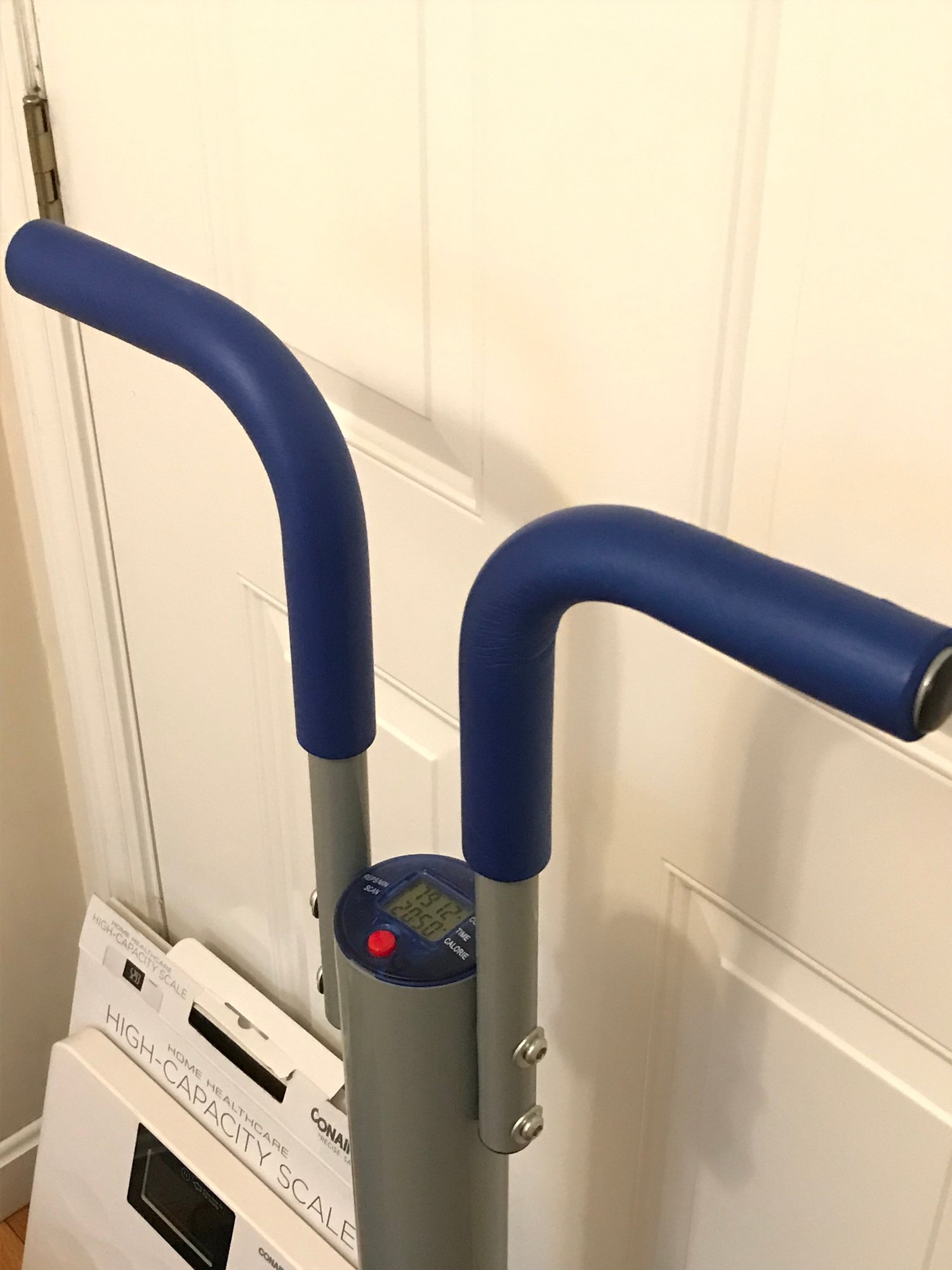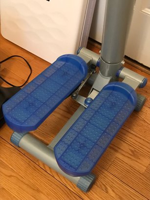 Vertical Stepper: A manual cardio machine with high-handle bars for stability. Features textured blue footplates and a digital fitness tracker (time, count, and calories).