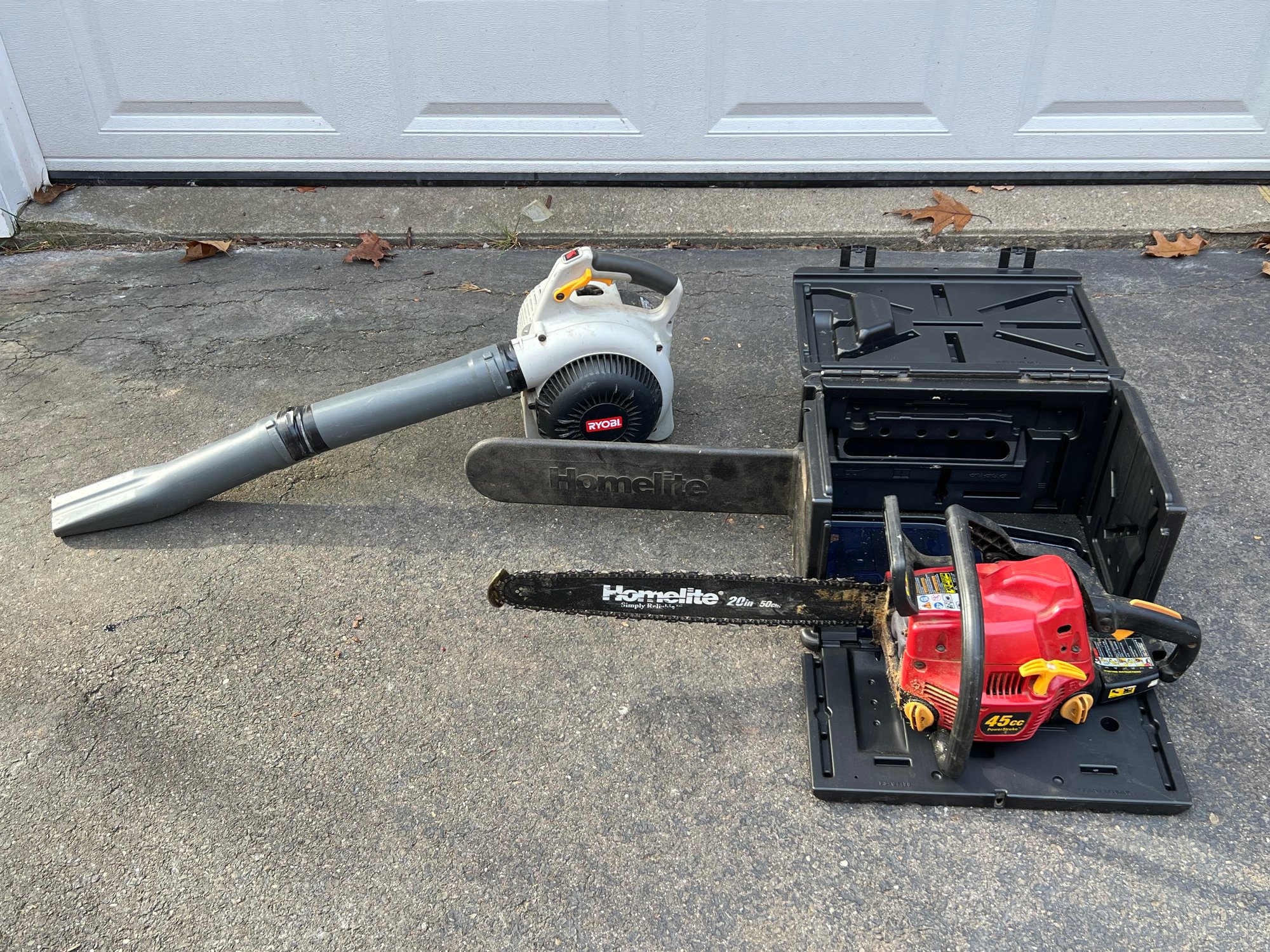 Chainsaw starts and runs, but takes a while to get going. Once running it didn't idle and just dies. Blower had no gas in it so I didn't try and start it, but it hasn't been used in a few years. Sold as is.