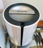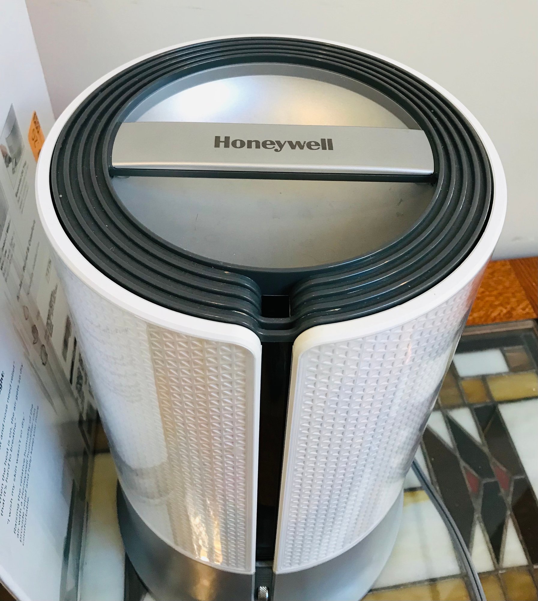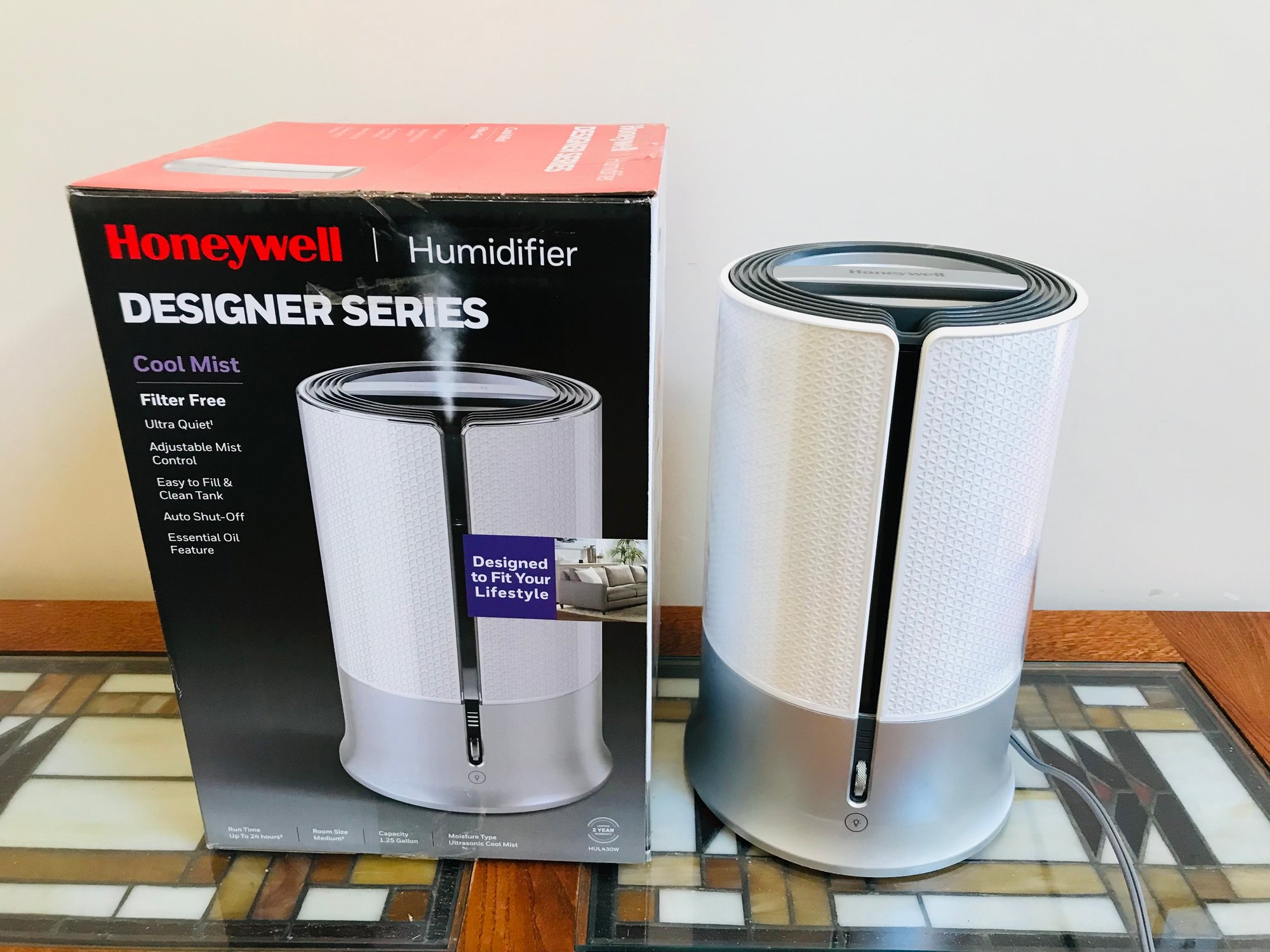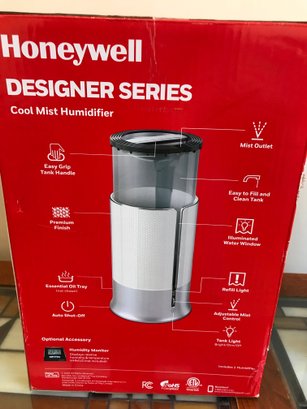 This Honeywell Designer Series Filter-Free Ultrasonic Cool Mist Humidifier (Model HUL430W) combines stylish aesthetics with functional performance. Designed to fit seamlessly into modern home decor, it features a textured white and silver finish.