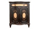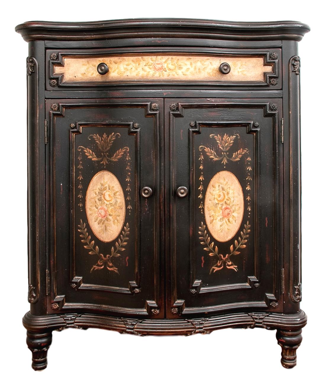 Each door has a center hand painted floral medallion which opens to reveal a shaped adjustable/removable shelf. One large drawer at top center.