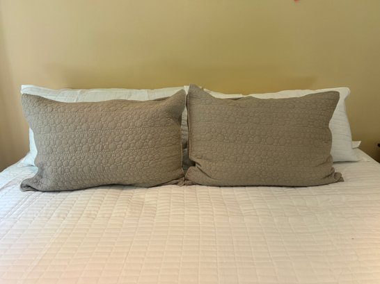 2 coverlets one white and one tan, 2 standard shams, 2 king shams, 2 decorative pillows.