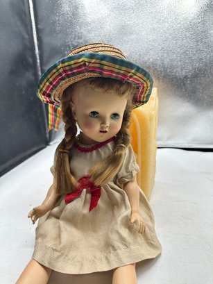arms, legs, and neck move. Green eyes open and close, mouth open with teeth. Says Horsman on neck. All composition. wig glued on.