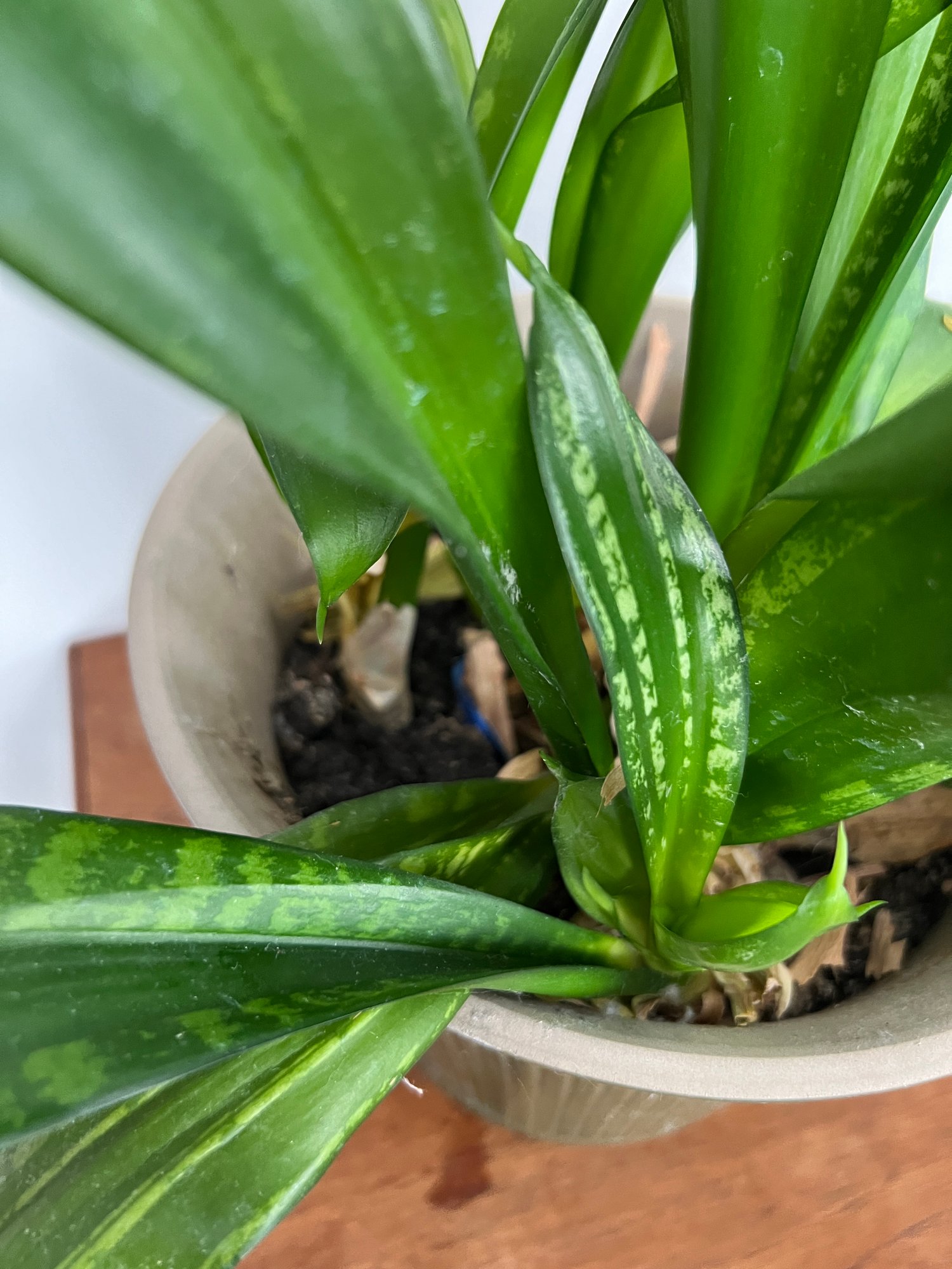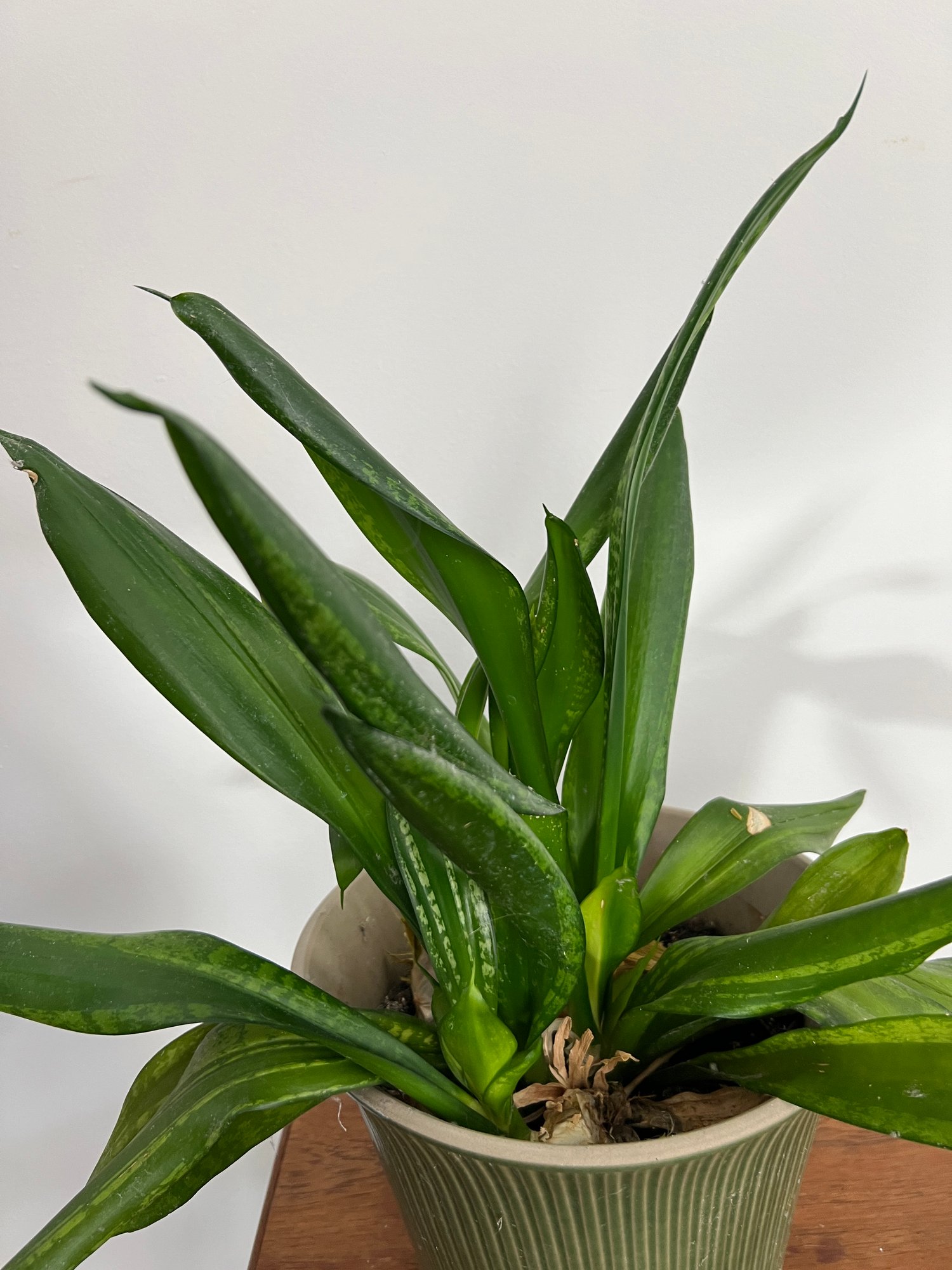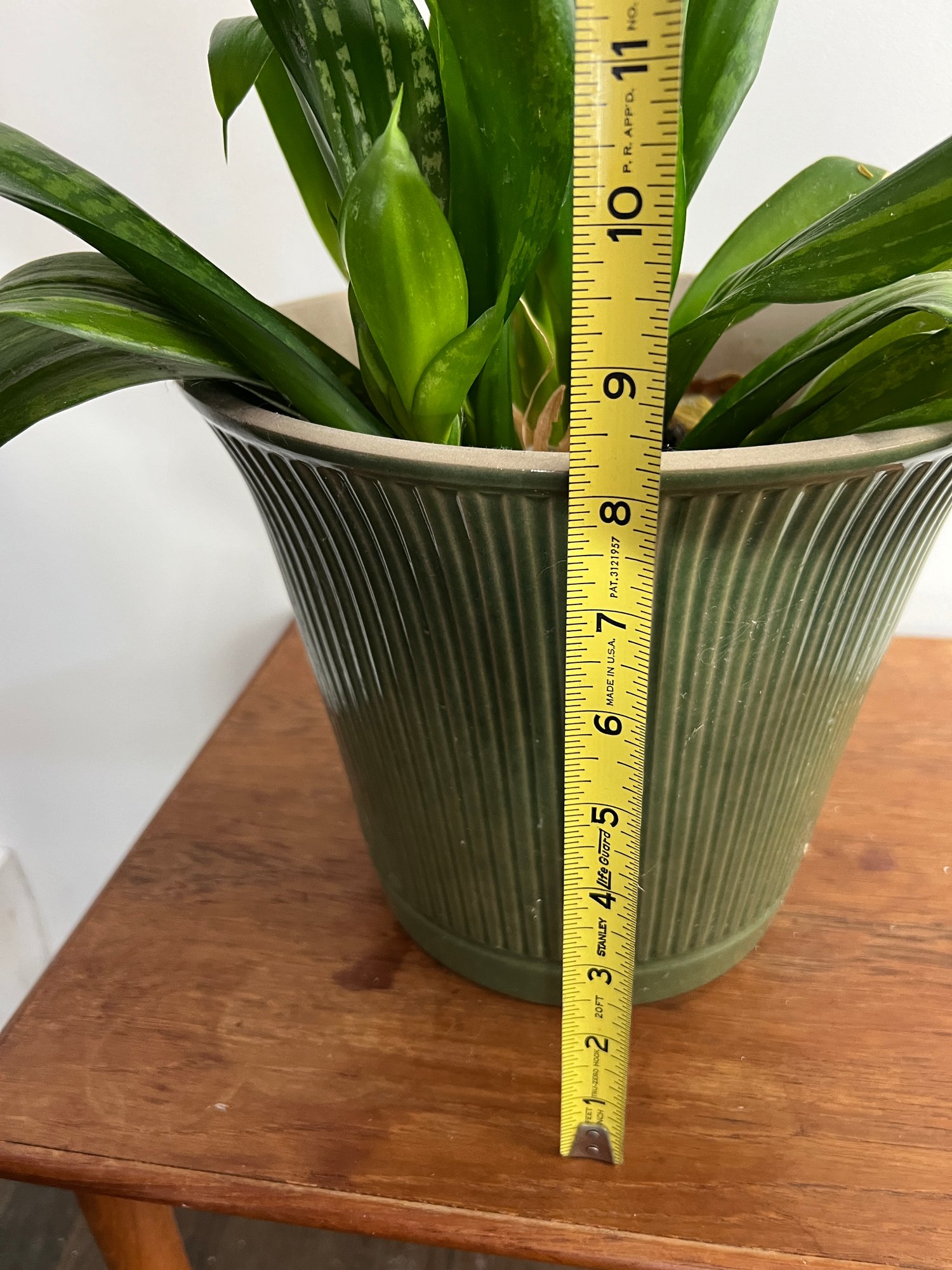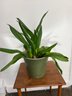 Houseplant specimen (not totally sure what it is possibly a "snake plant") in a green glazed ceramic planter.