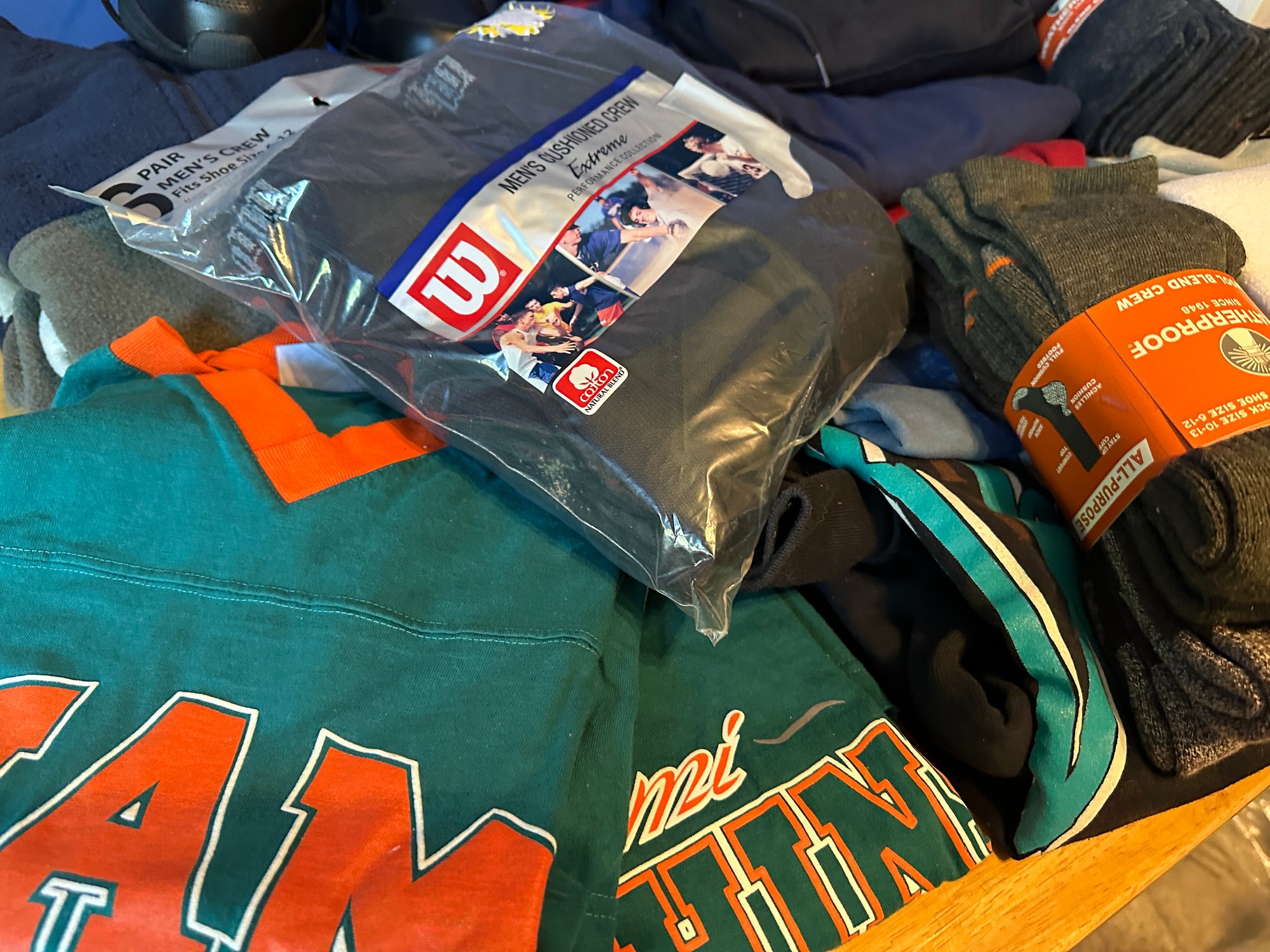 hoodie, tee shirts, miami dolphins shirts, sweatshirts, sweater, flannel shirt, crew socks, box of dress socks, pair New New balnce sneakers size 9W. Clothes are large and extra large