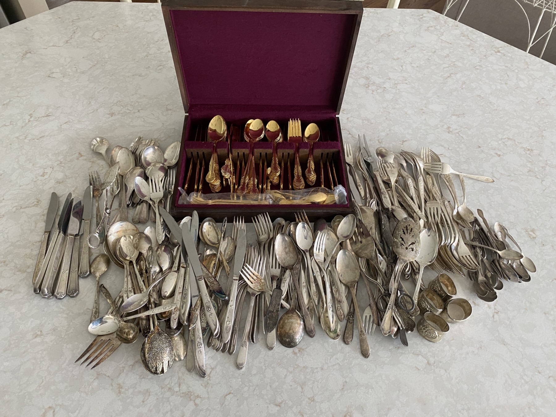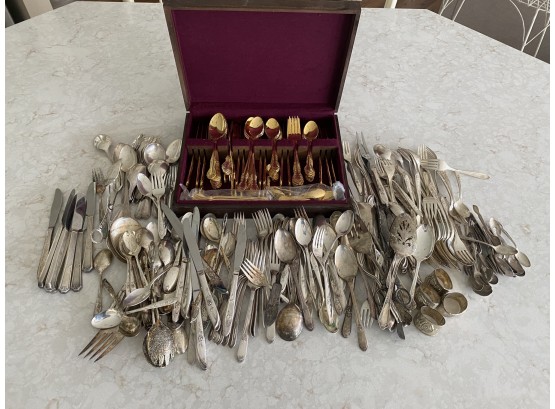 This lot consists of a large group of old silverware. One set in the box. Various pieces that may contain another set as well. See photos for more details.