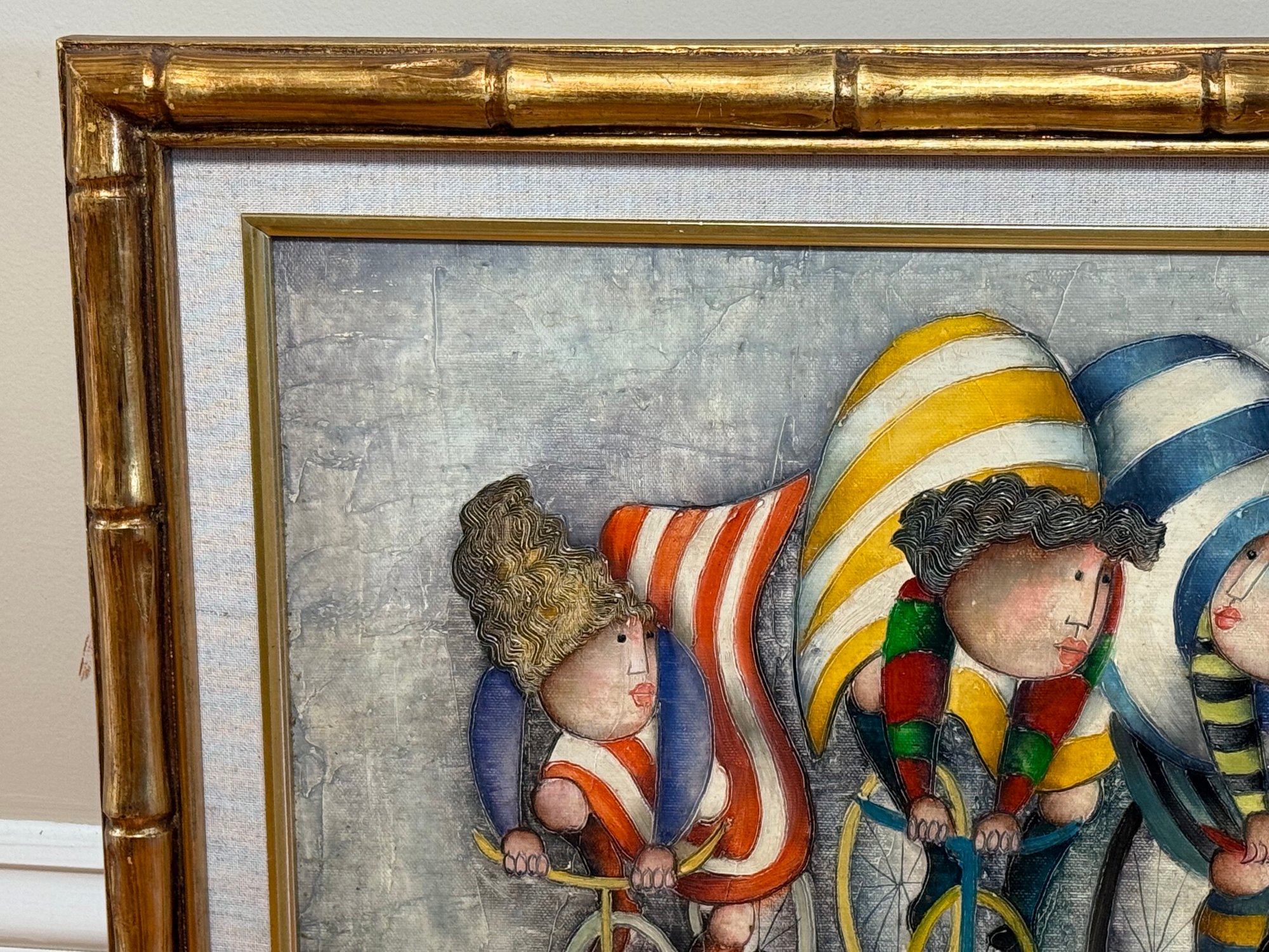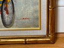 This beautiful painting by J Roybal features a stunning portrayal of cyclists in motion. His signature and style and all of the attention to detail really brings this oil painting to life. Signed by artist lower right hand corner. Pretty bamboo style gold tone frame.