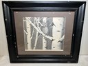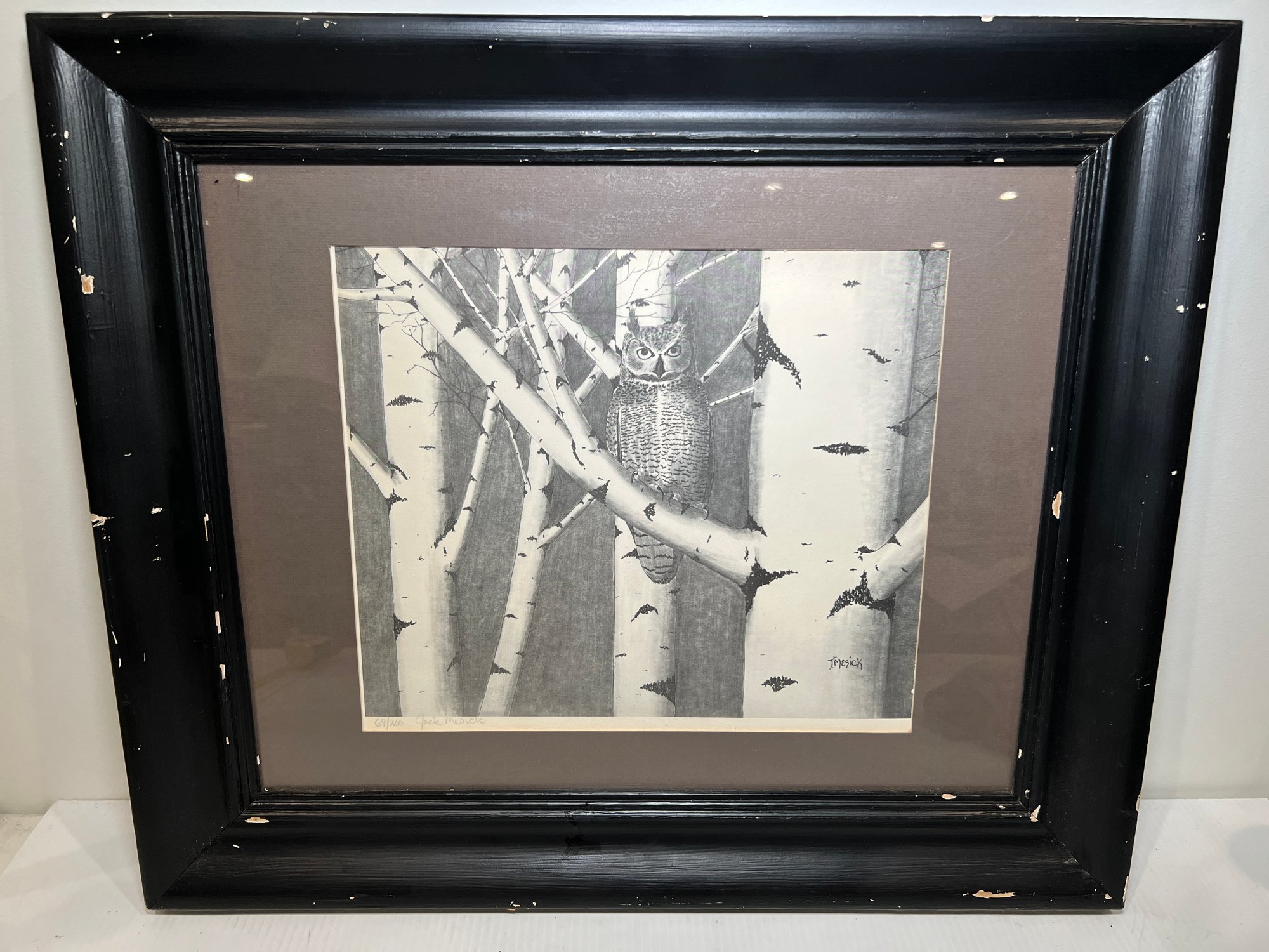 Mesmerizing framed print of a nature inspired illustration by Jack Mesick depicting a great horned owl camouflaged among white birch trees.