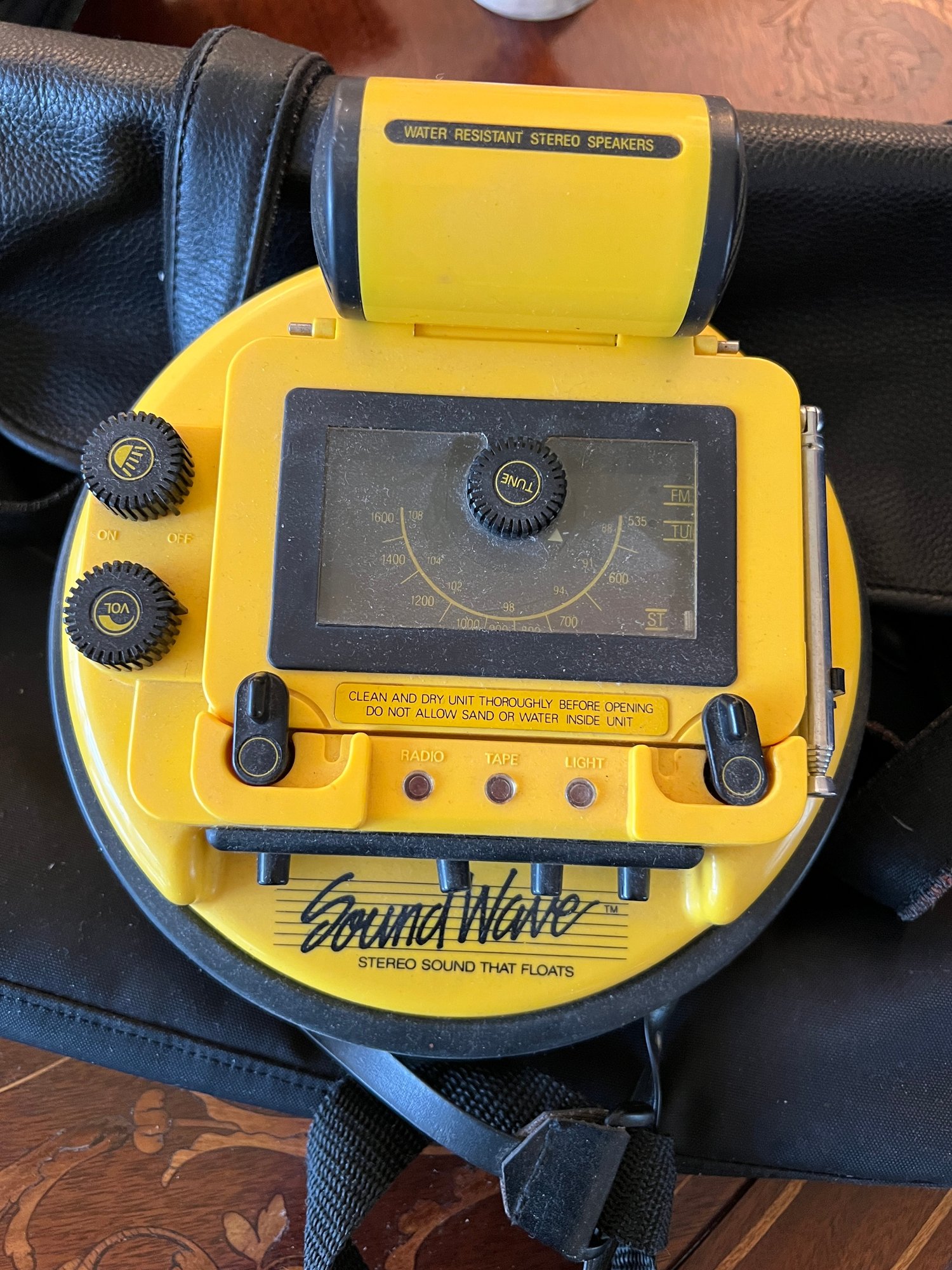 It is a vintage, bright yellow, portable stereo designed for outdoor use.