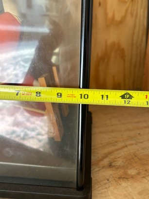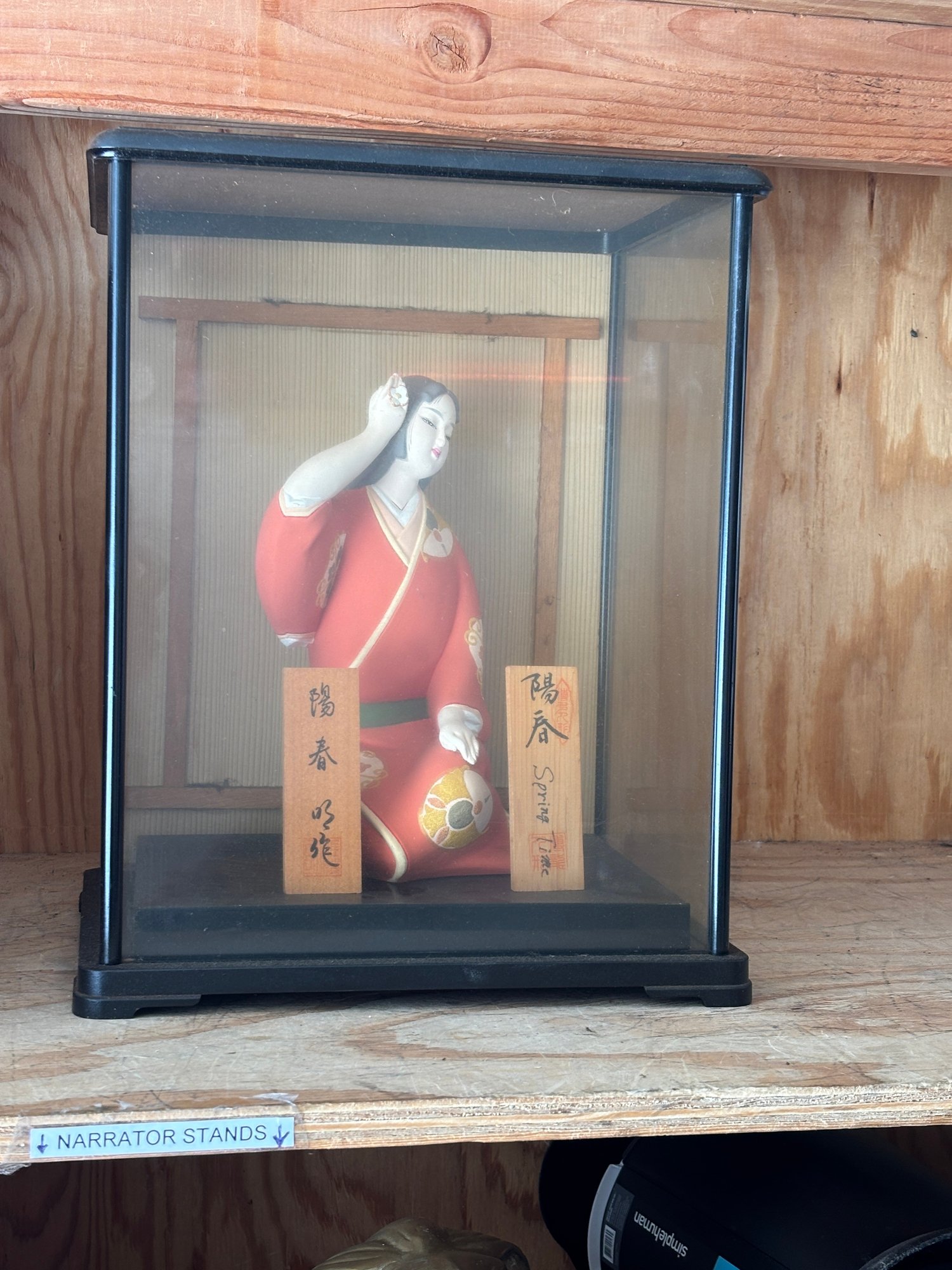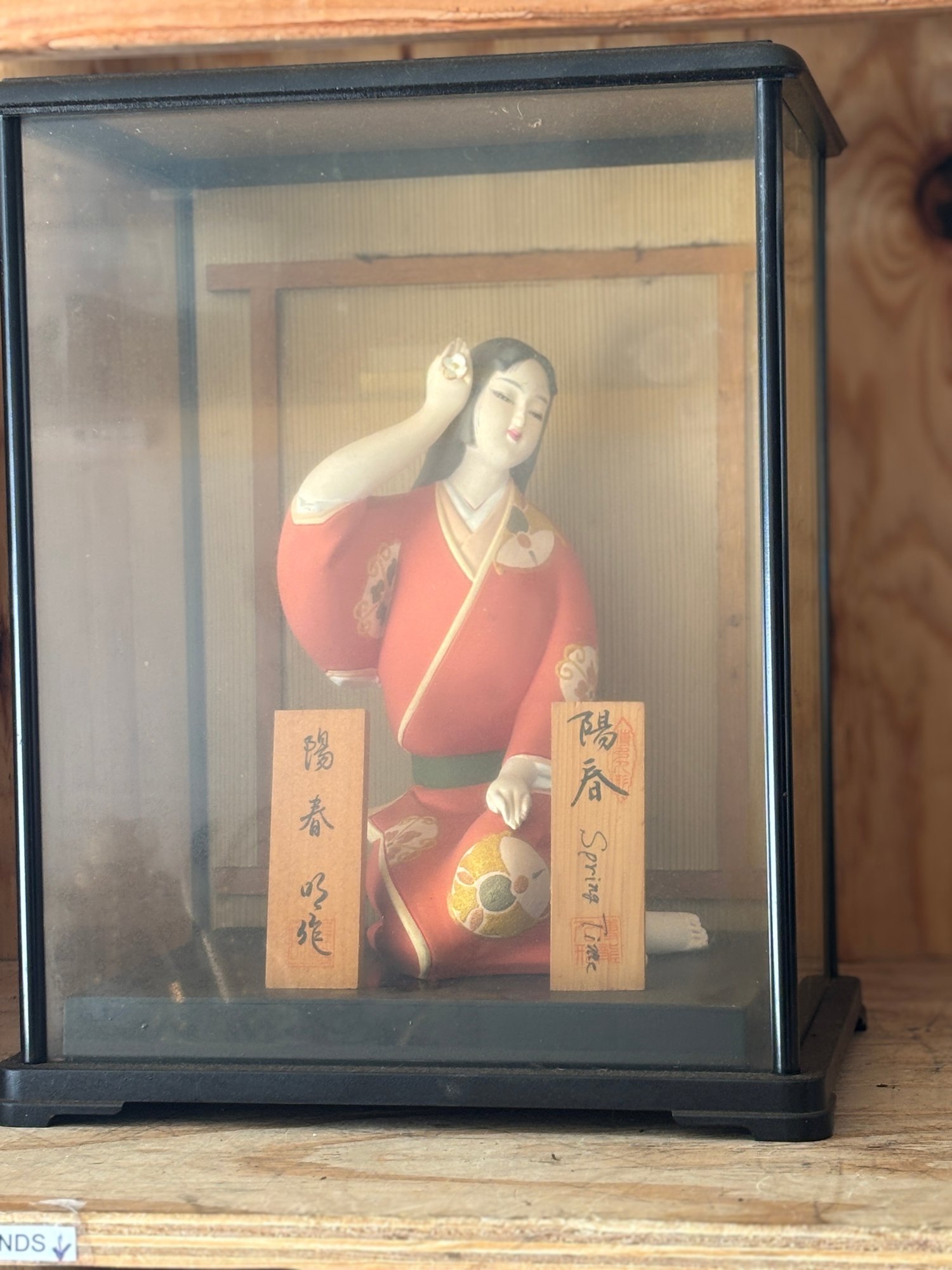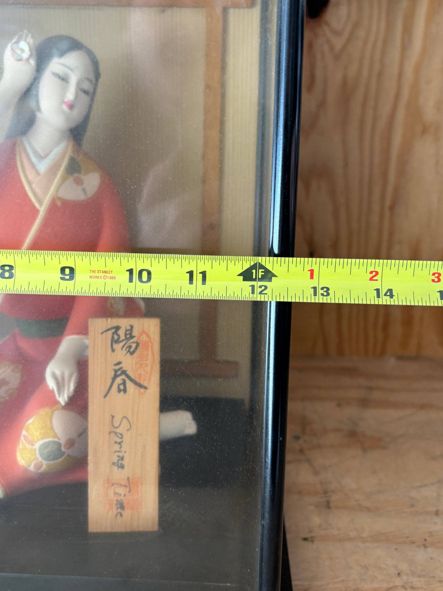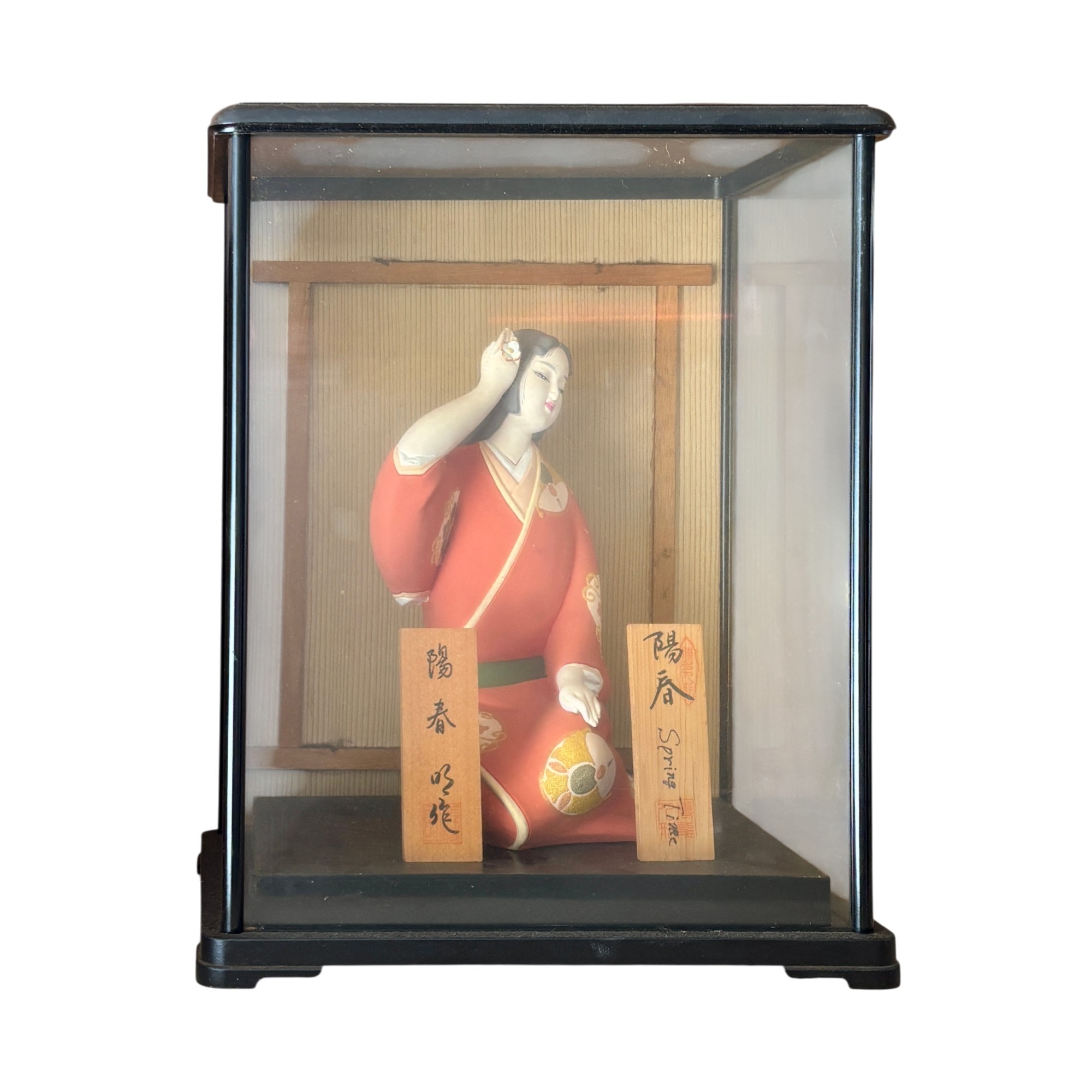 Elegant Japanese doll presented in a protective display case, featuring a beautifully detailed figure dressed in a flowing red kimono with decorative motifs and serene expression. The piece includes its original wooden presentation plaques and box, adding to its collectible appeal. A graceful cultural display object that brings warmth, tradition, and refined artistry to shelves, cabinets, or curated vignette displays.