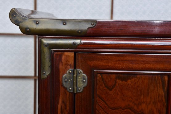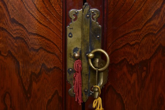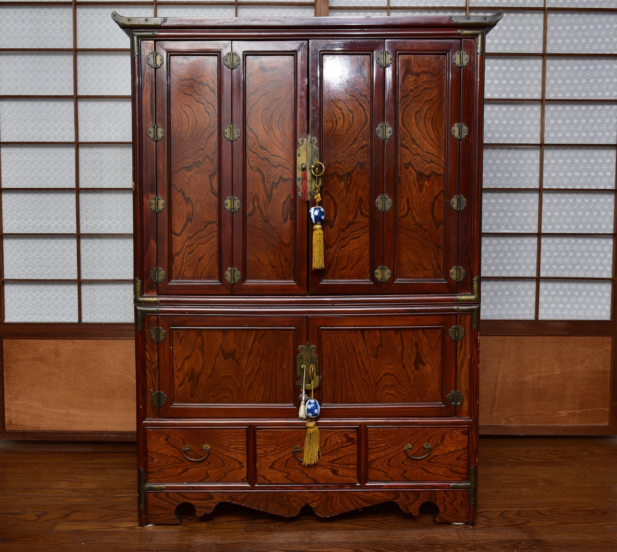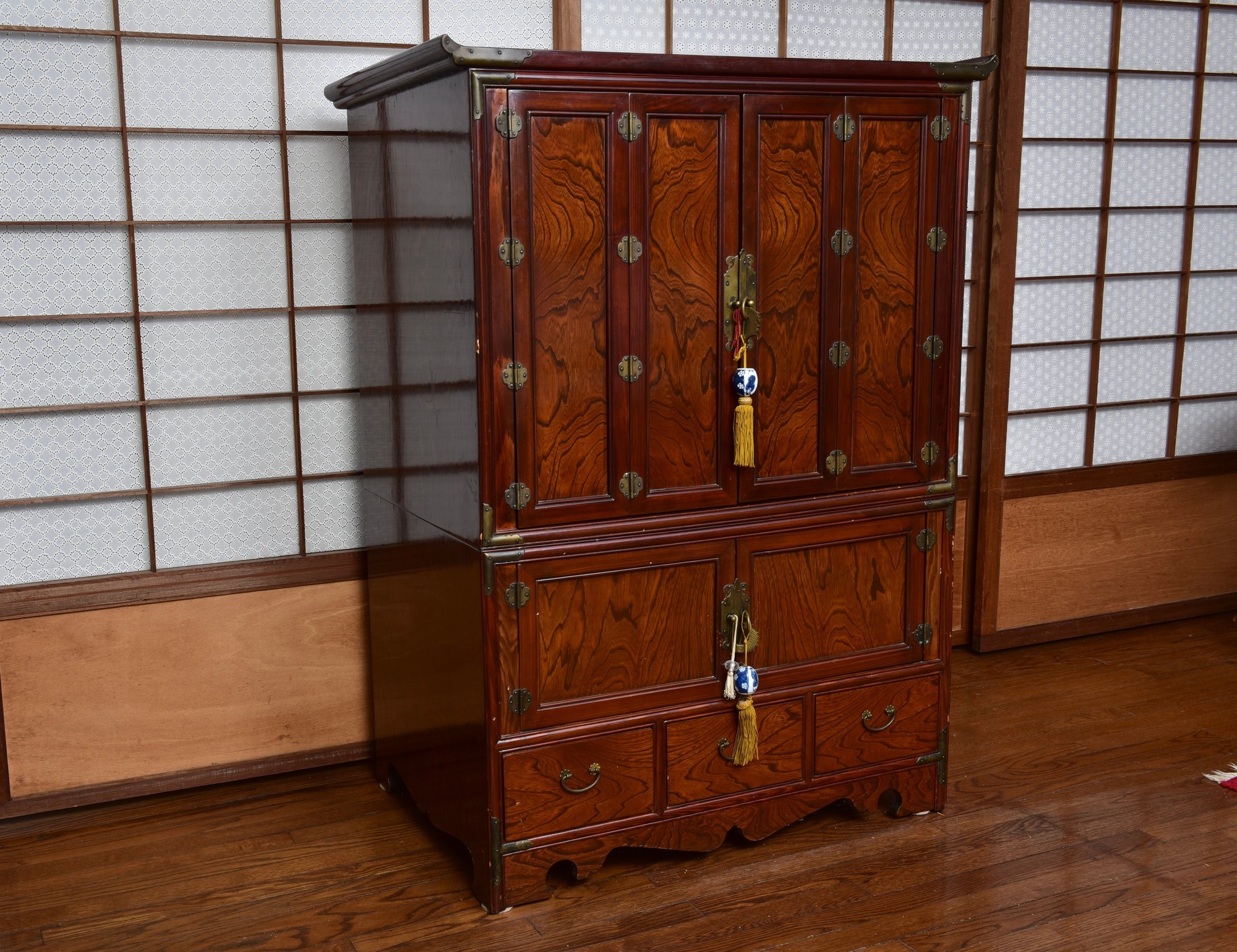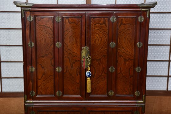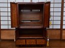 A handsome Japanese tansu-style cabinet featuring richly figured keyaki-grain veneer, traditional iron hardware, and compartmentalized interior with lower drawers. Designed in the mid-20th century for use as an entertainment center. A striking blend of traditional Japanese form and modern functionality.